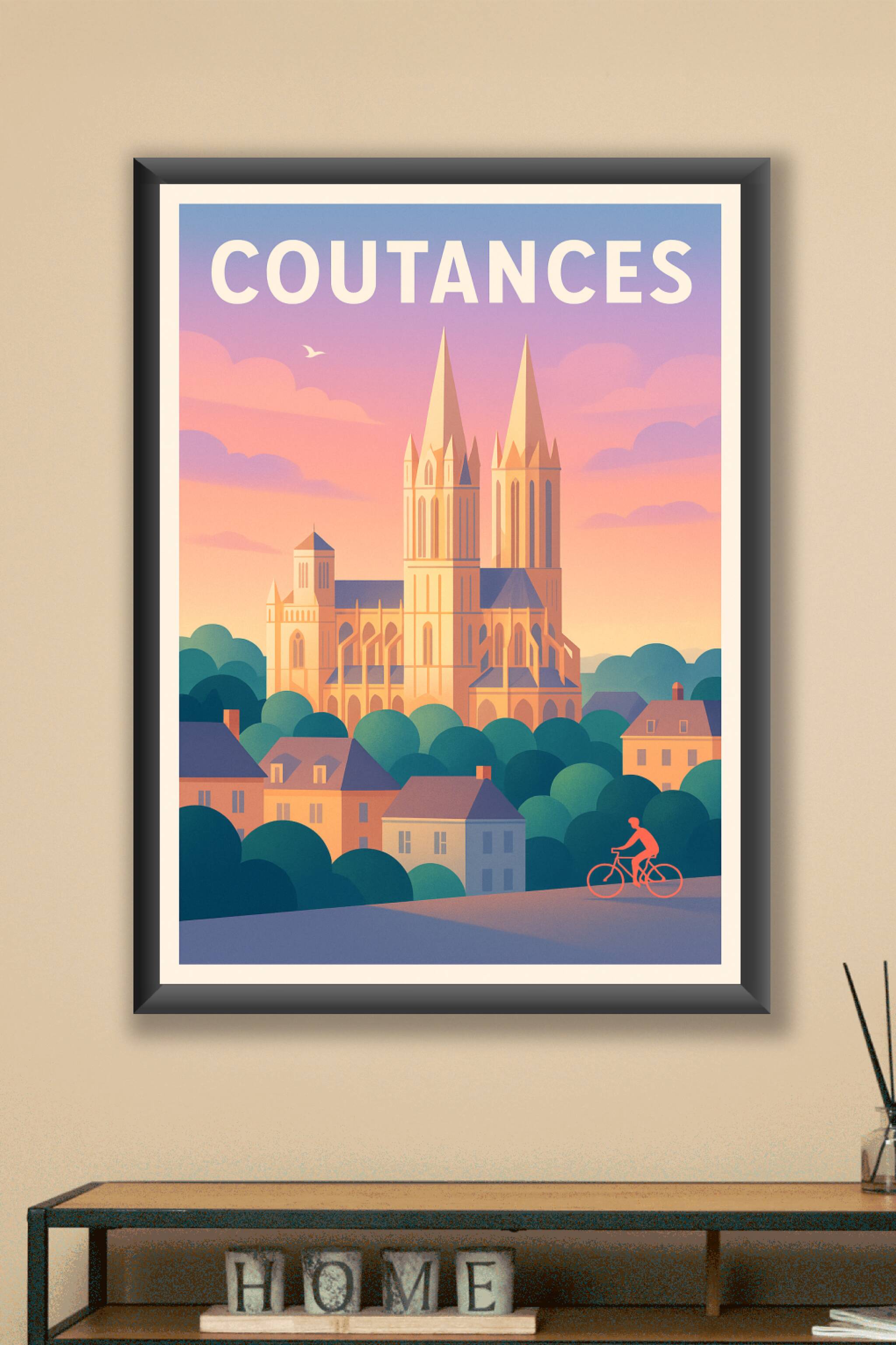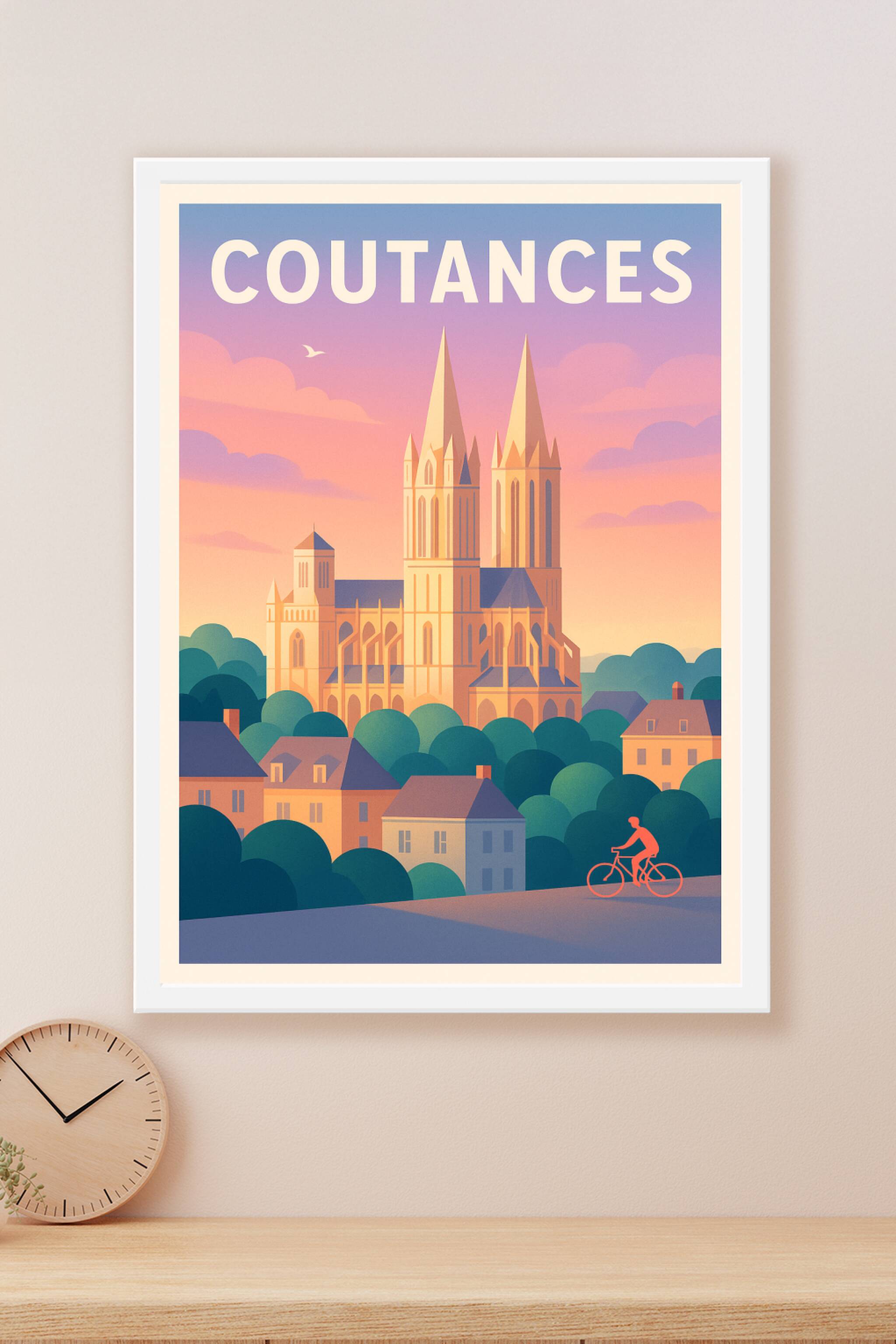 Découvrez la sérénité de Coutances avec cette affiche illustrée mettant en scène la célèbre cathédrale illuminée par les douces couleurs du coucher...