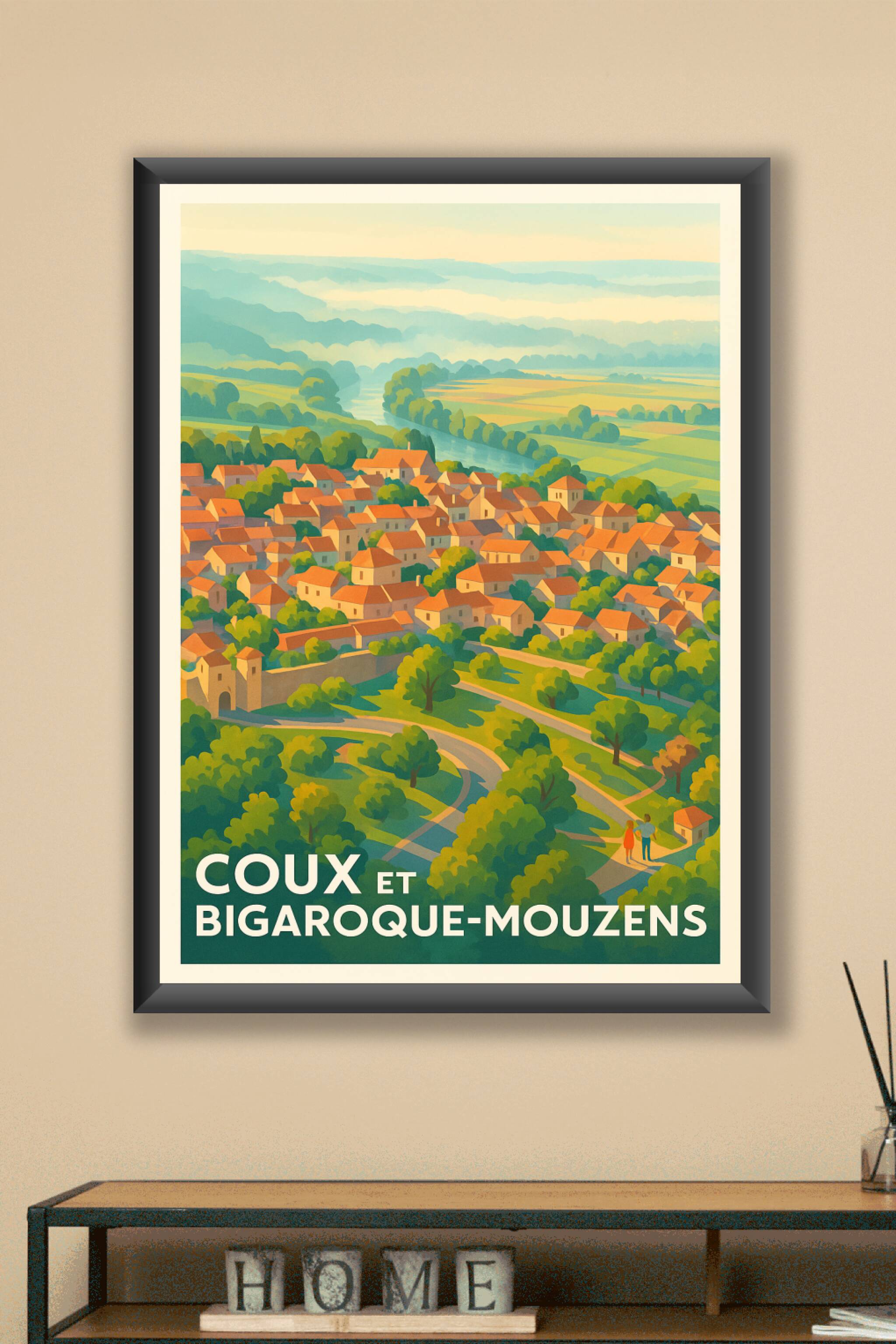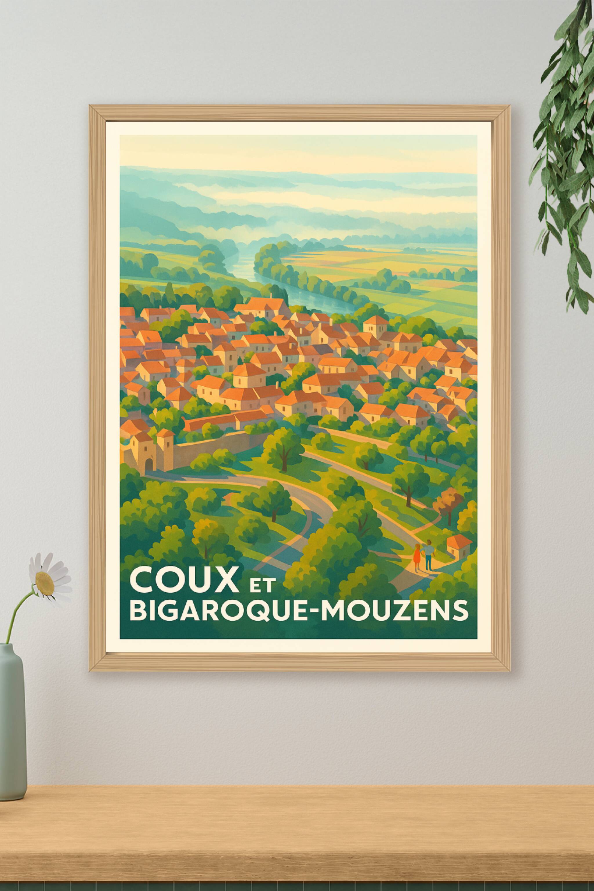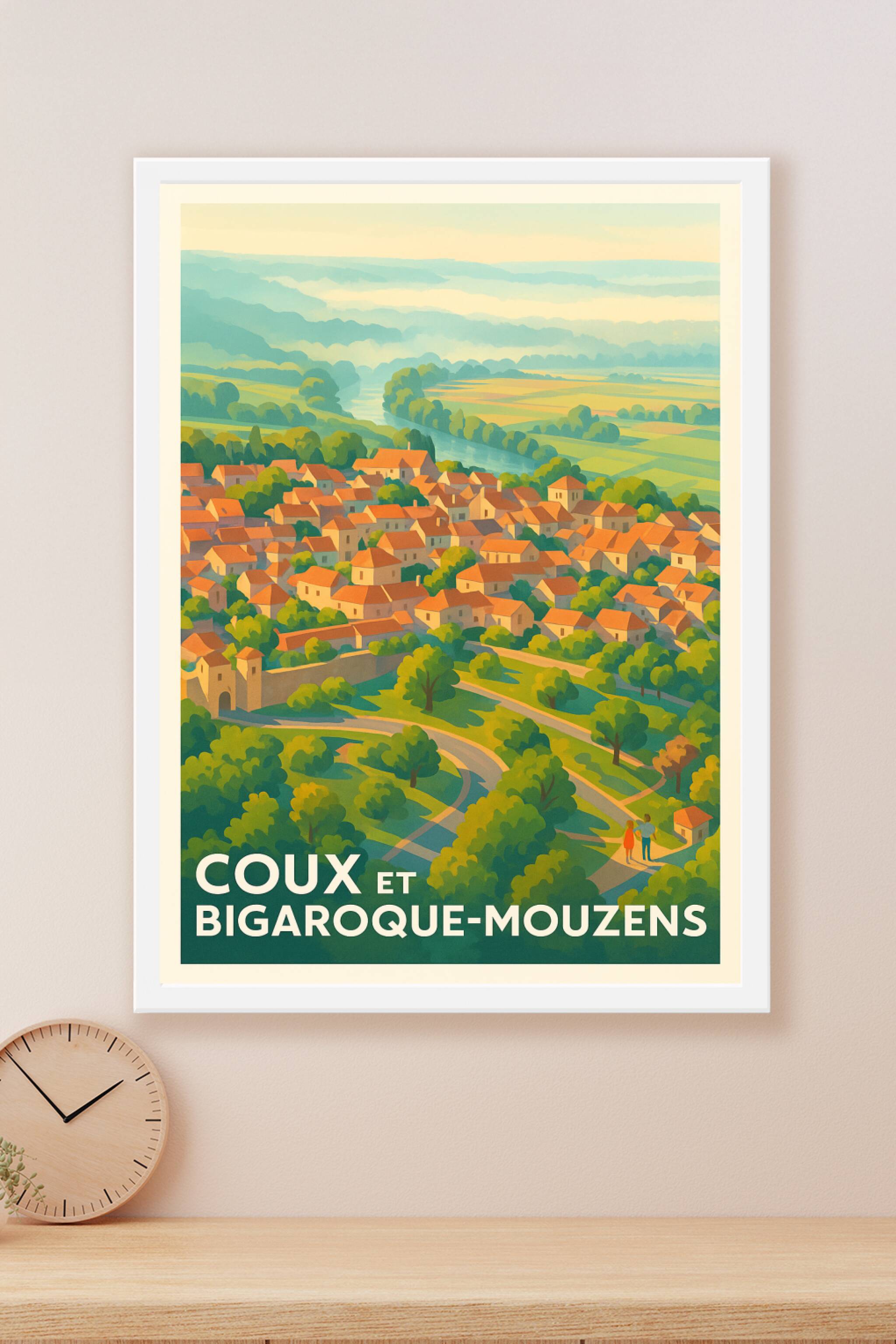 Découvrez la douceur de vivre en Périgord avec cette affiche représentant la paisible commune de Coux et Bigaroque-Mouzens. Ce poster évoque l'harm...
