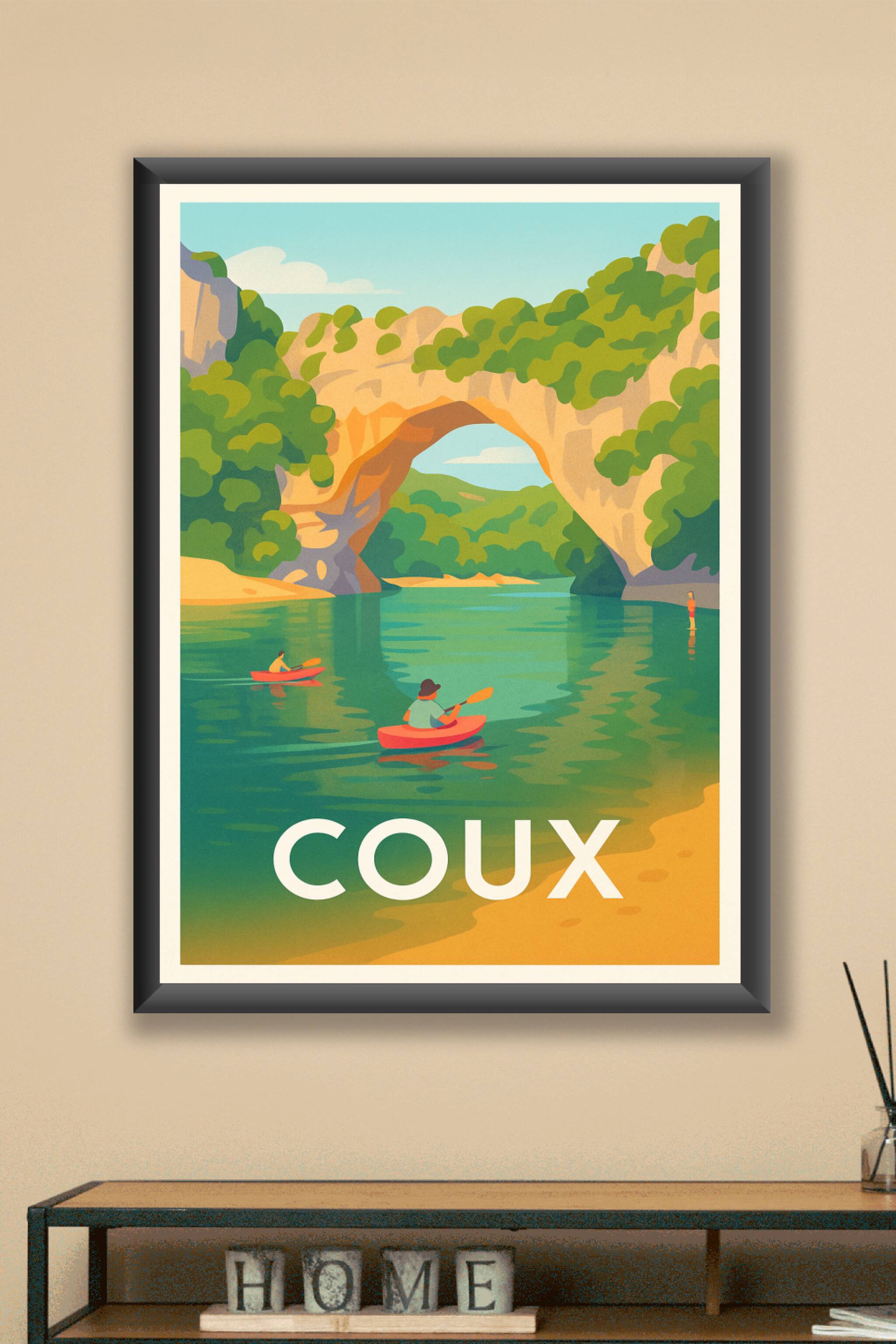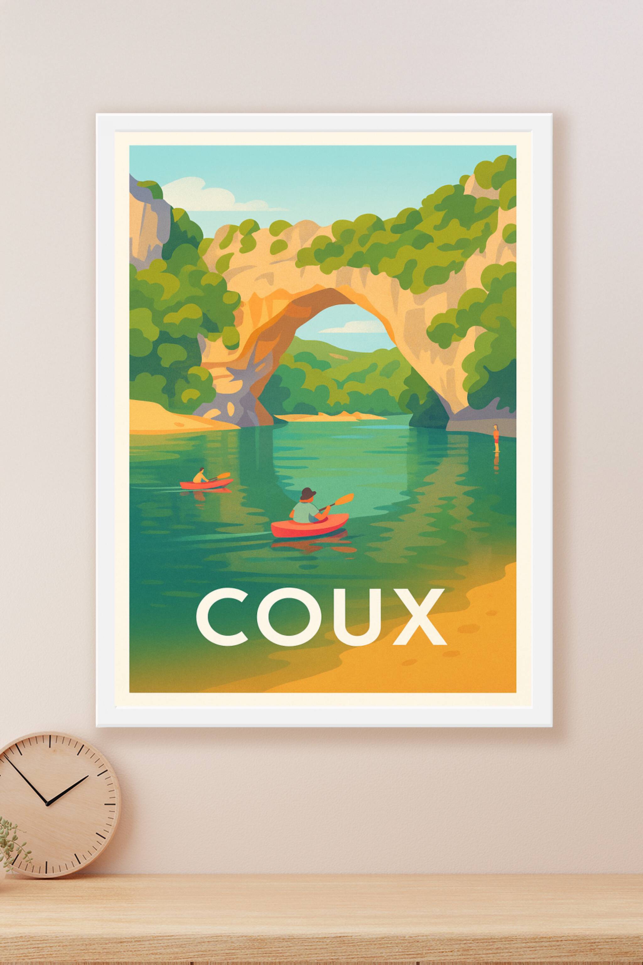 Découvrez la beauté intemporelle de Coux à travers cette affiche vintage illustrant une scène de kayak paisible sous l'arche naturelle emblématique. Ce poster invite à une immersion dans la sérénité et l'aventure en pleine nature.Sublimée par un tirage "Fine Art" sur papier coton 305g, cette affiche offre une qualité d'impression exceptionnelle, fidèle aux couleurs et détails vibrants du paysage. Disponible en formats de A1 à A4, avec ou sans cadre, elle est parfaite pour agrémenter votre intérieur d'une touche artistique et naturelle. Apportez une ambiance rafraîchissante et authentique à votre décoration avec ce poster premium, 100% fabriqué en France.