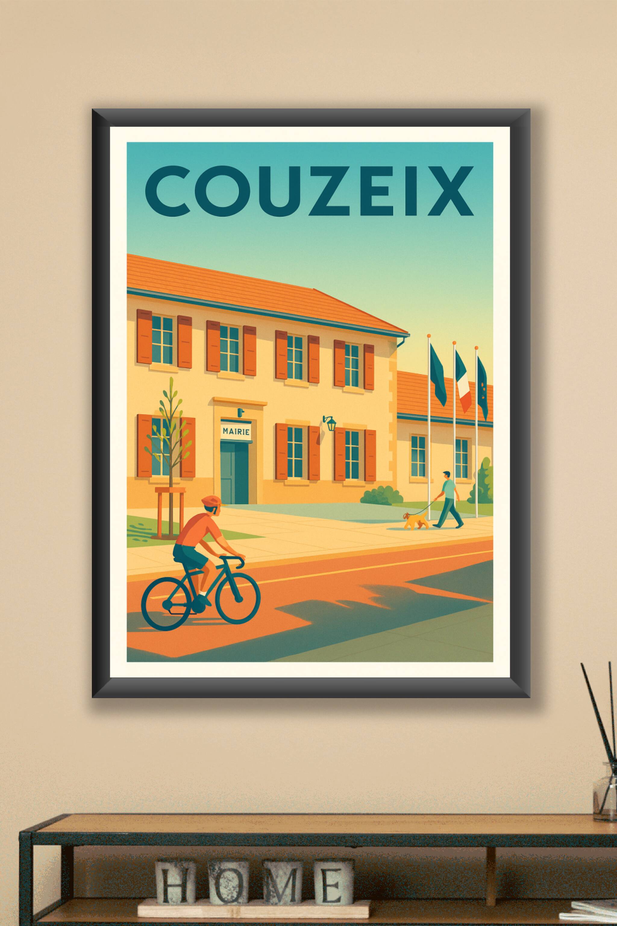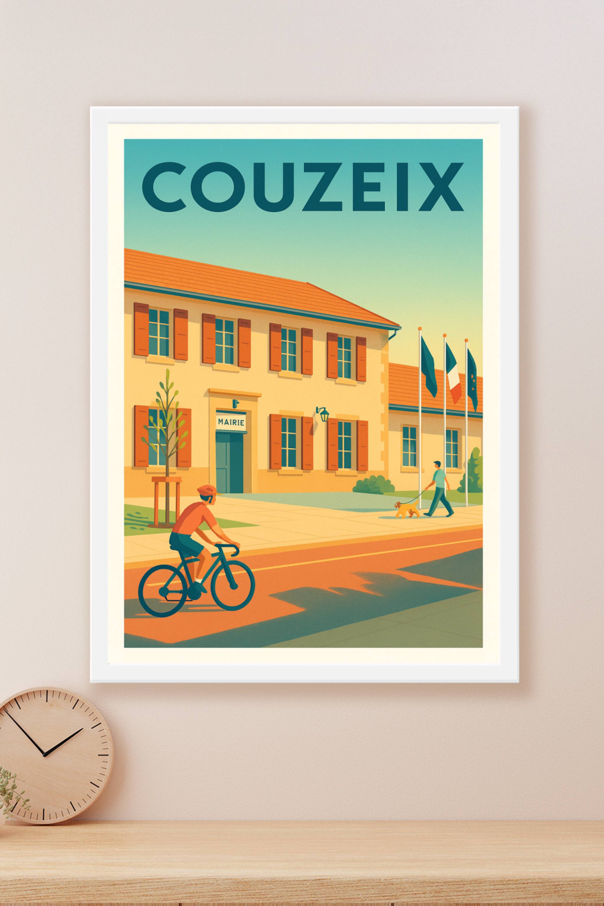 Découvrez l'atmosphère tranquille de Couzeix avec cette affiche illustrée mettant en scène la mairie, un cycliste et un promeneur avec son chien. C...