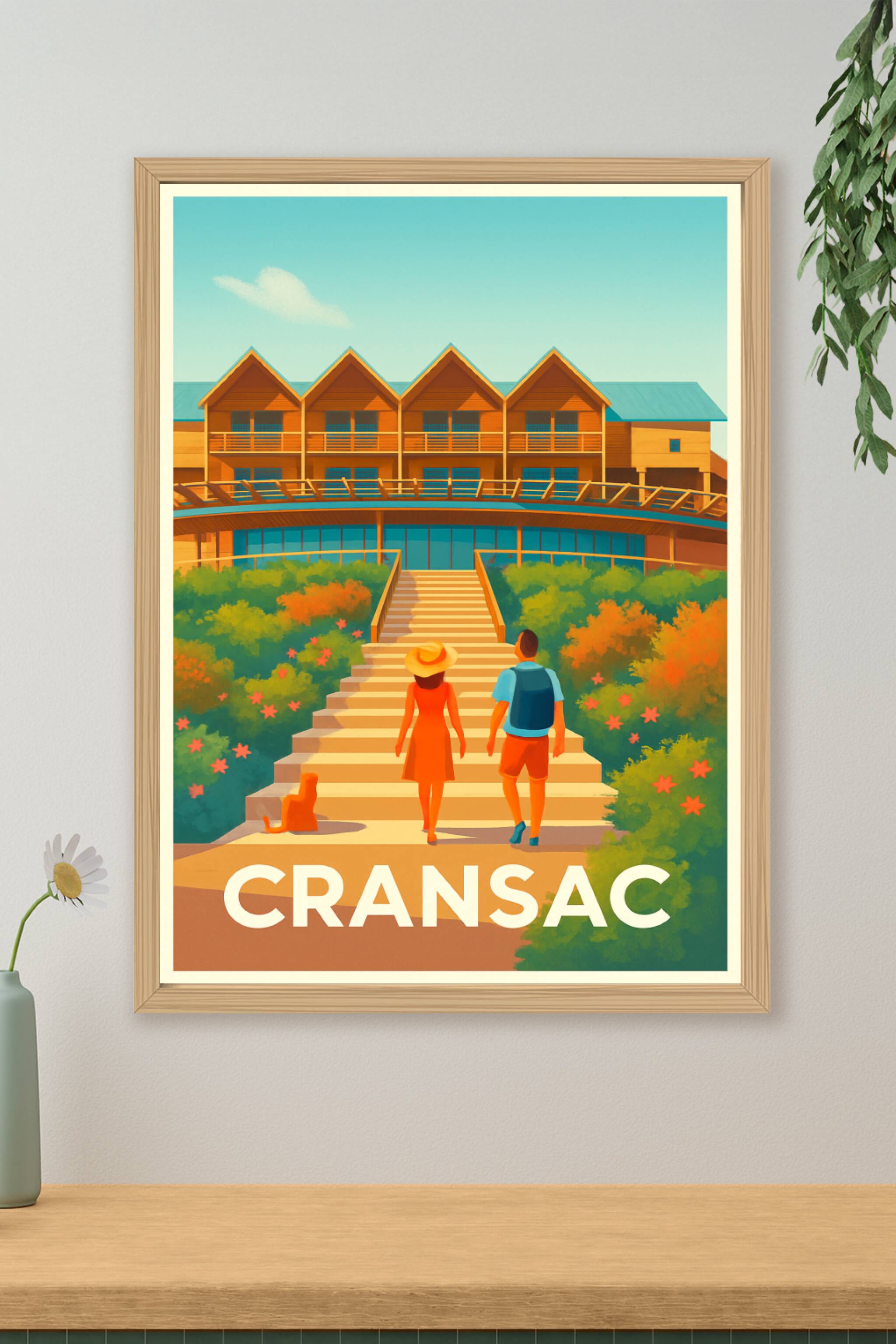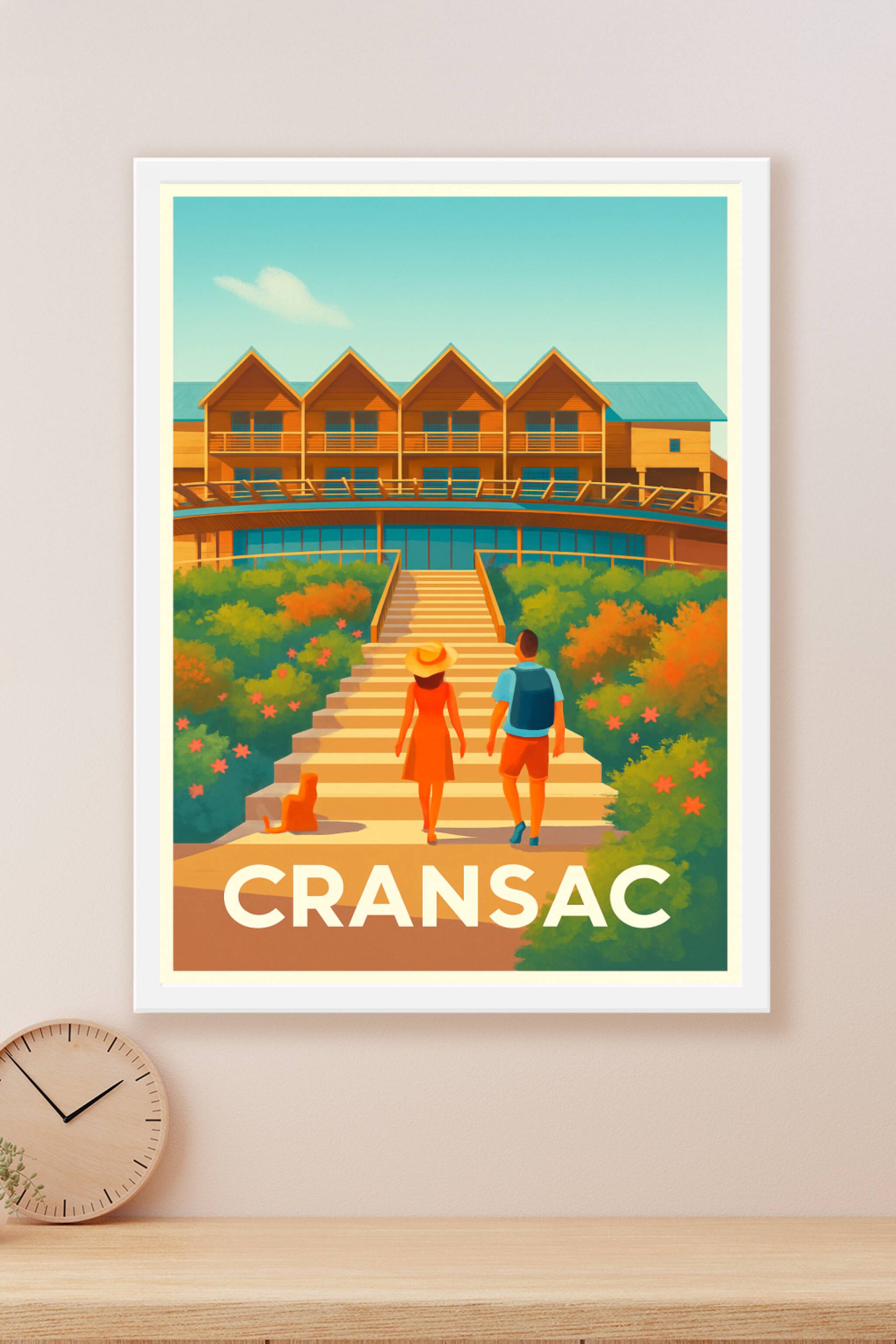 Découvrez l'atmosphère paisible et lumineuse de Cransac avec cette affiche illustrée mettant en scène un couple déambulant vers une architecture ch...
