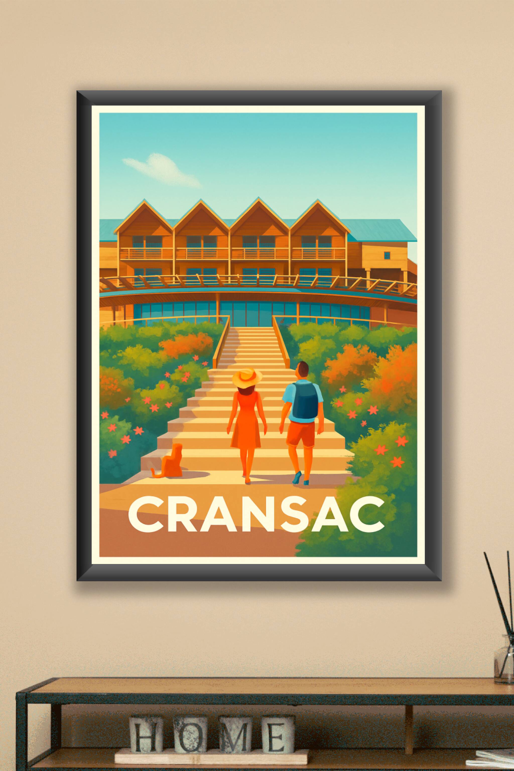 Découvrez l'atmosphère paisible et lumineuse de Cransac avec cette affiche illustrée mettant en scène un couple déambulant vers une architecture chaleureuse au milieu d'un jardin fleuri. Ce poster évoque douceur et sérénité, parfait pour apporter une touche de fraîcheur et de convivialité à votre intérieur. Disponible en tirage "Fine Art" sur papier 305g coton, garantissant une qualité d'impression exceptionnelle et une richesse des couleurs durable. Choisissez votre format préféré de A1 à A4, avec ou sans cadre, pour personnaliser votre décoration ou offrir un souvenir élégant et raffiné de cette charmante destination.