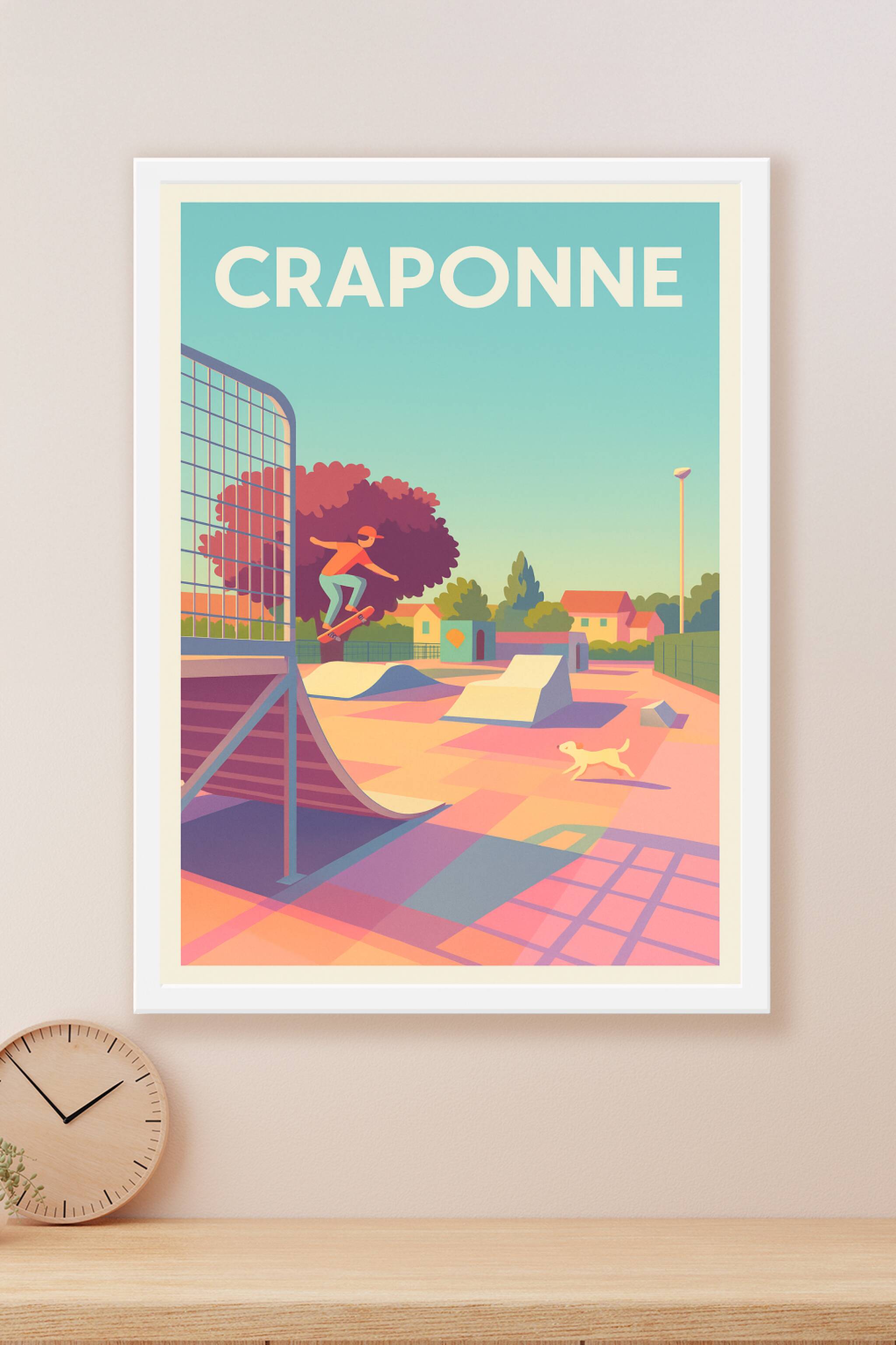 Apportez une touche dynamique et colorée à votre décoration avec ce poster illustré mettant en scène un skatepark en plein air à Craponne, baigné p...