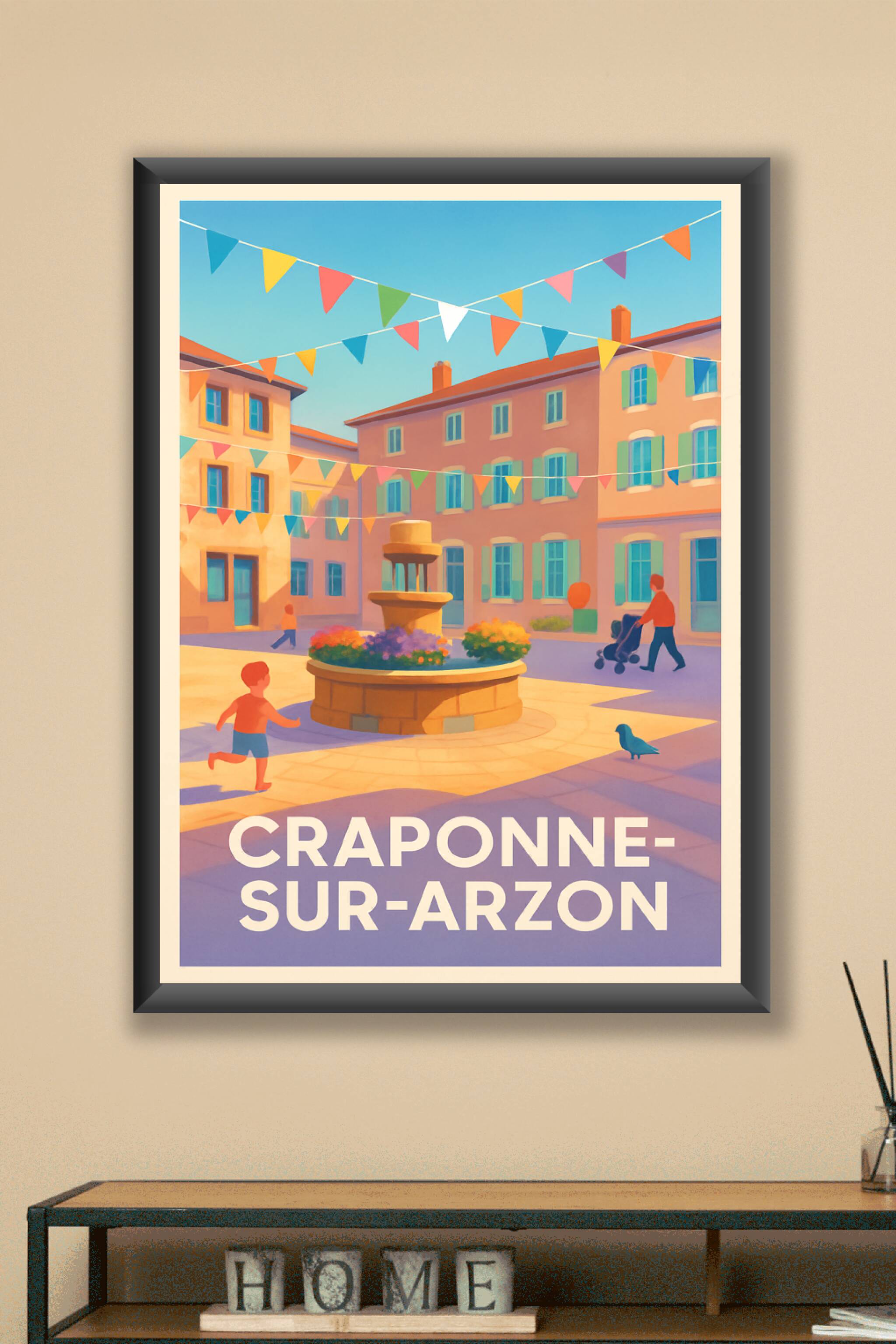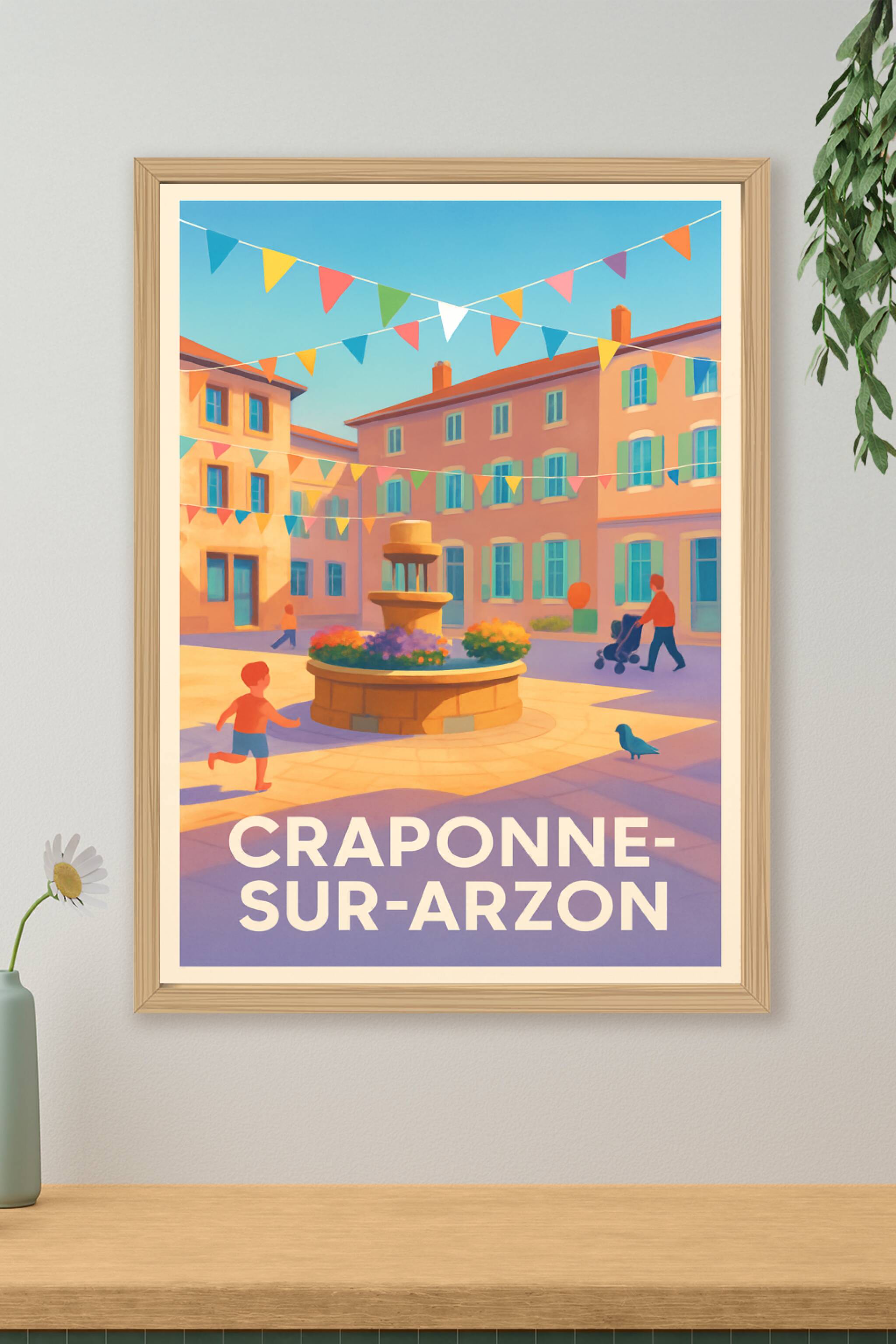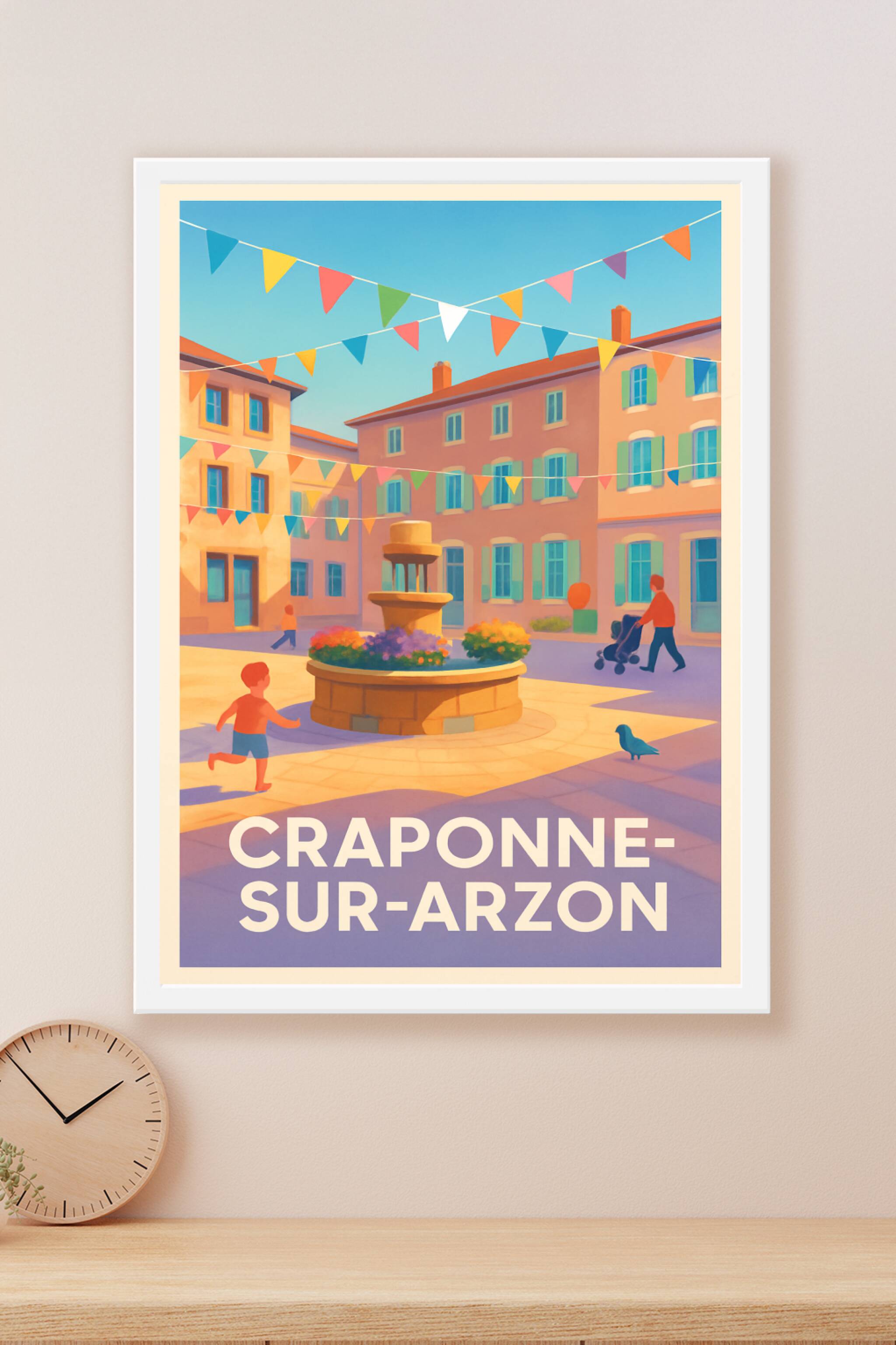 Découvrez l'ambiance chaleureuse et festive de Craponne-sur-Arzon avec cette affiche illustrée aux couleurs douces et lumineuses qui met en scène u...