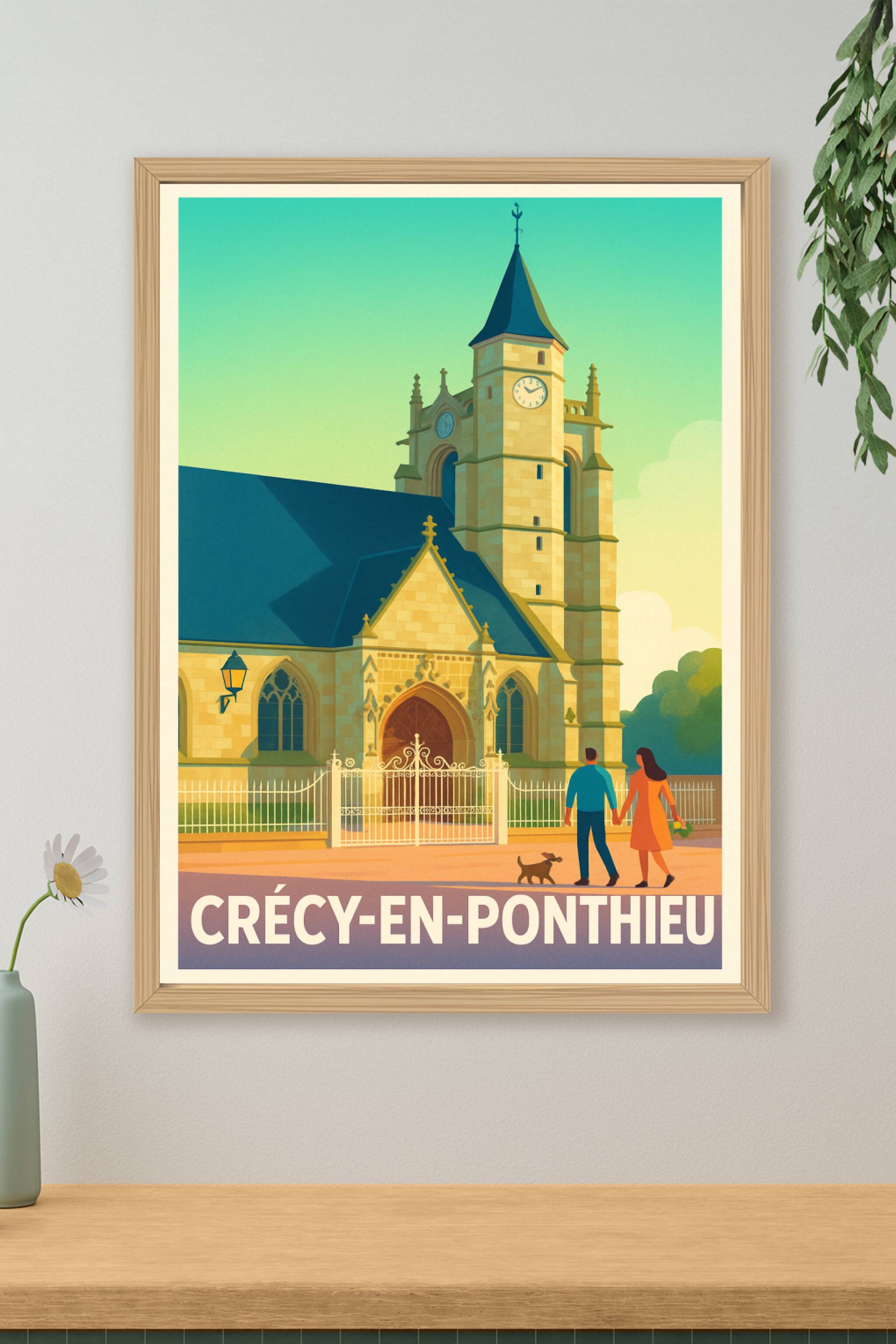 Découvrez l'élégance tranquille de Crécy-en-Ponthieu à travers cette affiche illustrée mettant en scène l'imposante église de la ville baignée par ...