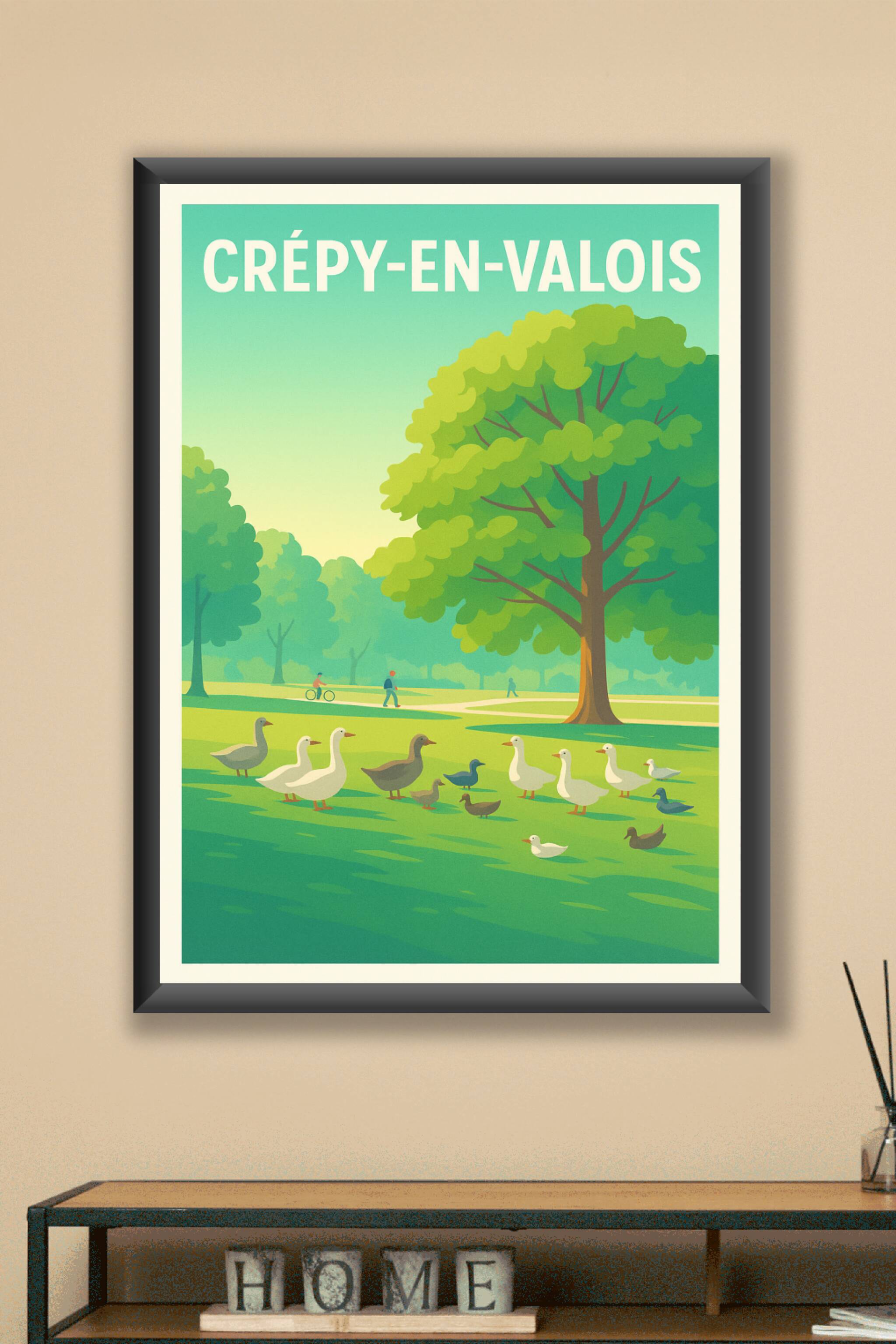 Découvrez la douceur de vivre à Crépy-en-Valois avec cette affiche au style doux et apaisant, illustrant un parc verdoyant où se promènent canards ...