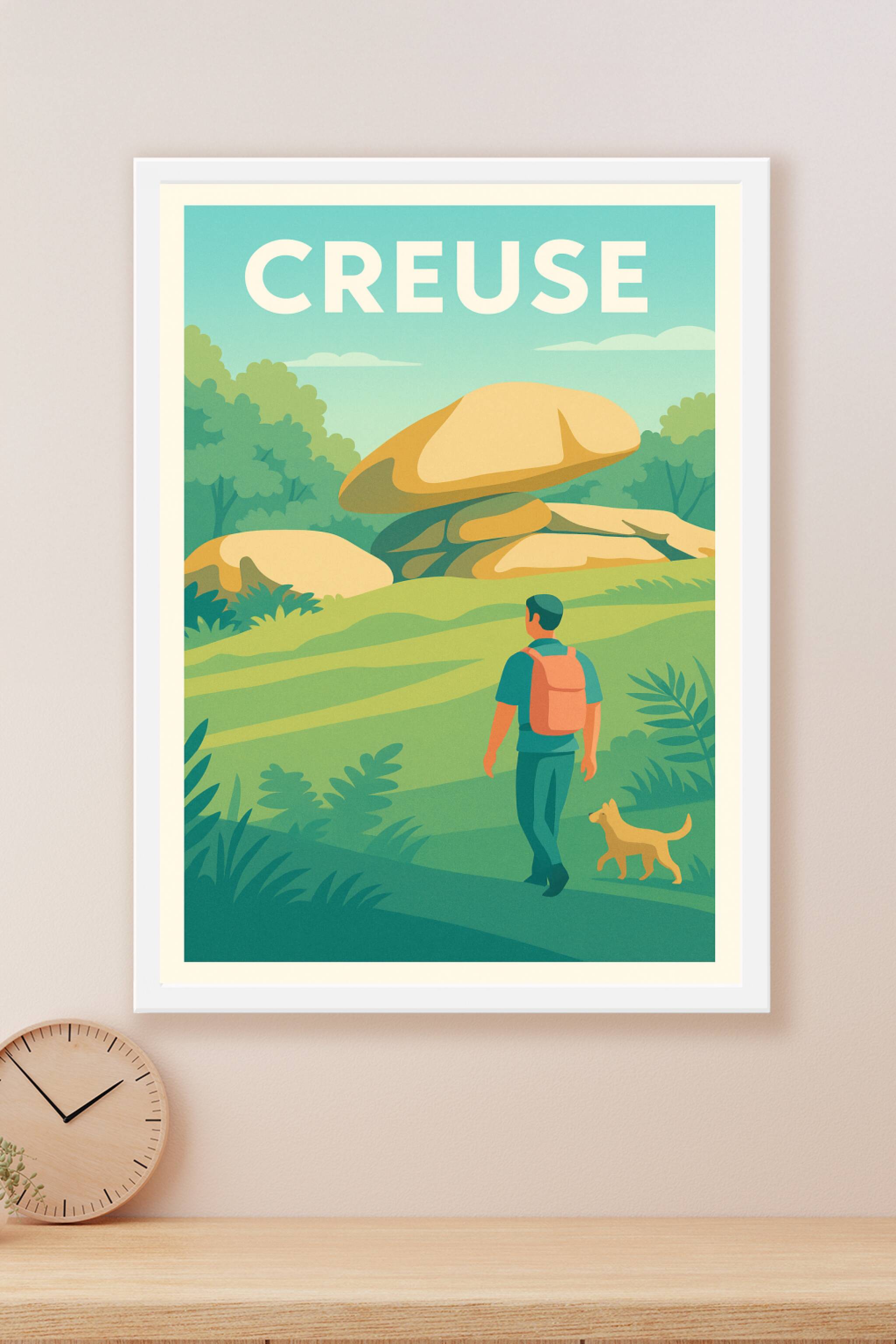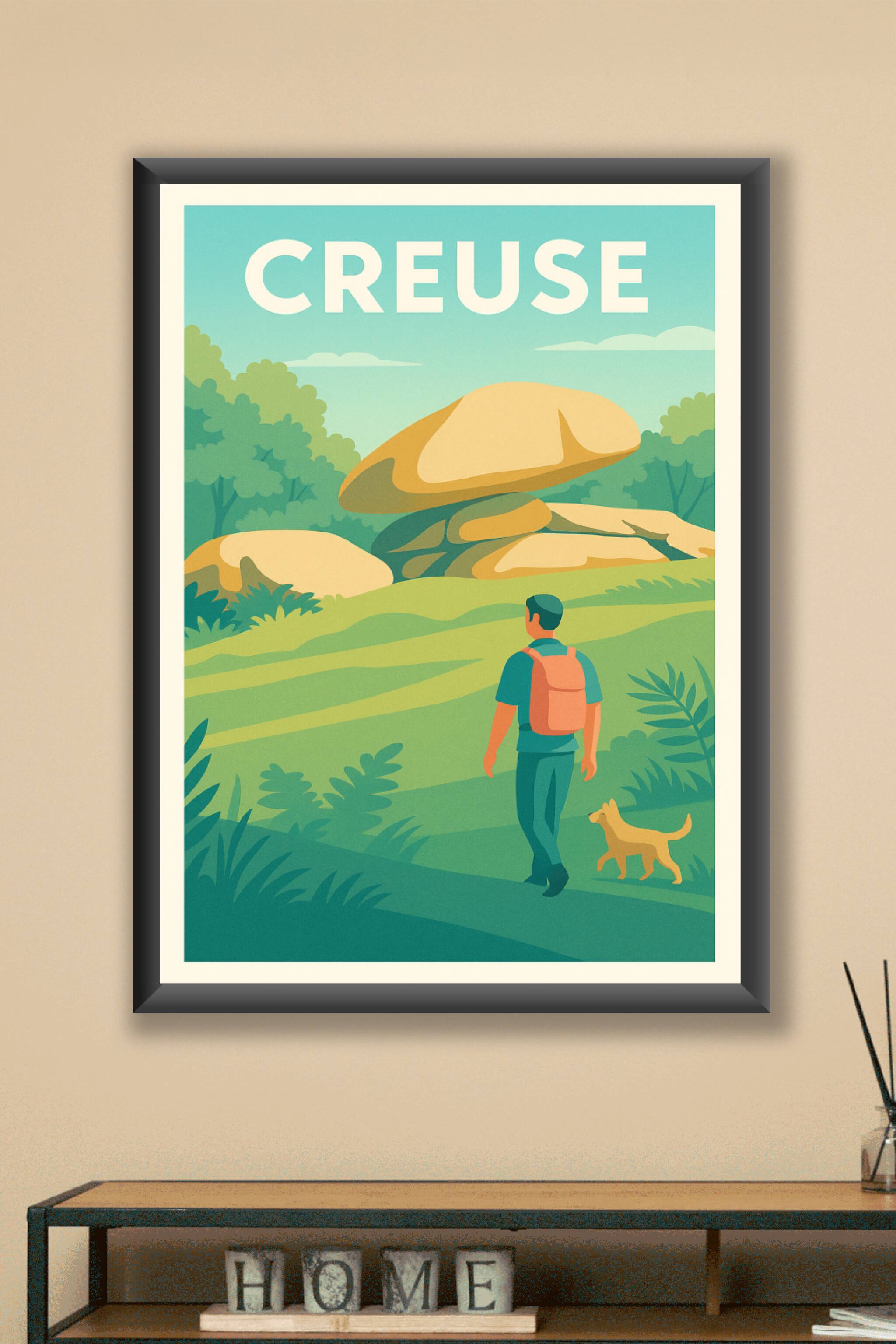 Découvrez la beauté sauvage et authentique de la Creuse avec cette affiche illustrée mettant en scène un randonneur et son chien face aux célèbres ...