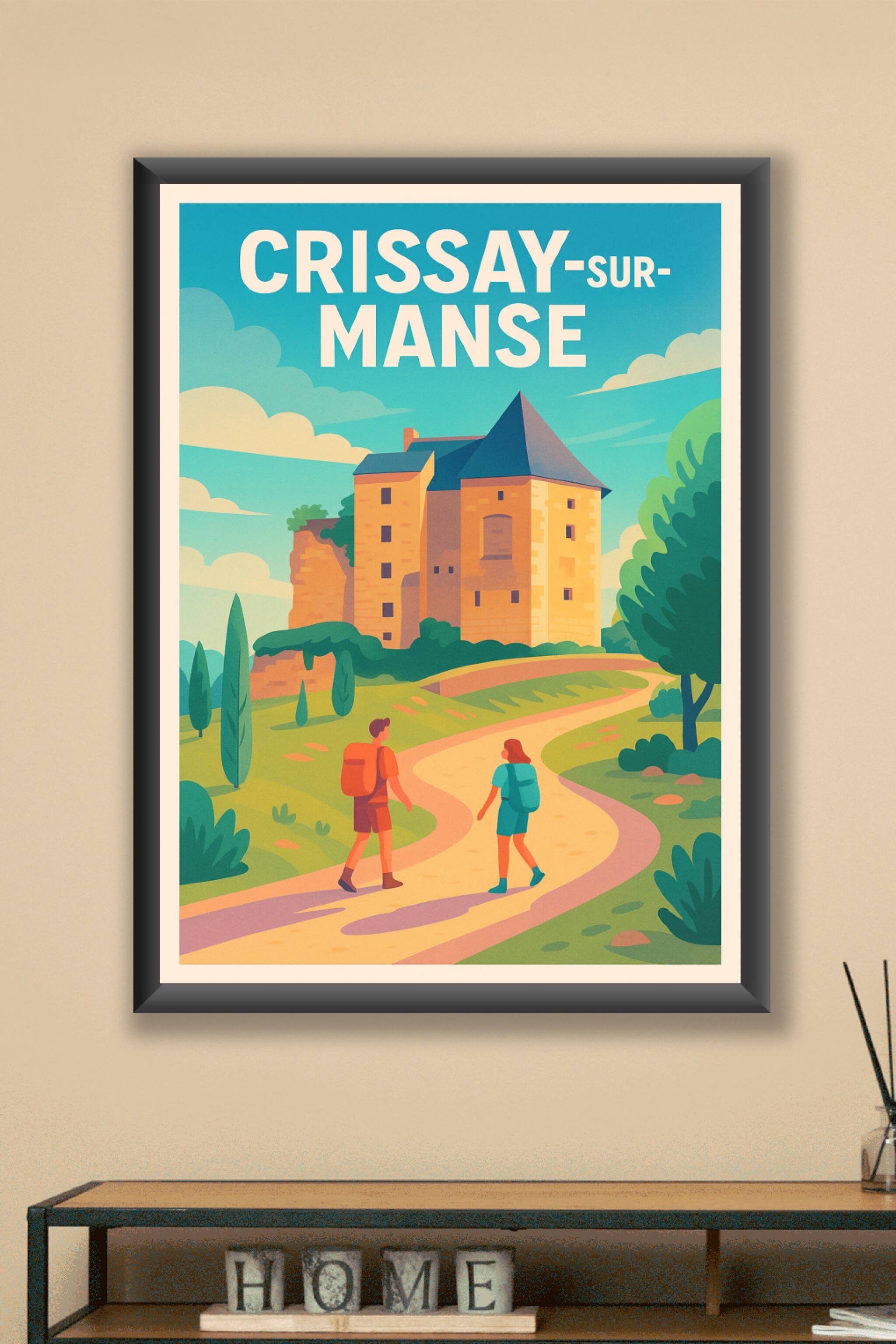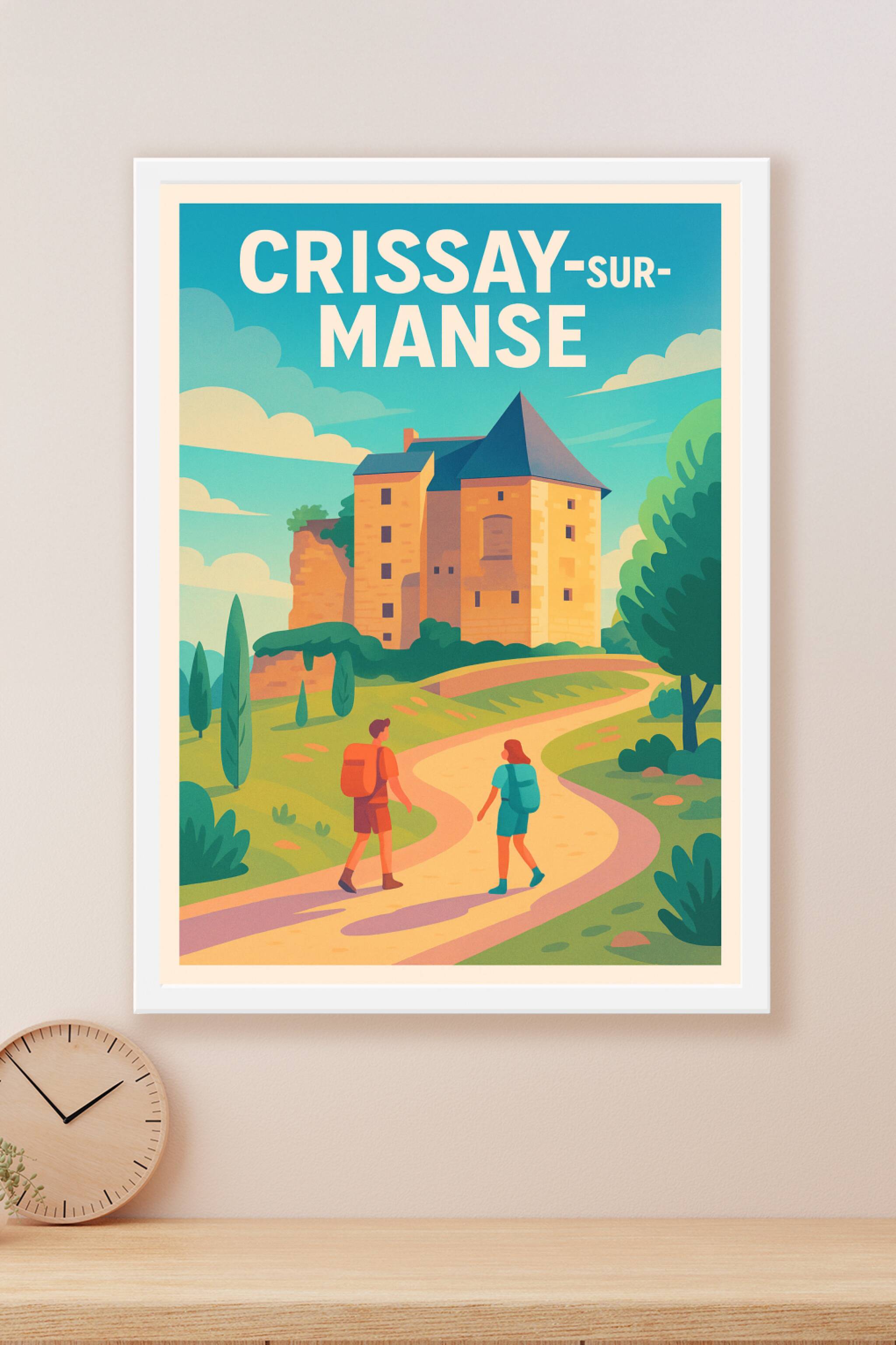 Découvrez l'atmosphère pittoresque et authentique de Crissay-sur-Manse avec cette affiche illustrée aux couleurs chaudes et apaisantes. Représentan...