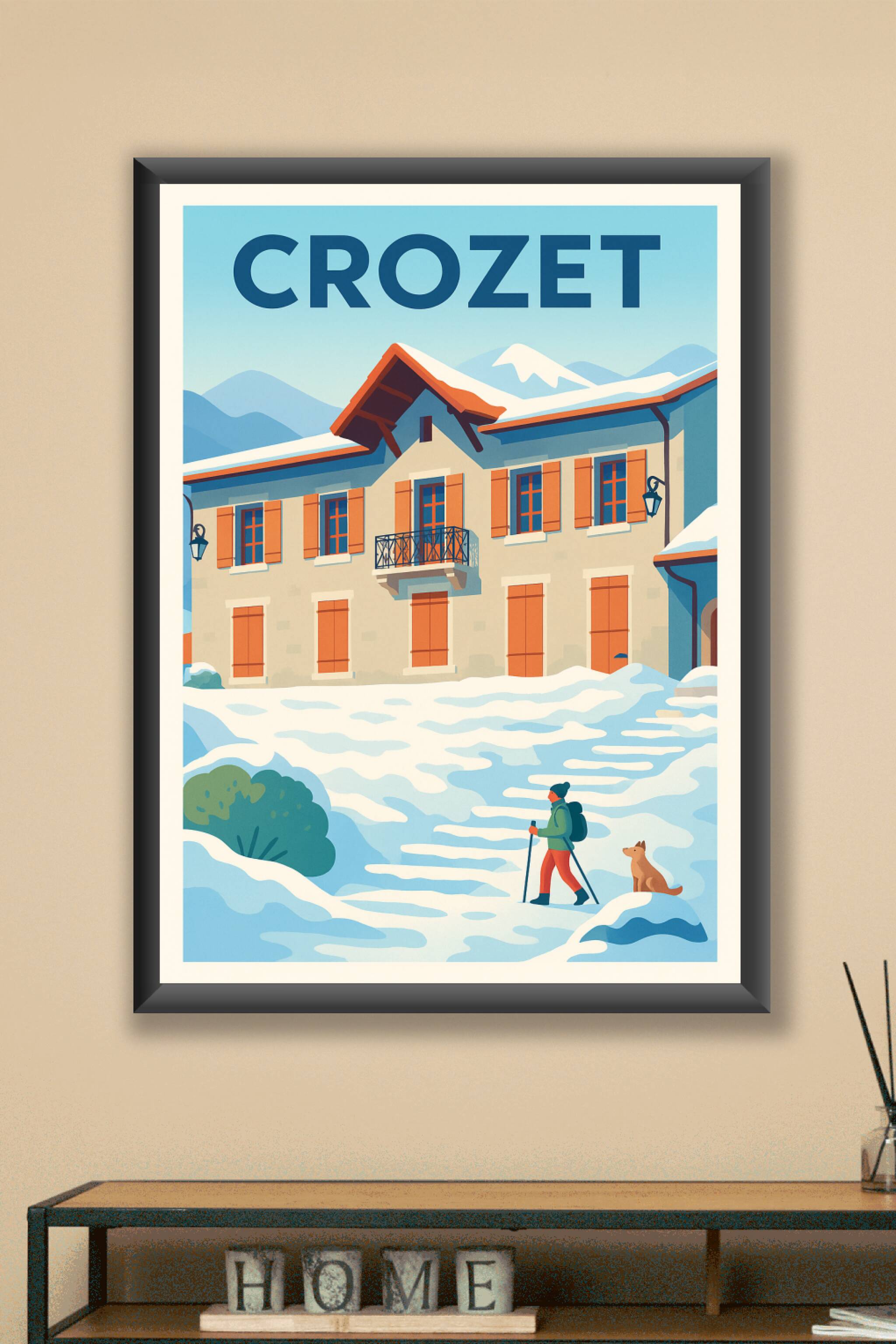 Découvrez la douceur d'un hiver paisible à Crozet avec cette affiche illustrée aux couleurs douces et apaisantes. La scène met en valeur une maison traditionnelle entourée de neige immaculée, où un randonneur et son chien profitent d'un paysage montagneux enchanteur.Ce poster est imprimé en tirage "Fine Art" sur papier 305g coton, garantissant une qualité d'impression supérieure et une durabilité optimale. Disponible en formats A1 à A4, avec ou sans cadre, cette affiche apportera une touche élégante et chaleureuse à votre décoration intérieure.Profitez d'une impression 100% française pour sublimer votre intérieur ou offrir un souvenir authentique aux amoureux de la montagne et de Crozet.