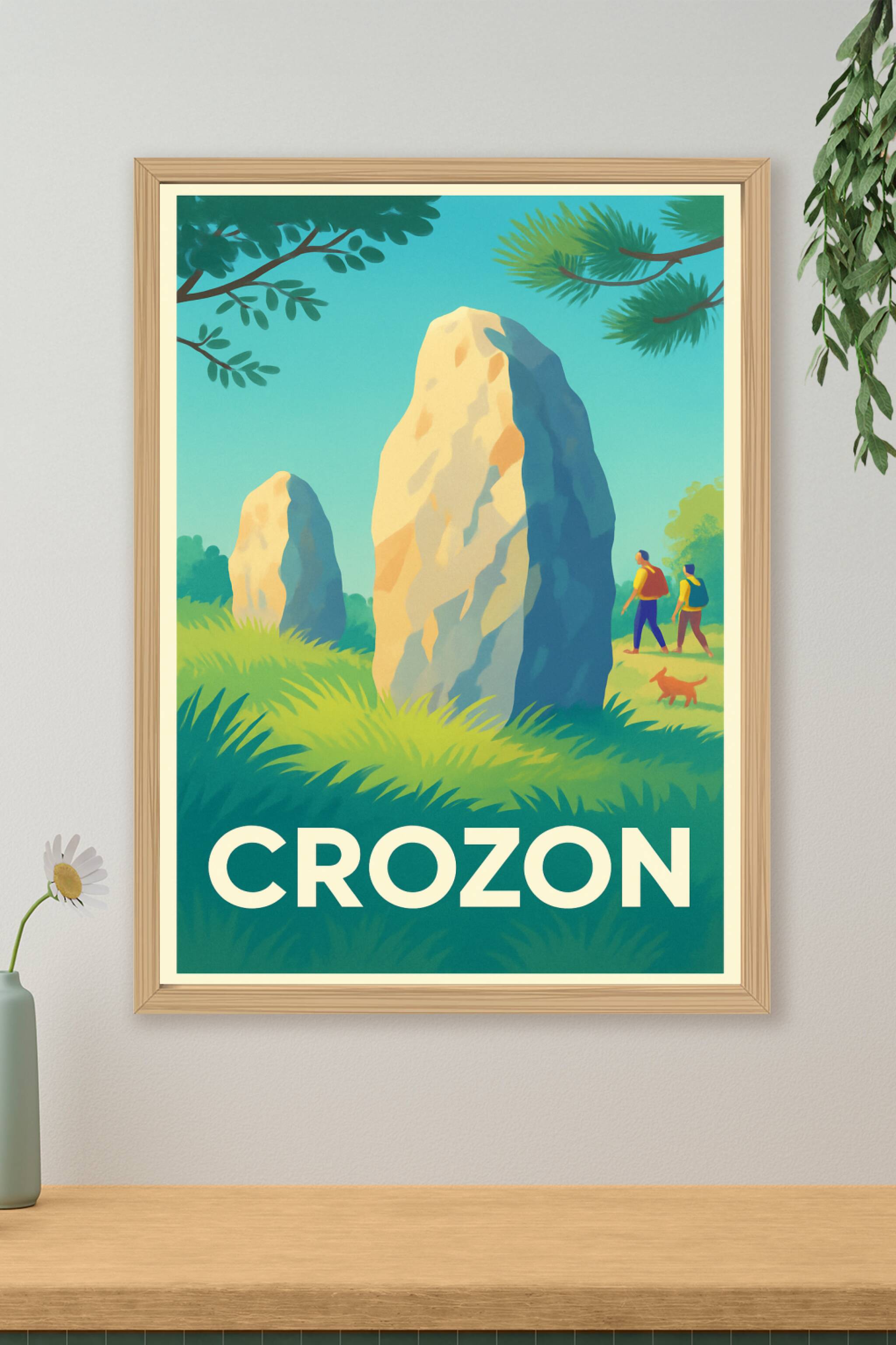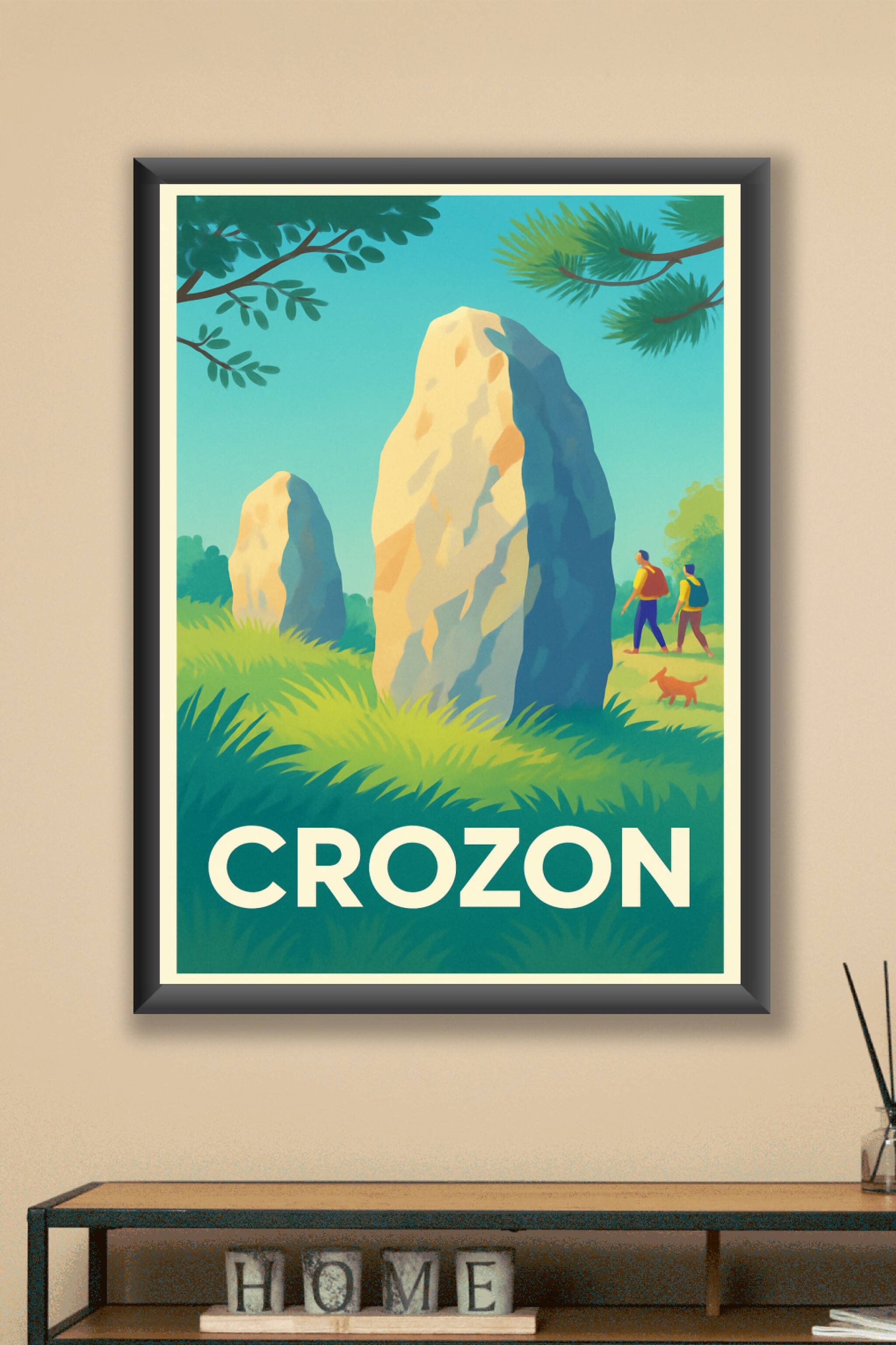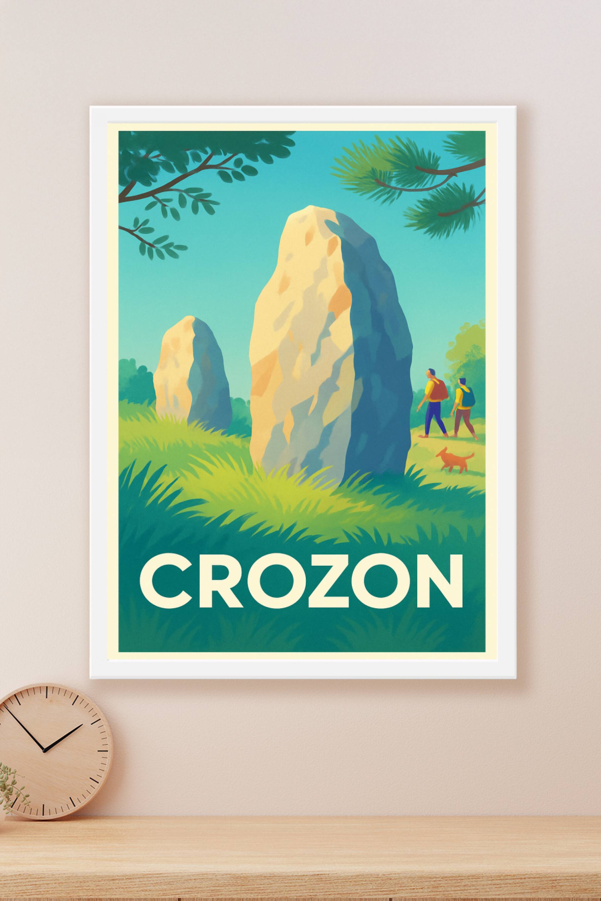 Découvrez la beauté sauvage et l'histoire fascinante de Crozon à travers cette affiche au style vintage qui met en lumière les célèbres menhirs de ...