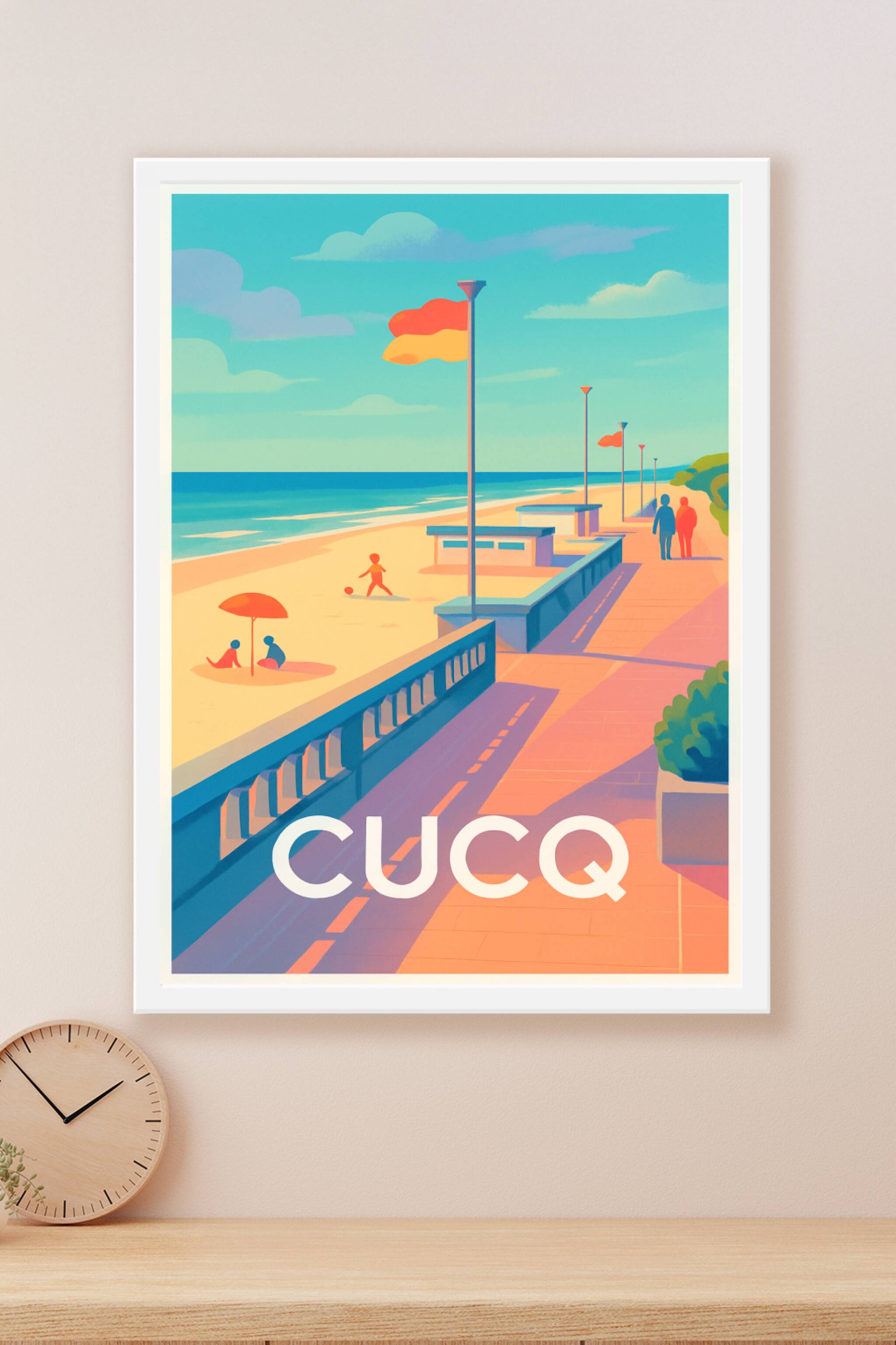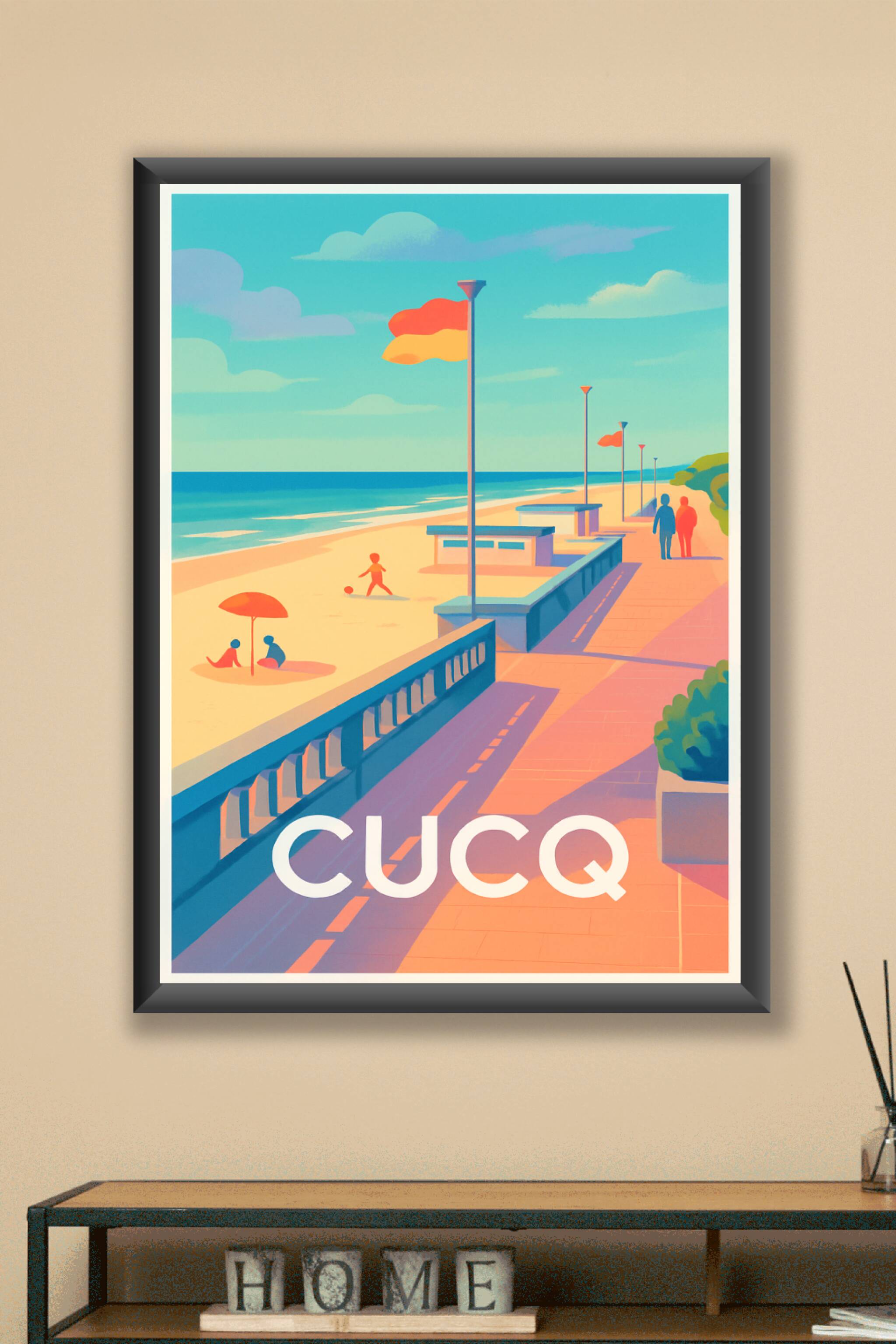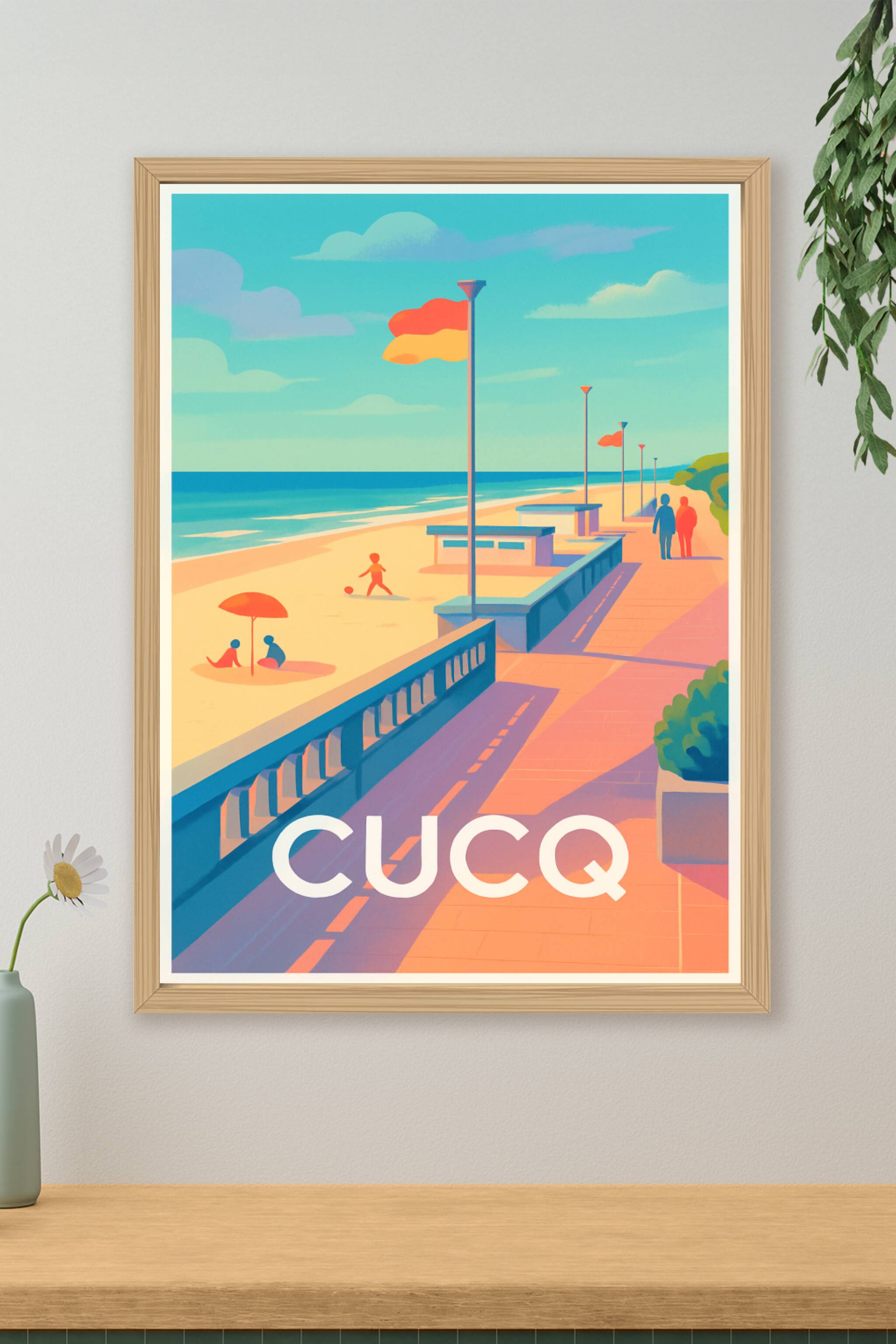 Laissez-vous emporter par la douceur de la côte de Cucq avec cette affiche illustrée mettant en scène une plage aux teintes pastel et une promenade...