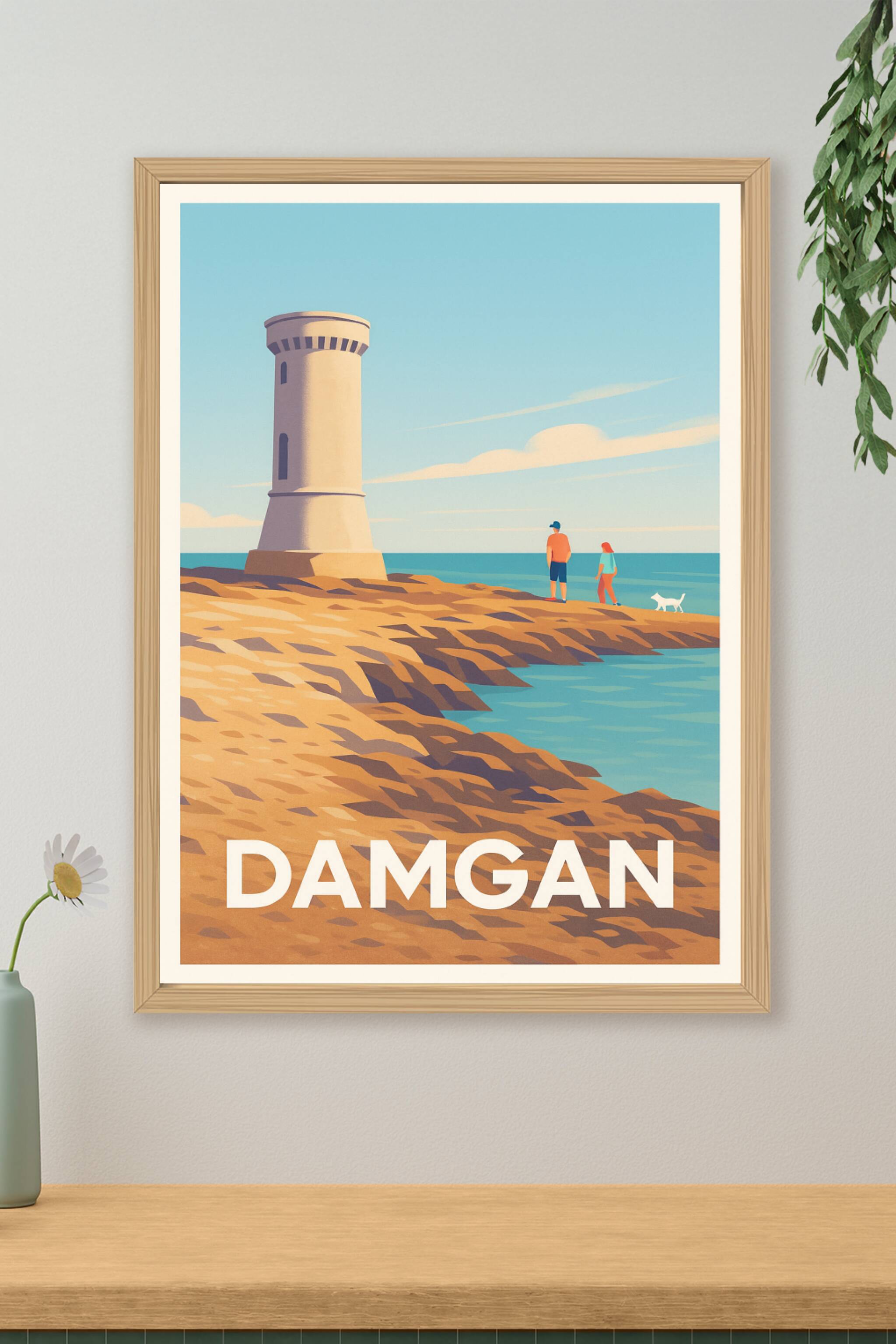 Découvrez la douceur de vivre de Damgan avec cette affiche illustrée mettant en scène son célèbre phare et ses rivages rocheux baignant dans une lu...