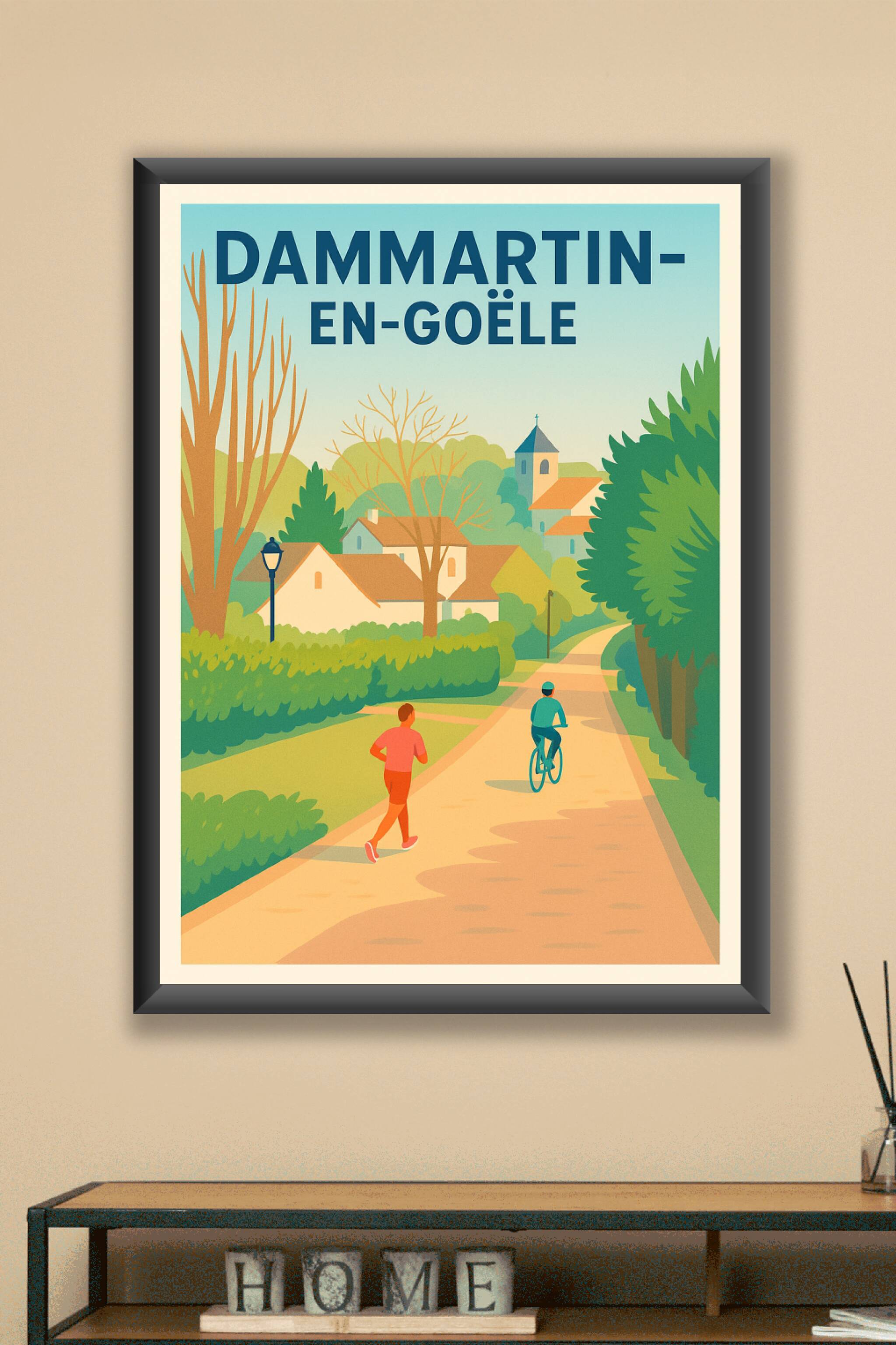 Découvrez la sérénité de Dammartin-en-Goële à travers cette affiche illustrée mettant en scène une paisible balade à pied et à vélo au cœur d’un paysage verdoyant. Ce poster évoque un quotidien harmonieux entre nature et village typique, parfait pour apporter une ambiance douce et apaisante à votre intérieur. Imprimée en tirage "Fine Art" sur un papier premium 305g coton, cette affiche garantit une qualité d'impression exceptionnelle et une durabilité remarquable. Disponible en formats A1 à A4, avec ou sans cadre, ce poster est idéal pour sublimer votre déco ou offrir un cadeau élégant aux amoureux de cette charmante commune du Grand Est francilien.