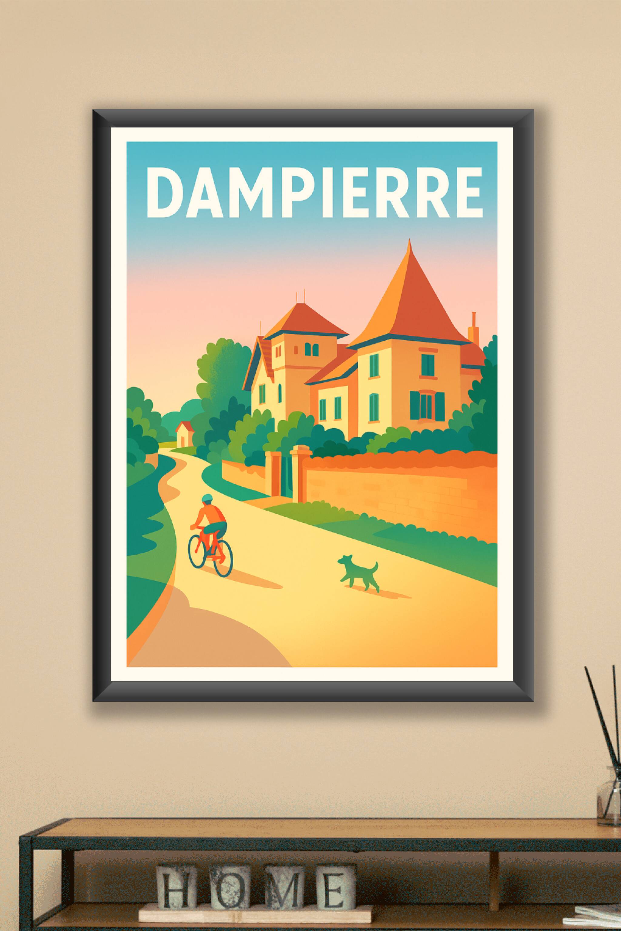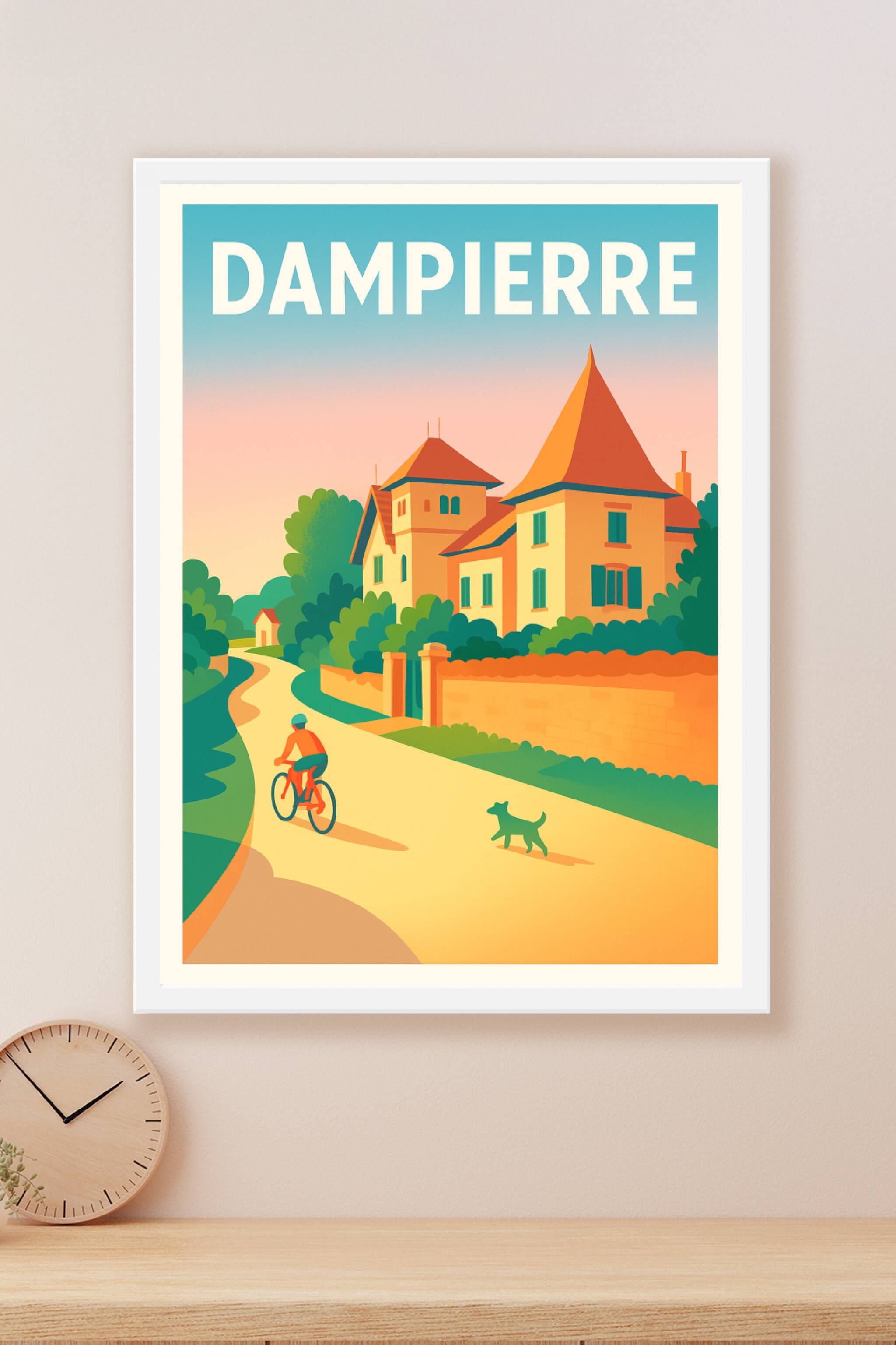 Découvrez la sérénité de Dampierre à travers cette affiche illustrée qui capture une balade paisible entre maison de charme et nature verdoyante. C...