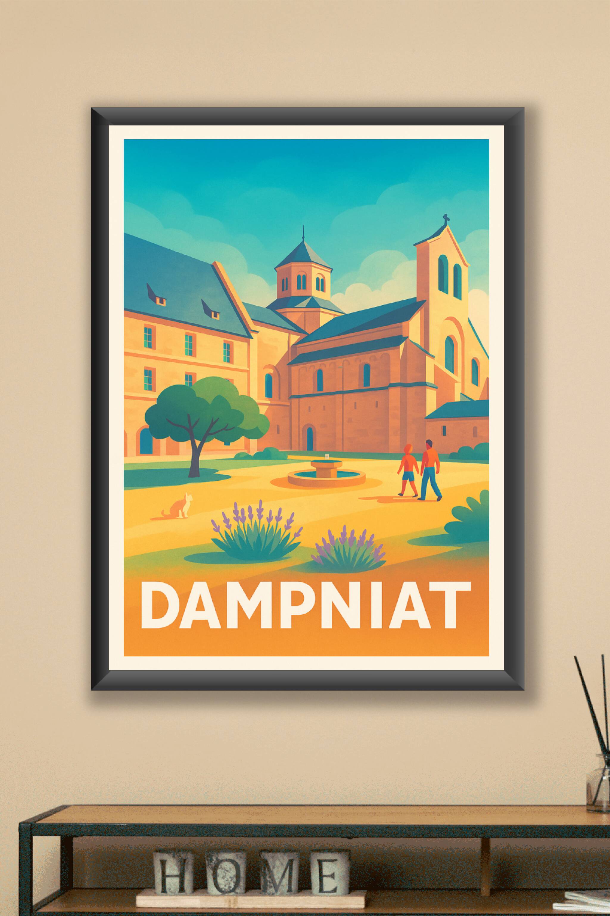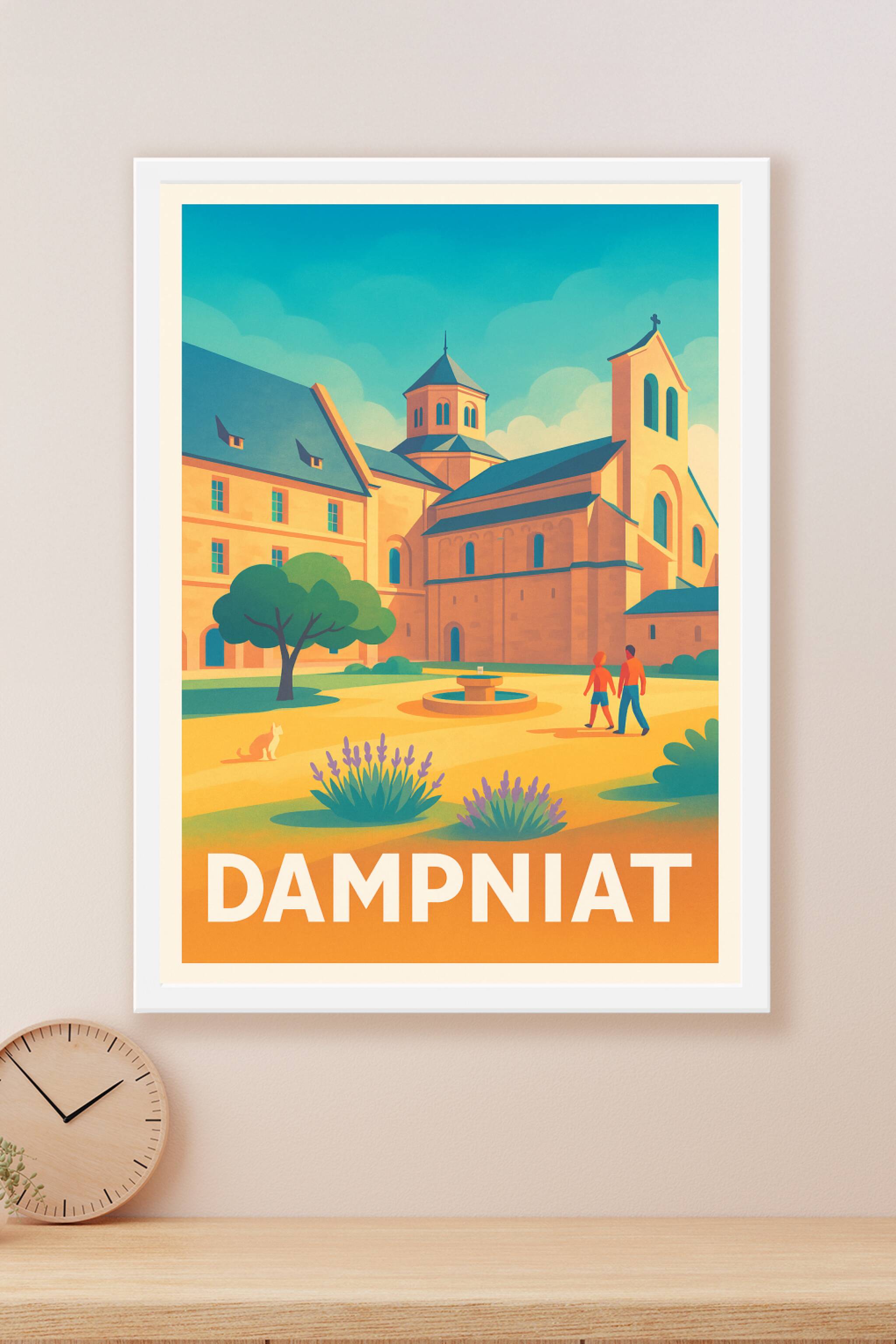Découvrez Dampniat à travers cette magnifique affiche au style rétro moderne, qui met en valeur le charme apaisant de cette ville auvergnate. L'ill...