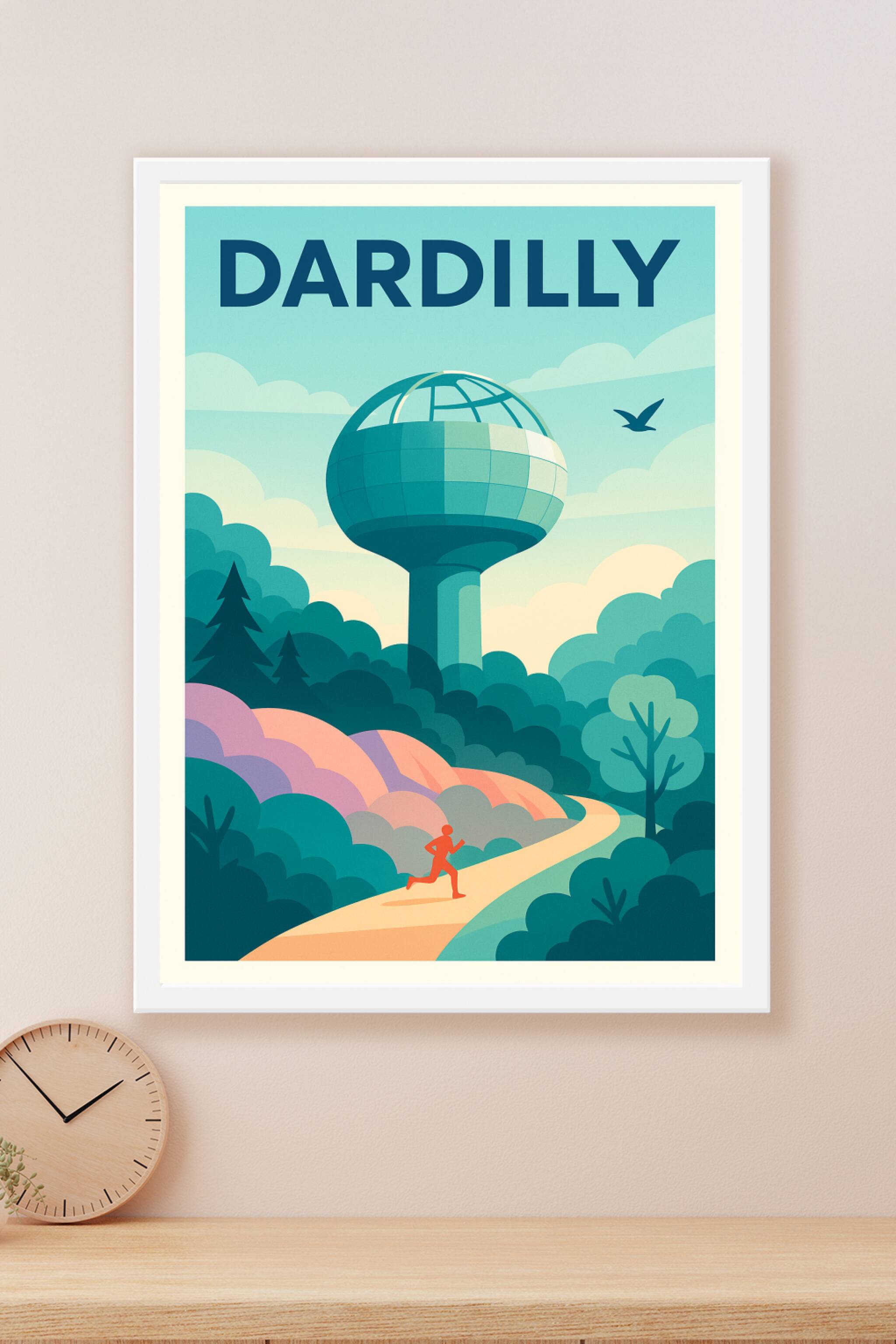 Découvrez cette affiche artistique qui met en lumière la ville de Dardilly à travers une illustration moderne et colorée, où un coureur s'élance su...