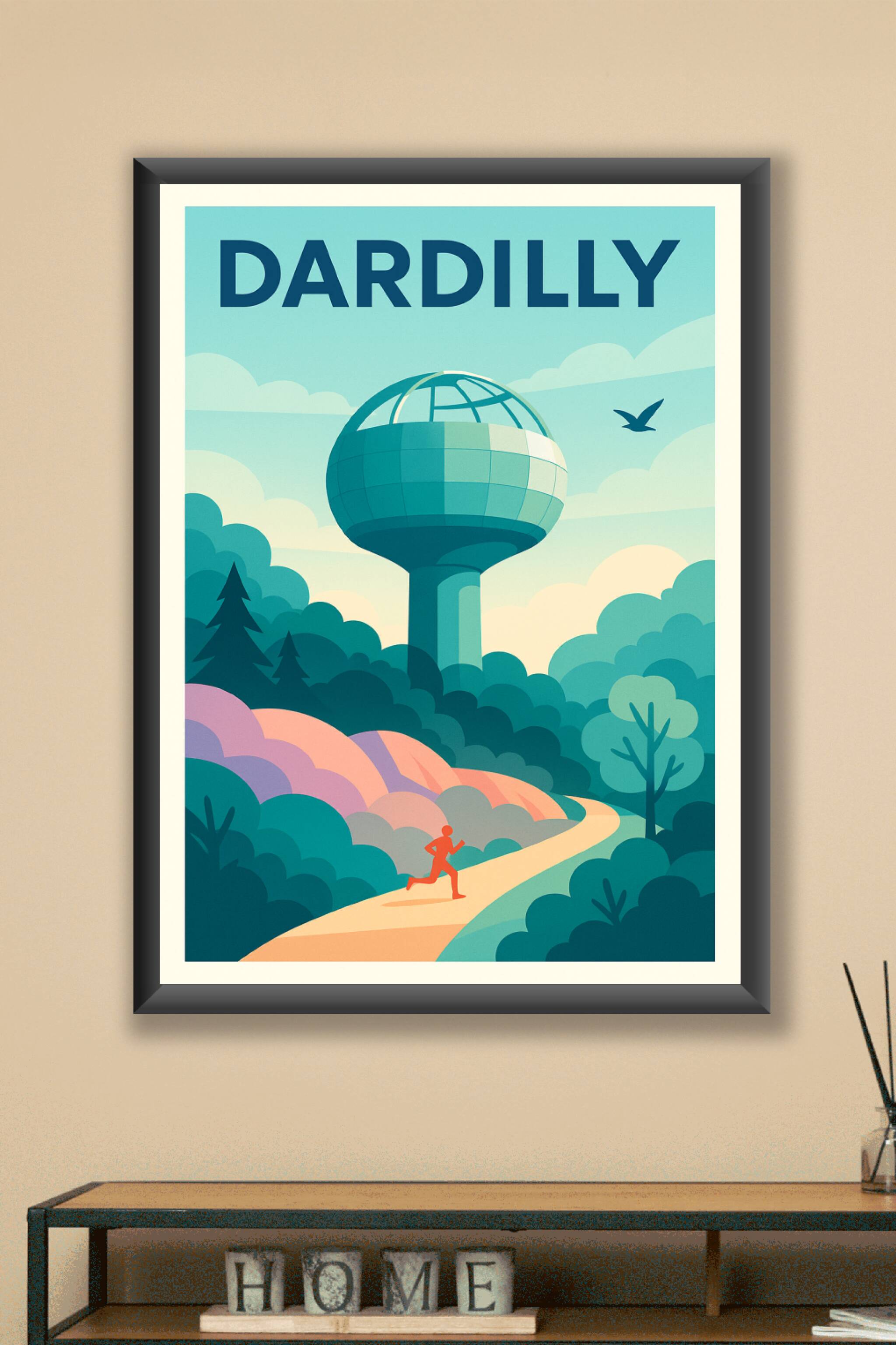 Découvrez cette affiche artistique qui met en lumière la ville de Dardilly à travers une illustration moderne et colorée, où un coureur s'élance sur un chemin bordé de végétation luxuriante sous le ciel clair. Le célèbre réservoir en forme de globe surplombe la scène, symbole emblématique de la commune.Dans notre boutique, ce poster est proposé en tirage Fine Art sur papier de qualité 305g coton, garantissant des couleurs vibrantes et une durabilité exceptionnelle. Disponible en formats A1 à A4, avec ou sans cadre, il s'adaptera parfaitement à votre intérieur pour y apporter une touche dynamique et nature. Chaque affiche est imprimée en France avec une qualité premium pour décorer votre maison ou offrir un souvenir unique de Dardilly.