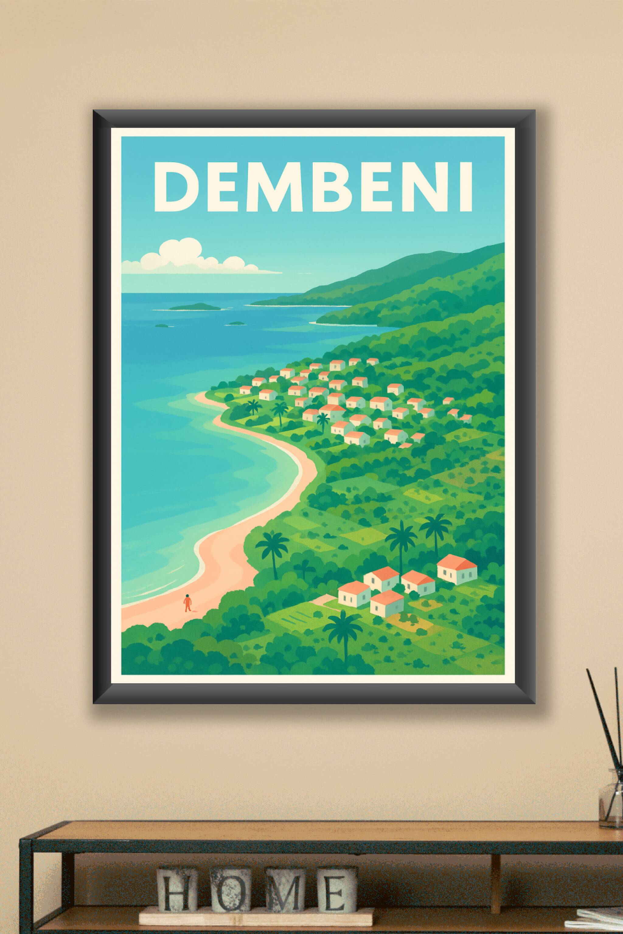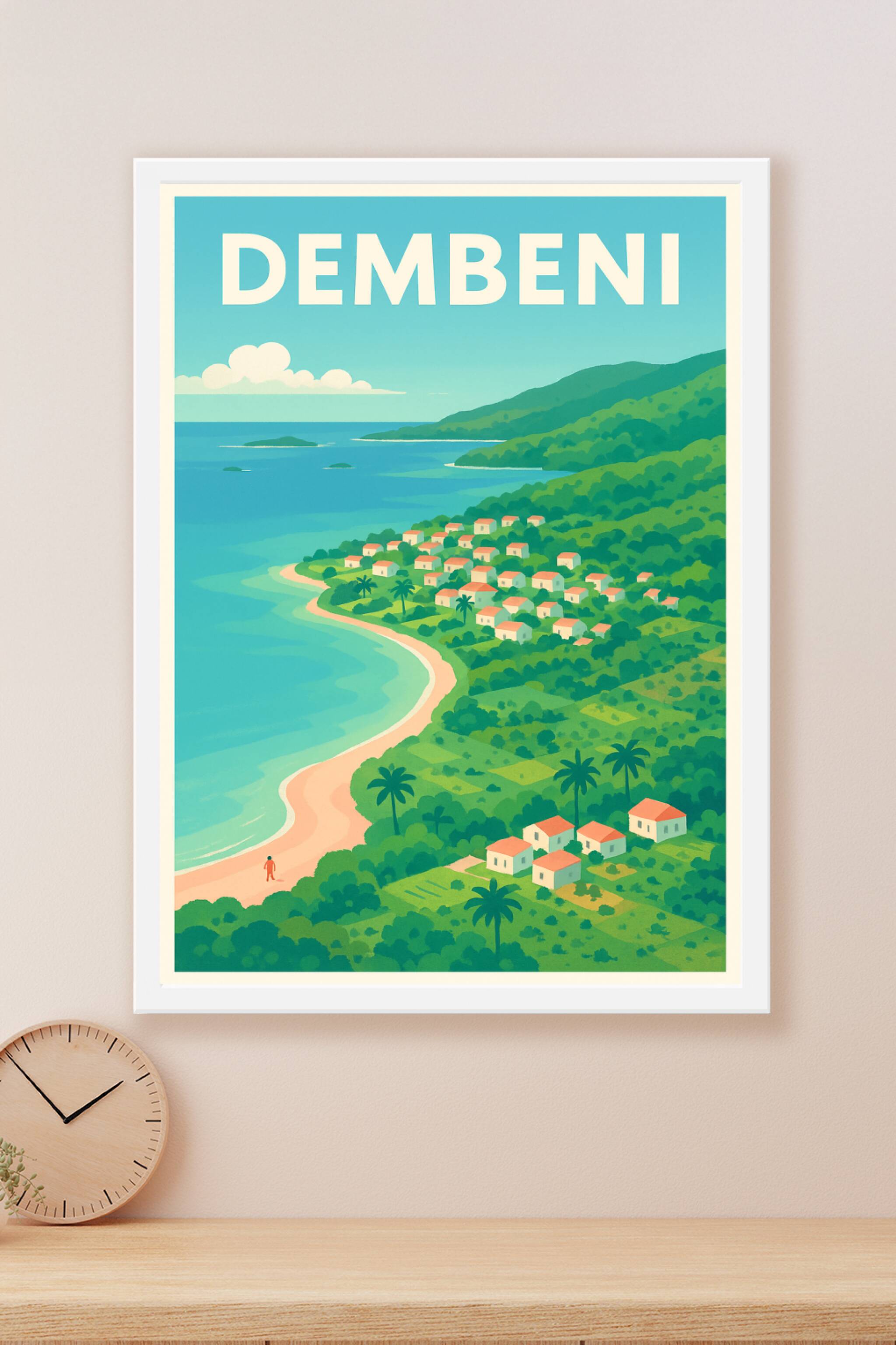 Découvrez l'affiche Dembeni qui capture l'essence paisible d'un village côtier, entre plages de sable fin, maisons aux toits rouges et végétation l...