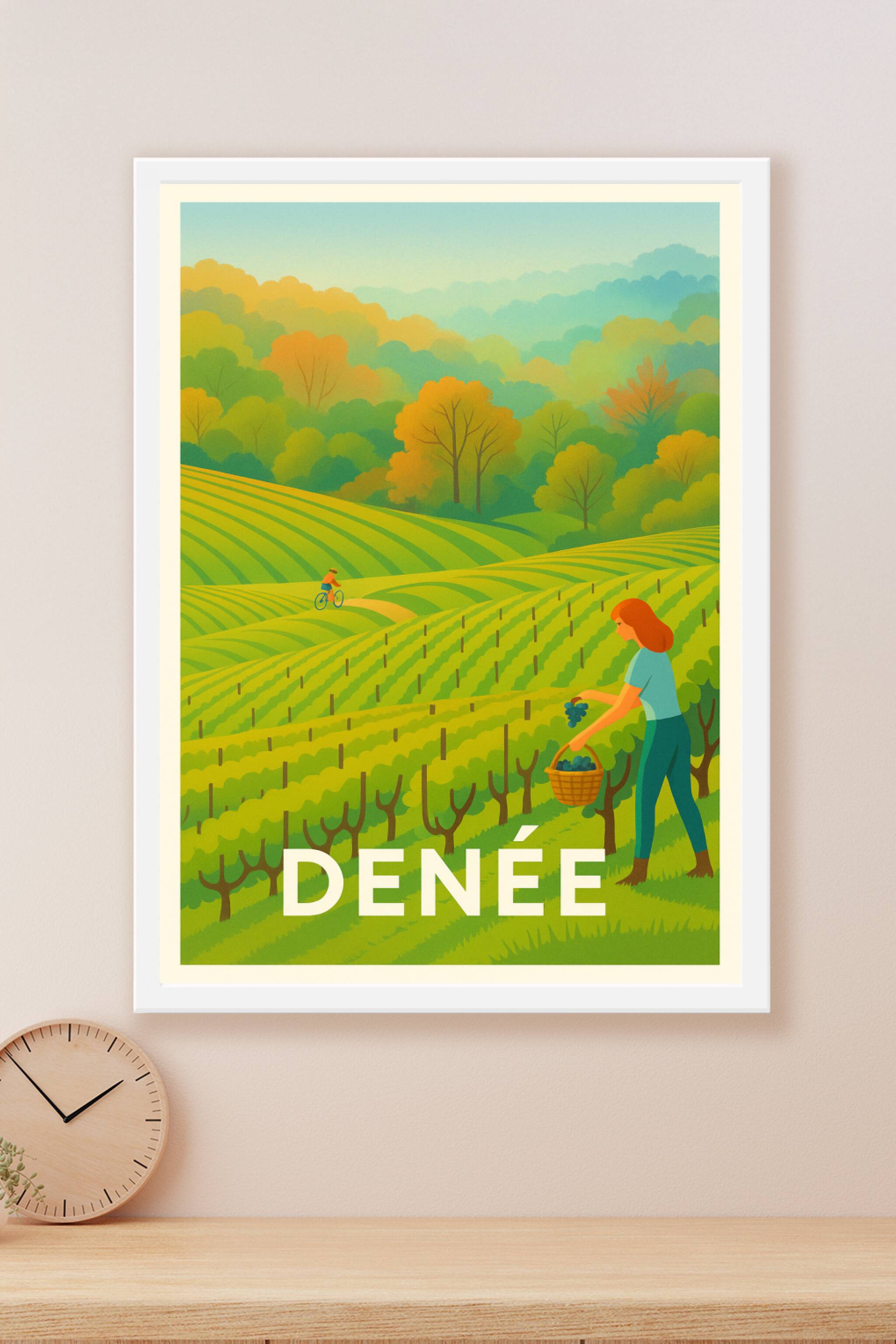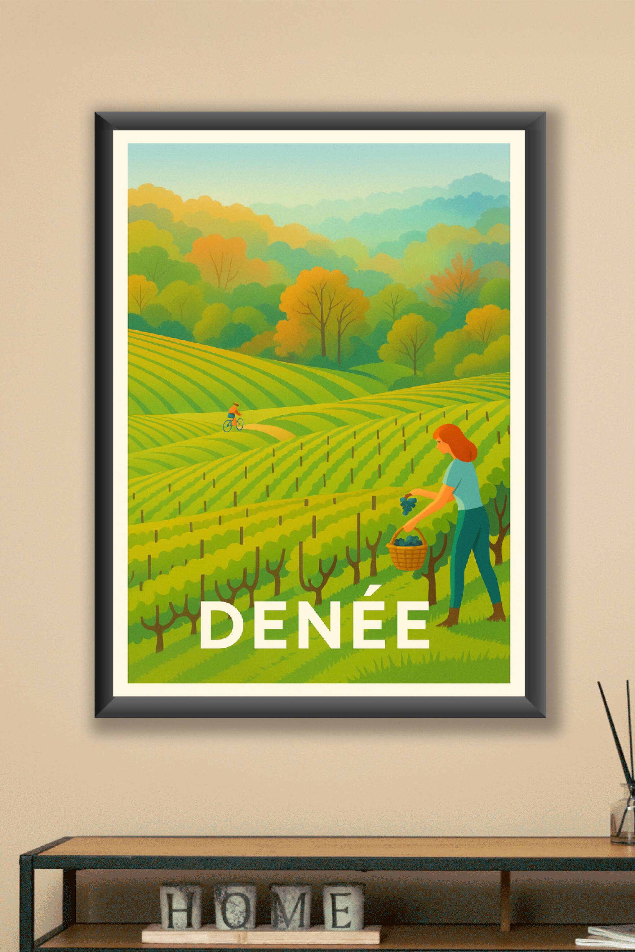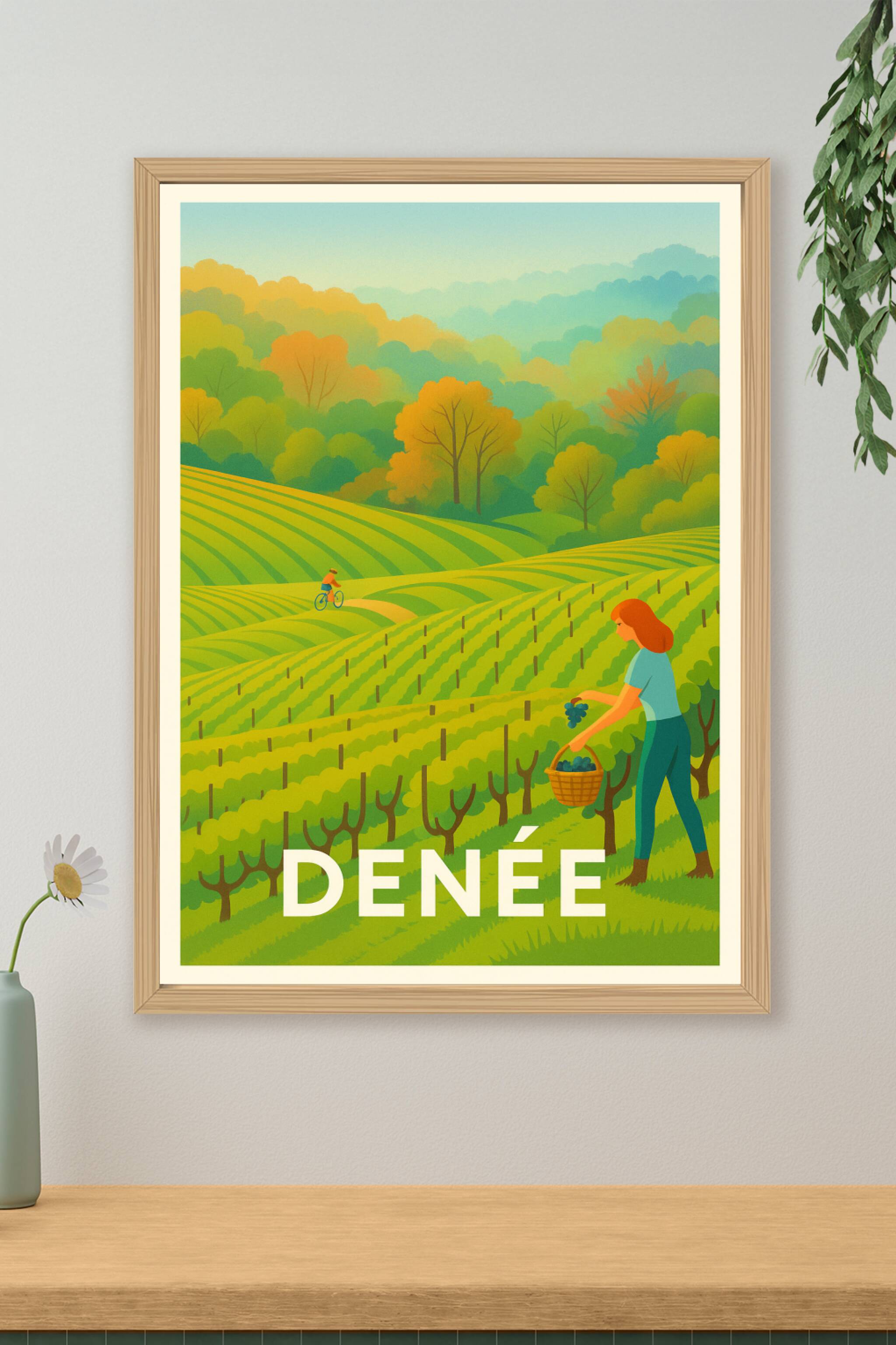 Découvrez l'atmosphère paisible et colorée de Denée à travers cette affiche illustrée qui capture la beauté des vignobles en pleine récolte. Cette ...