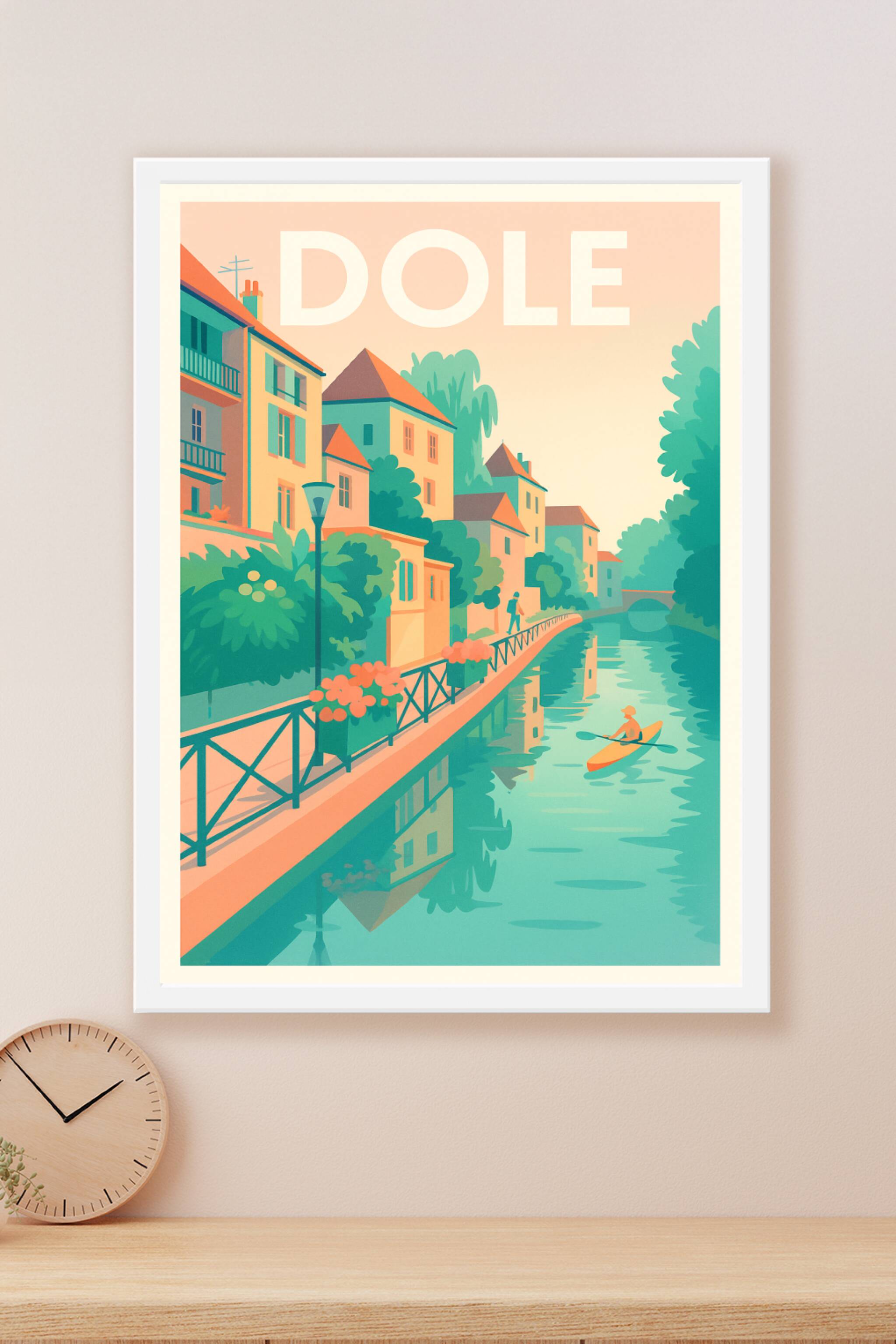 Découvrez la sérénité et le charme de Dole avec cette affiche illustrée mettant en scène les quais pittoresques et le calme du canal qui traverse l...