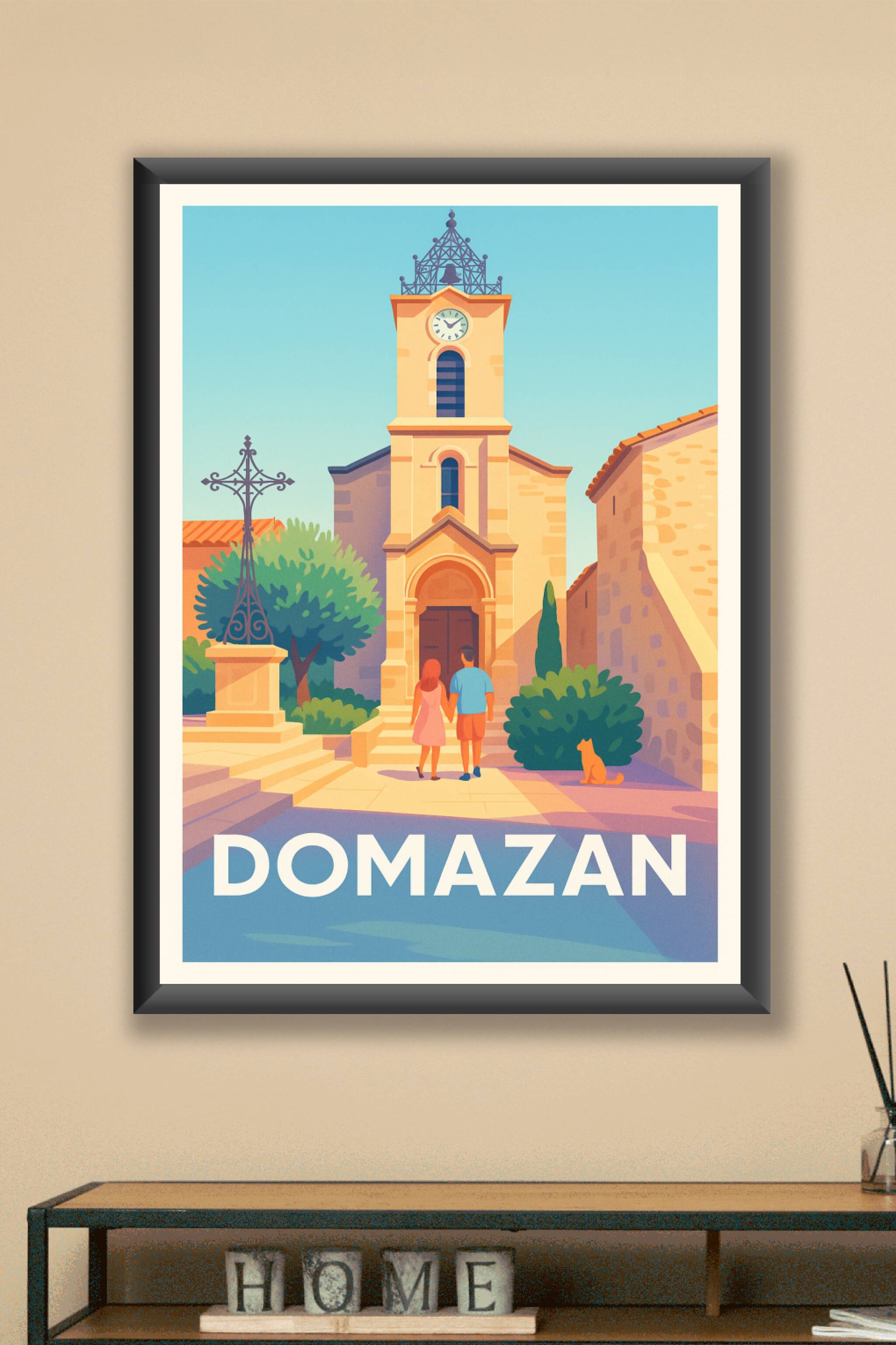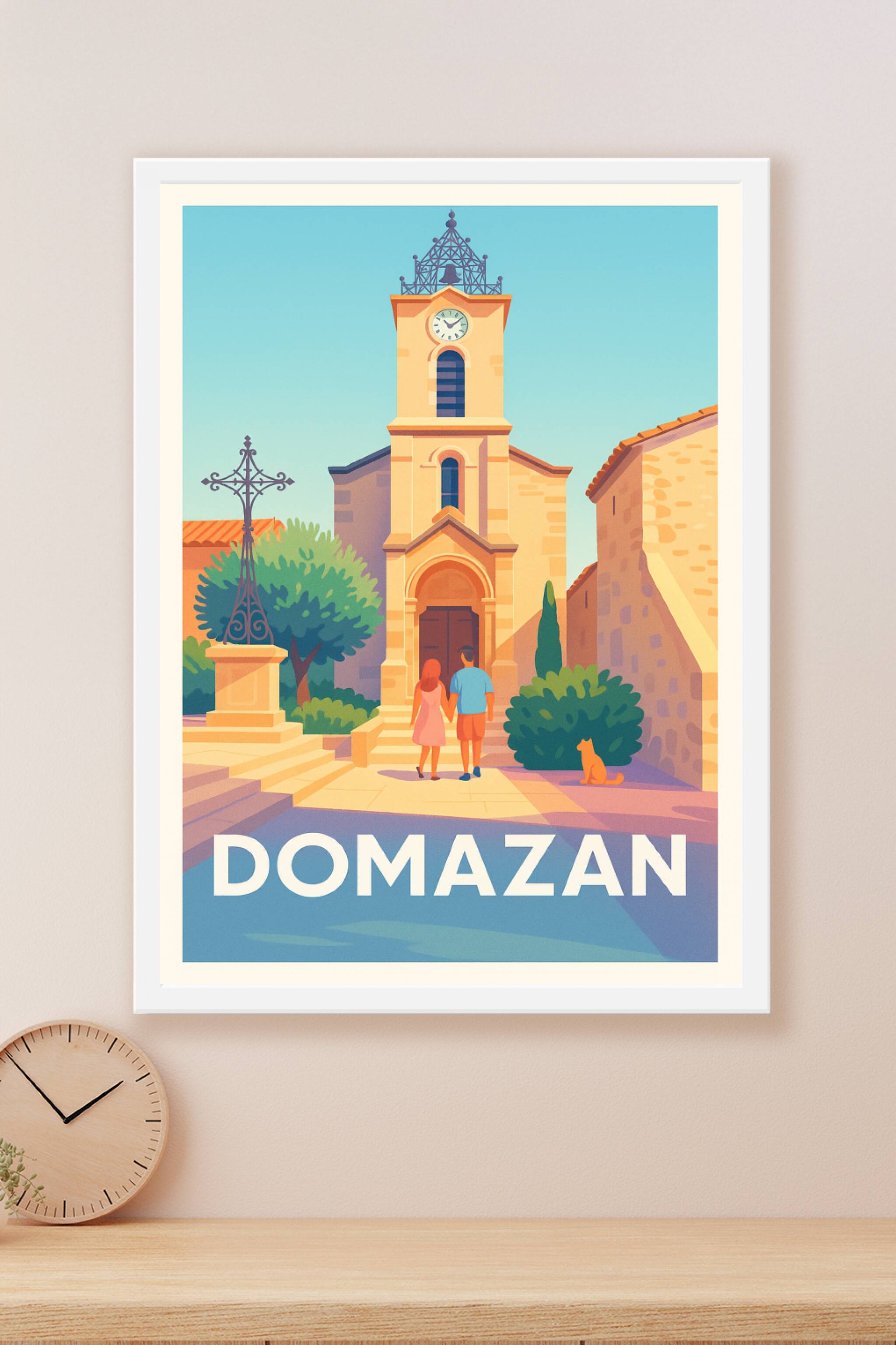 Découvrez l'atmosphère paisible et chaleureuse de Domazan à travers cette affiche illustrée qui met en lumière l'entrée typique de son église, symb...