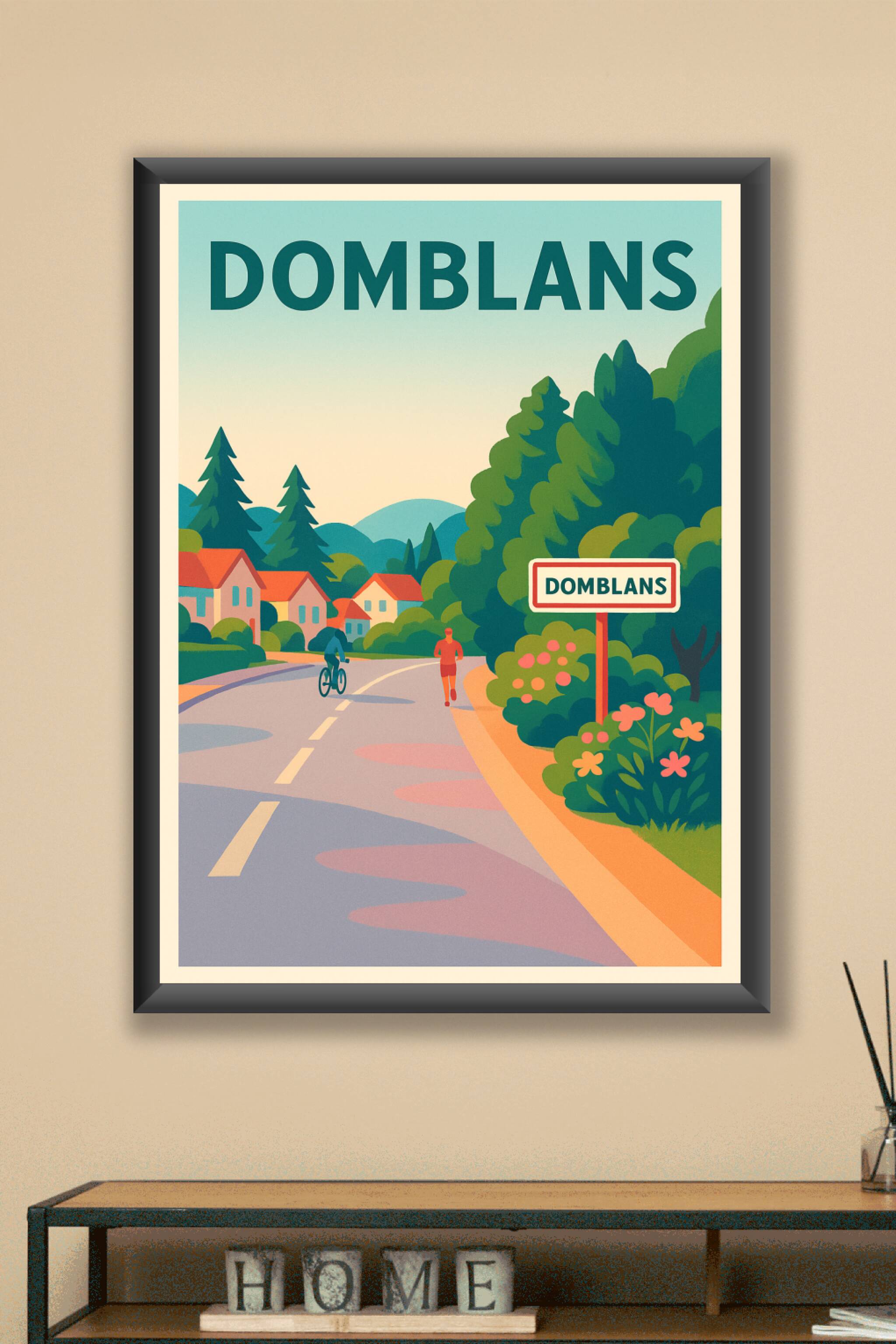 Découvrez le charme paisible de Domblans avec cette affiche illustrée représentant une scène chaleureuse de nature et de vie locale, où cyclistes e...