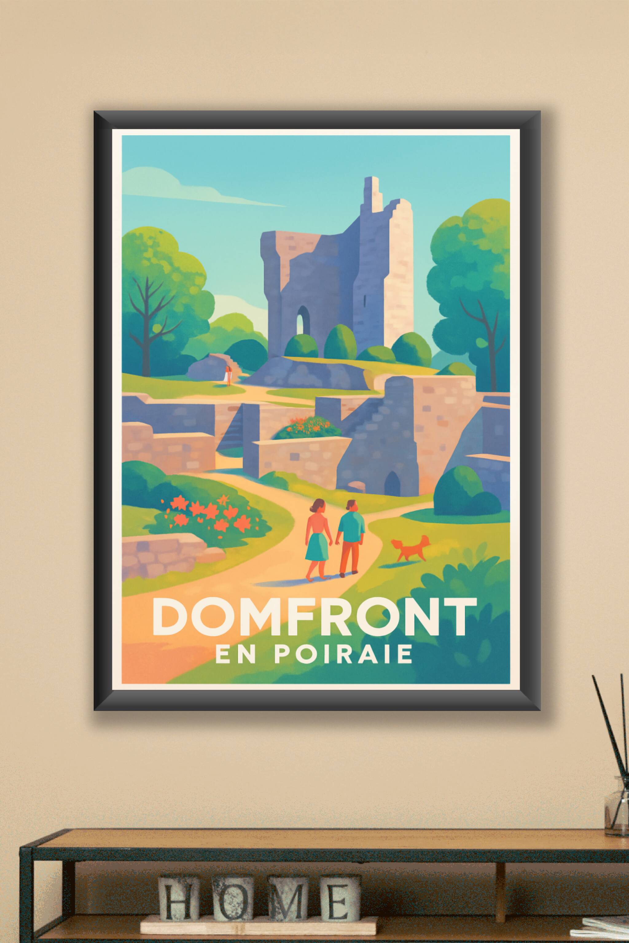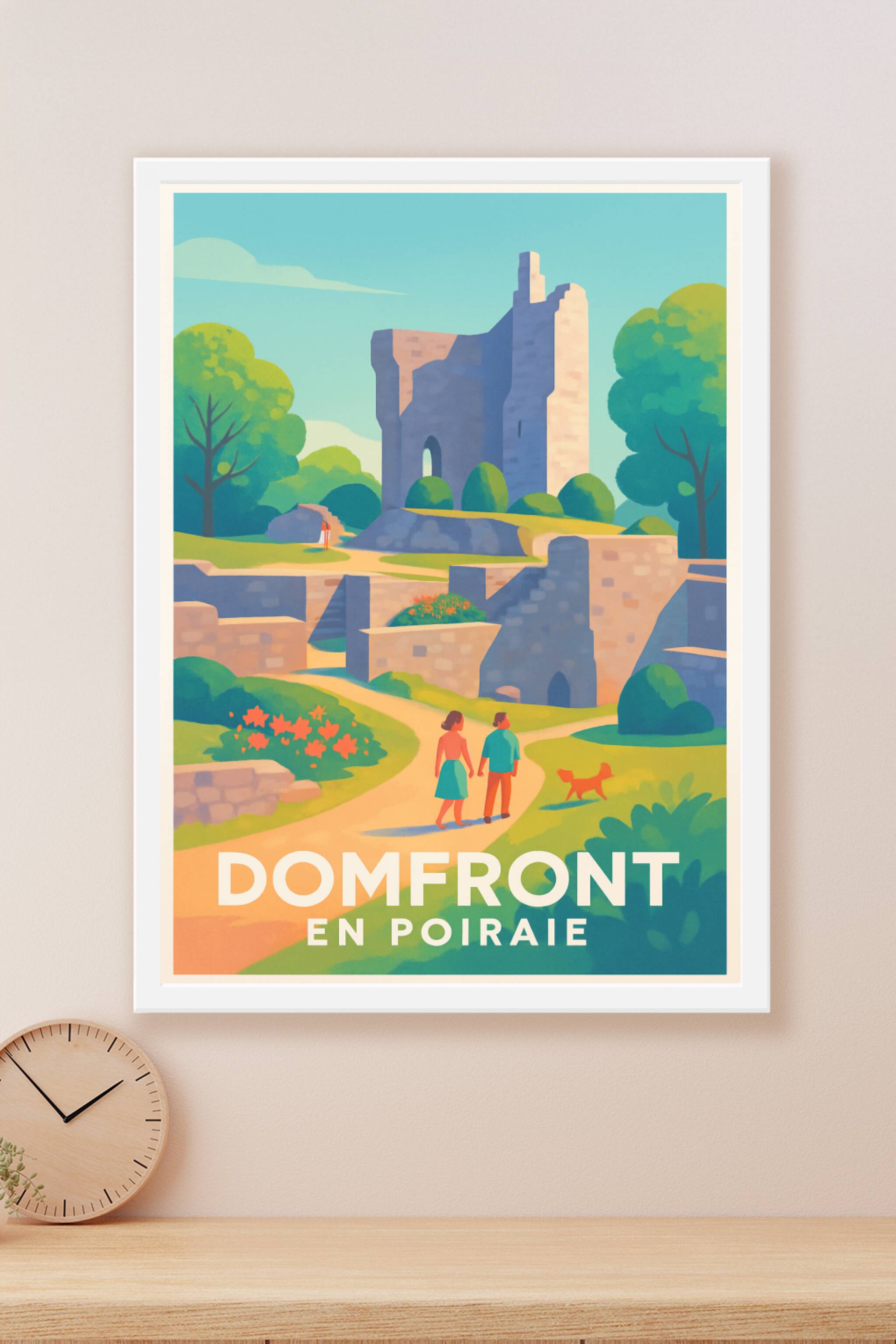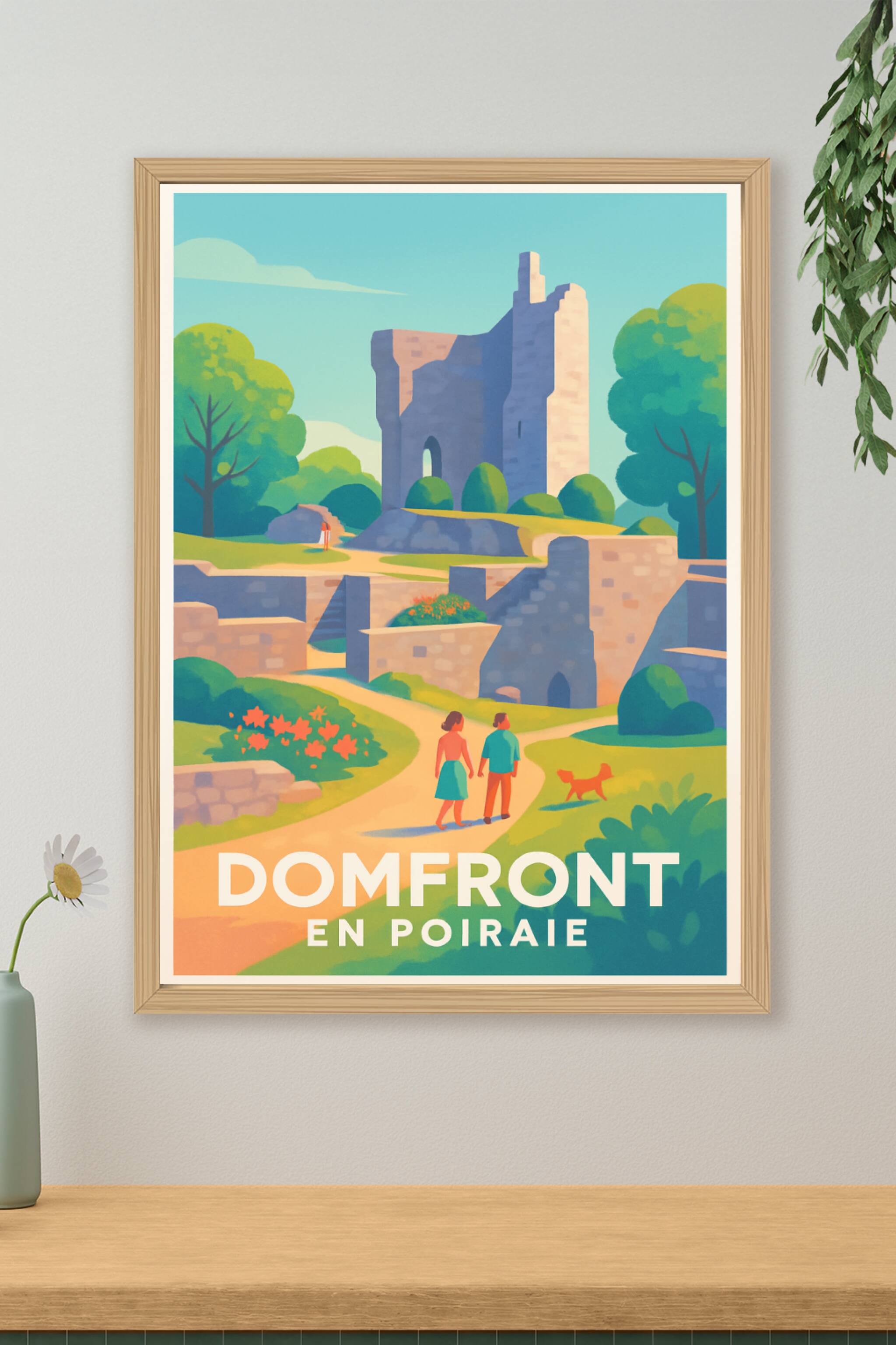 Offrez-vous une escapade visuelle à Domfront en Poiraie avec cette affiche au style rétro et coloré, mettant en scène les ruines emblématiques baig...