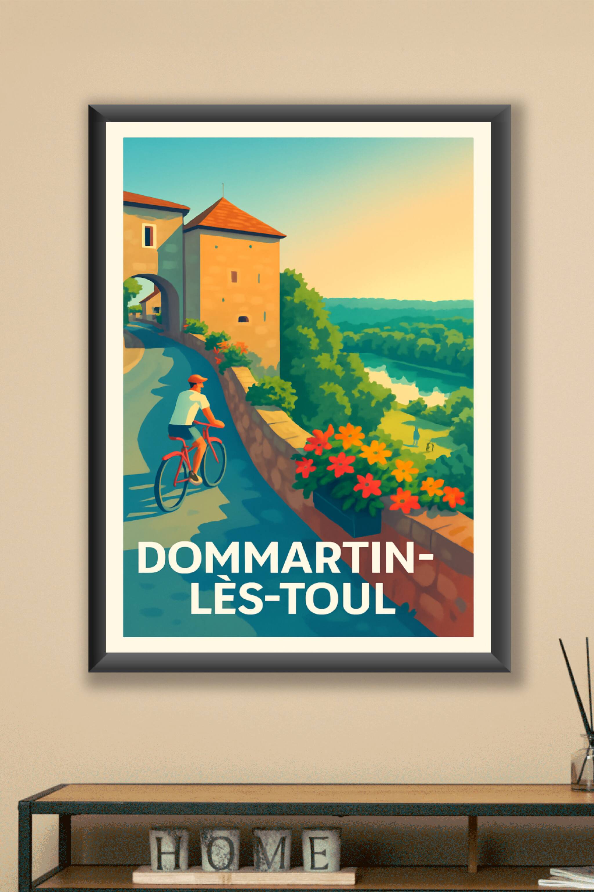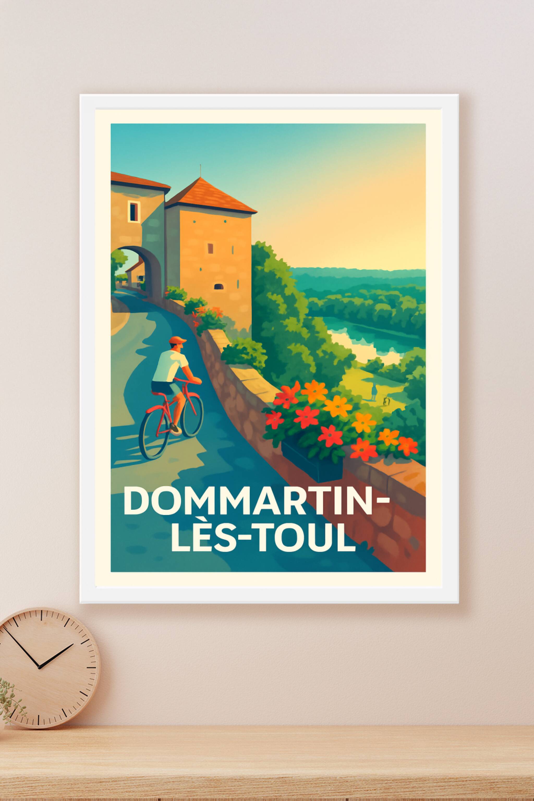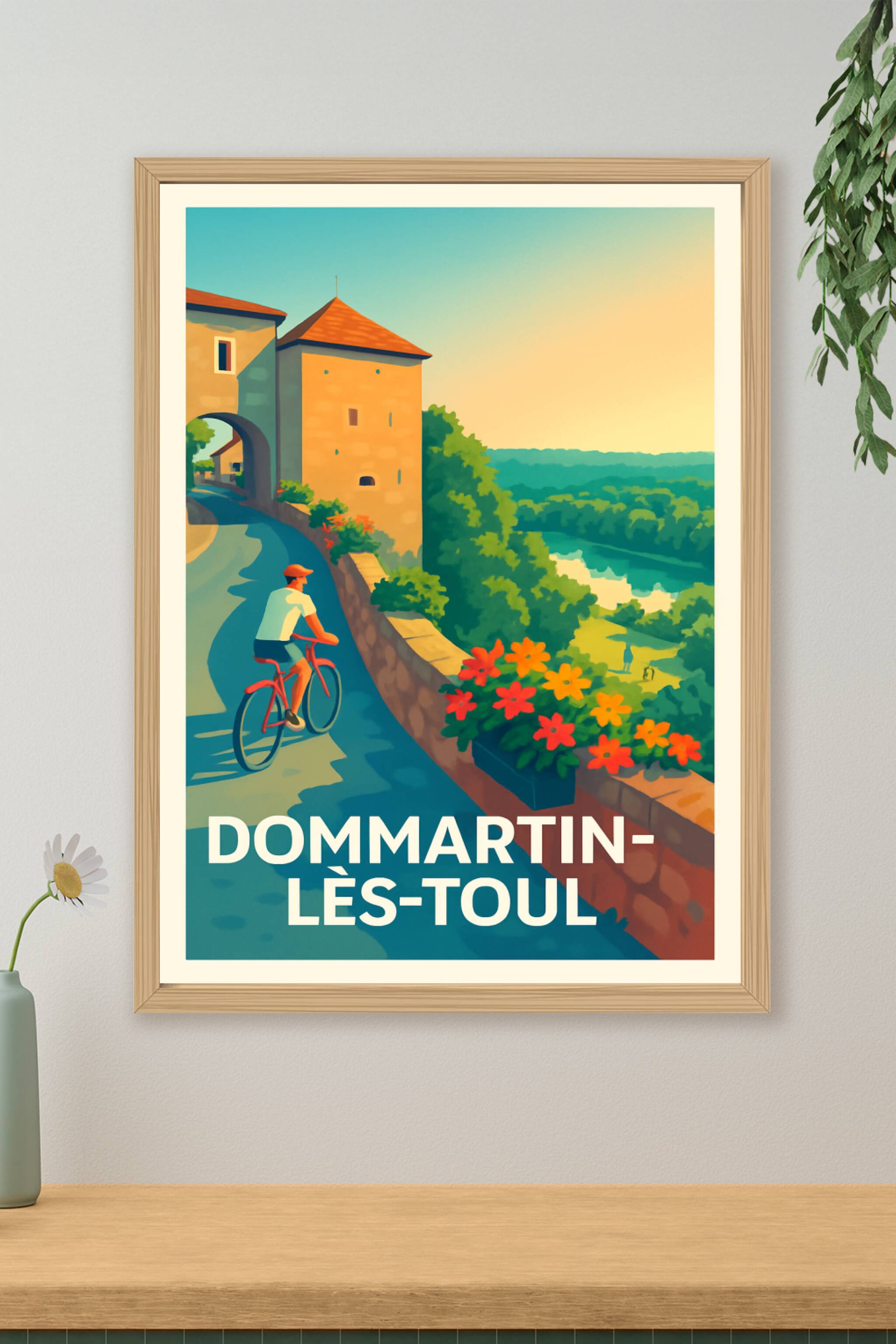 Découvrez le charme bucolique de Dommartin-lès-Toul avec cette affiche au style vintage mettant en scène une balade à vélo le long d'une ruelle pai...