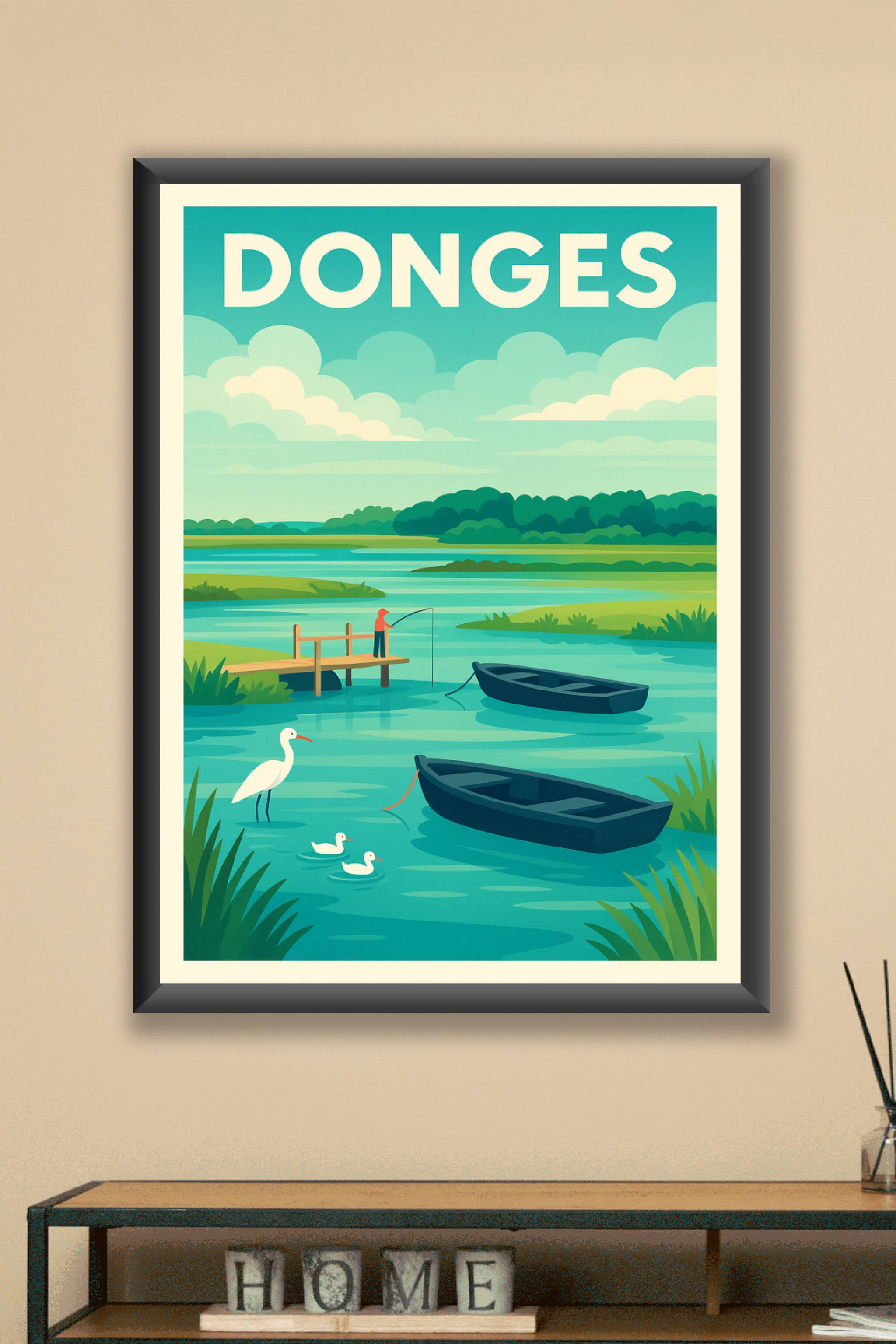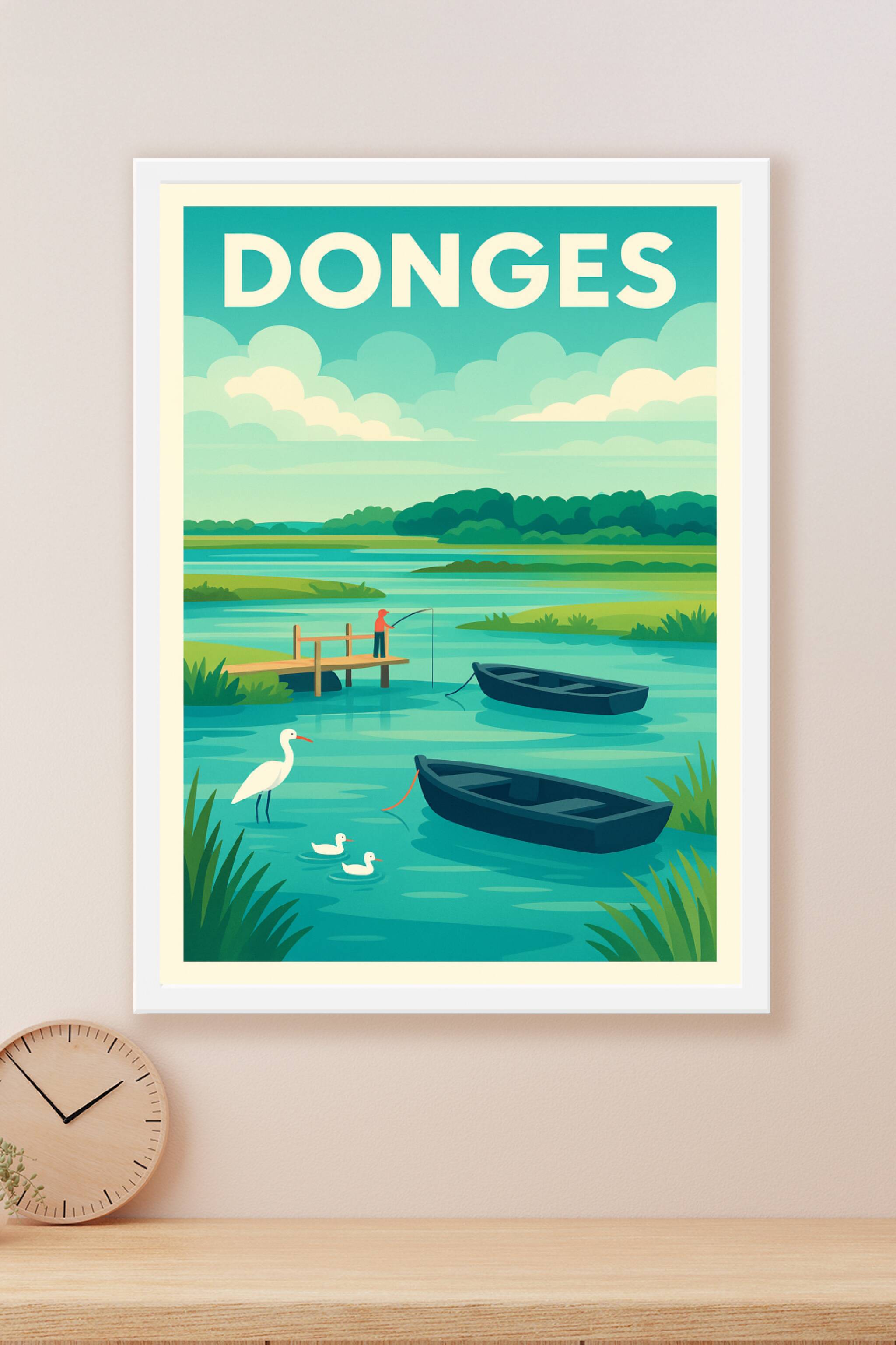 Découvrez la douceur bucolique de Donges à travers cette affiche illustrée qui capture un moment de sérénité au bord de l'eau avec des barques, un ...