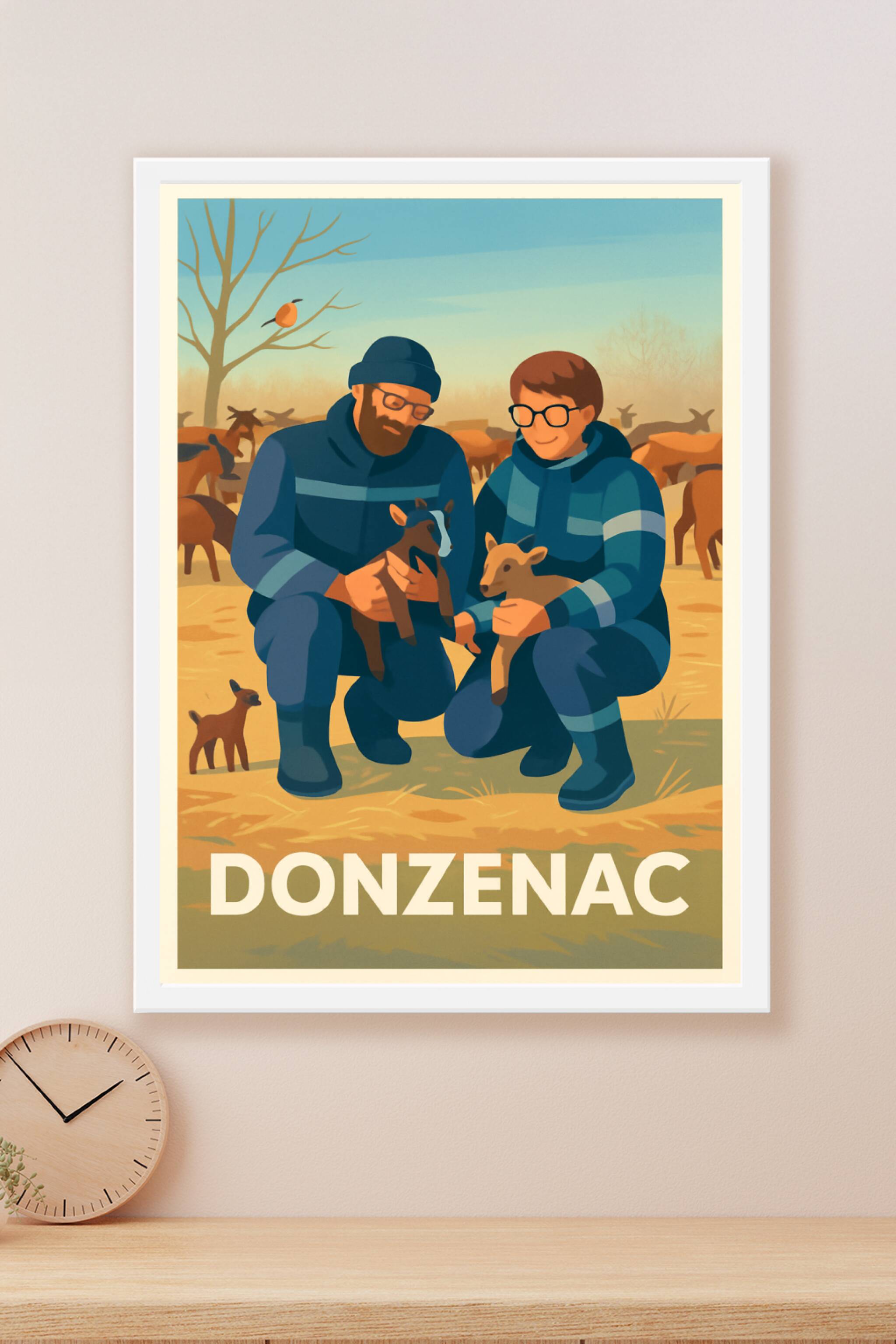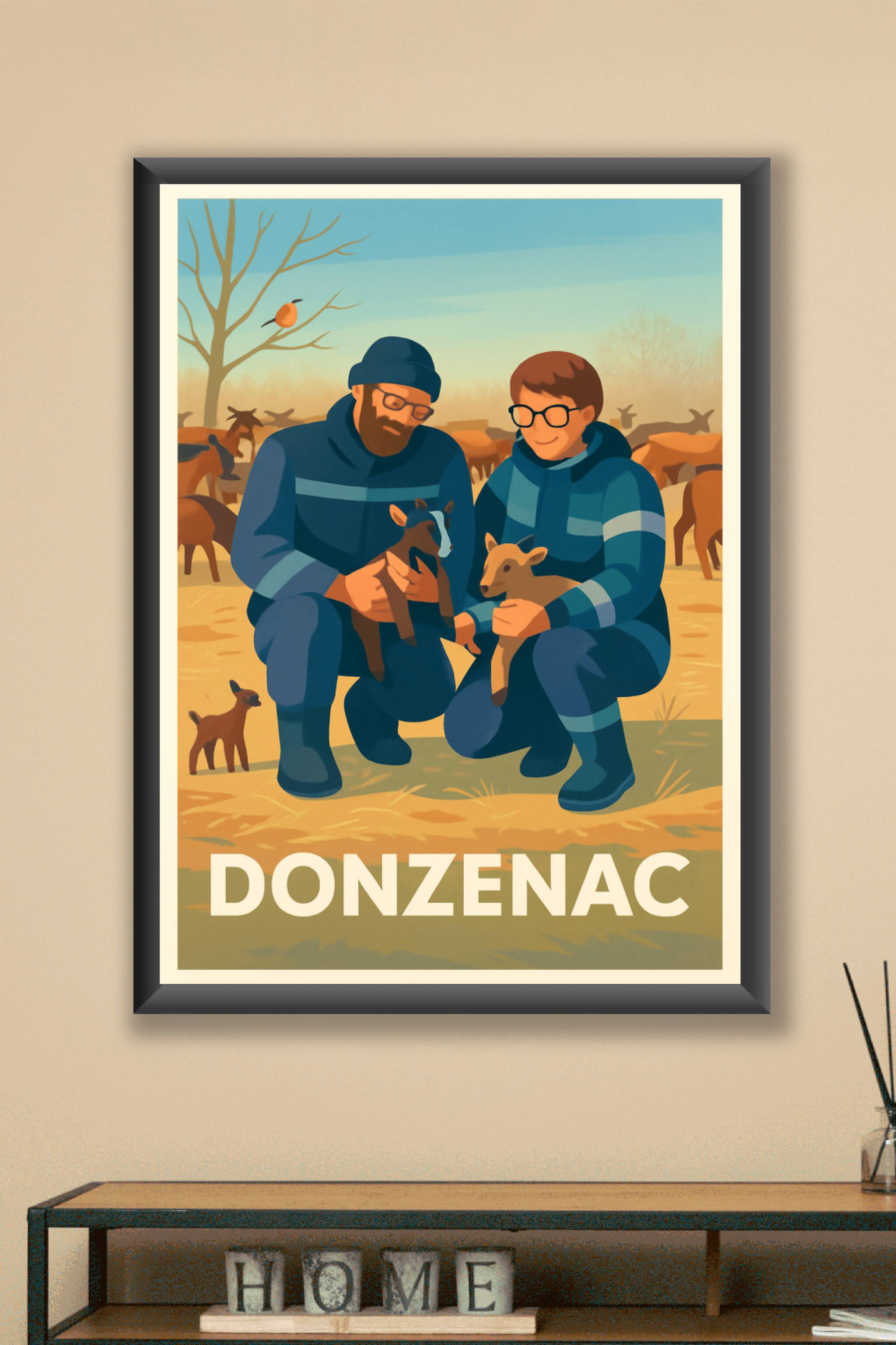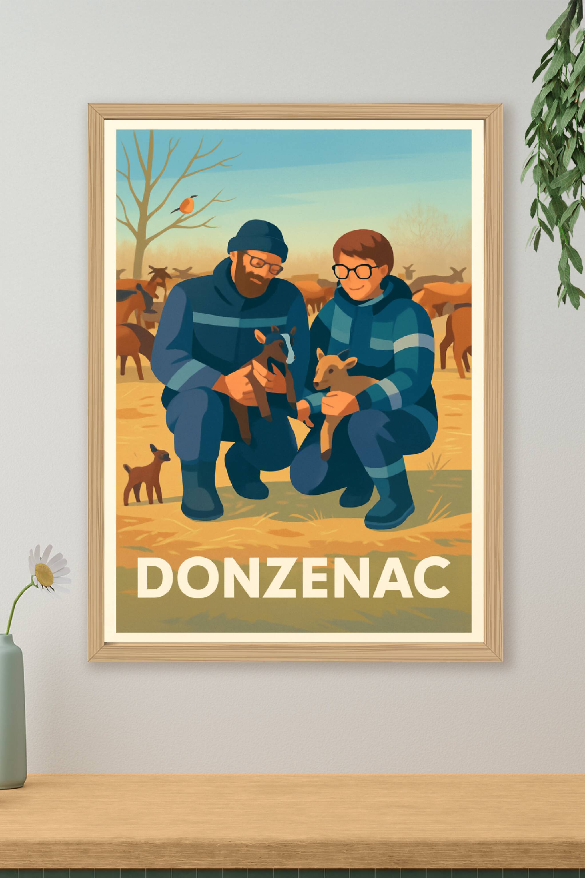 Découvrez la douceur de la vie rurale à Donzenac avec cette affiche illustrée représentant deux habitants prenant soin de leurs chevreaux dans un p...