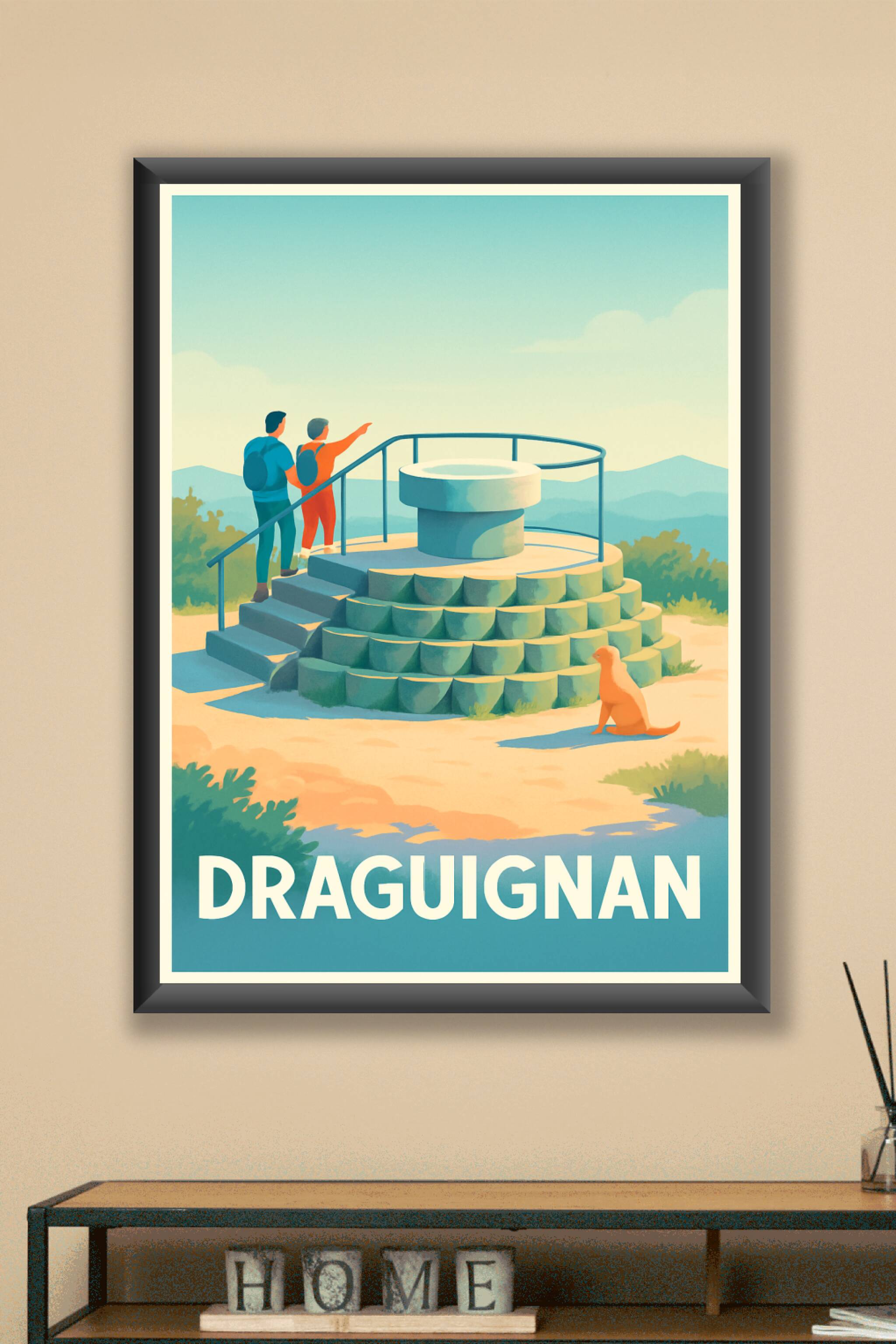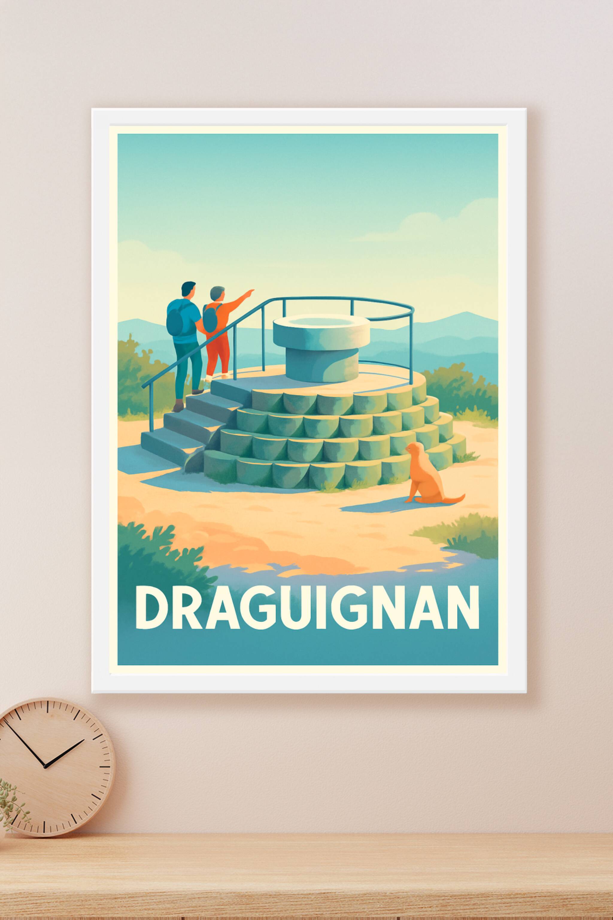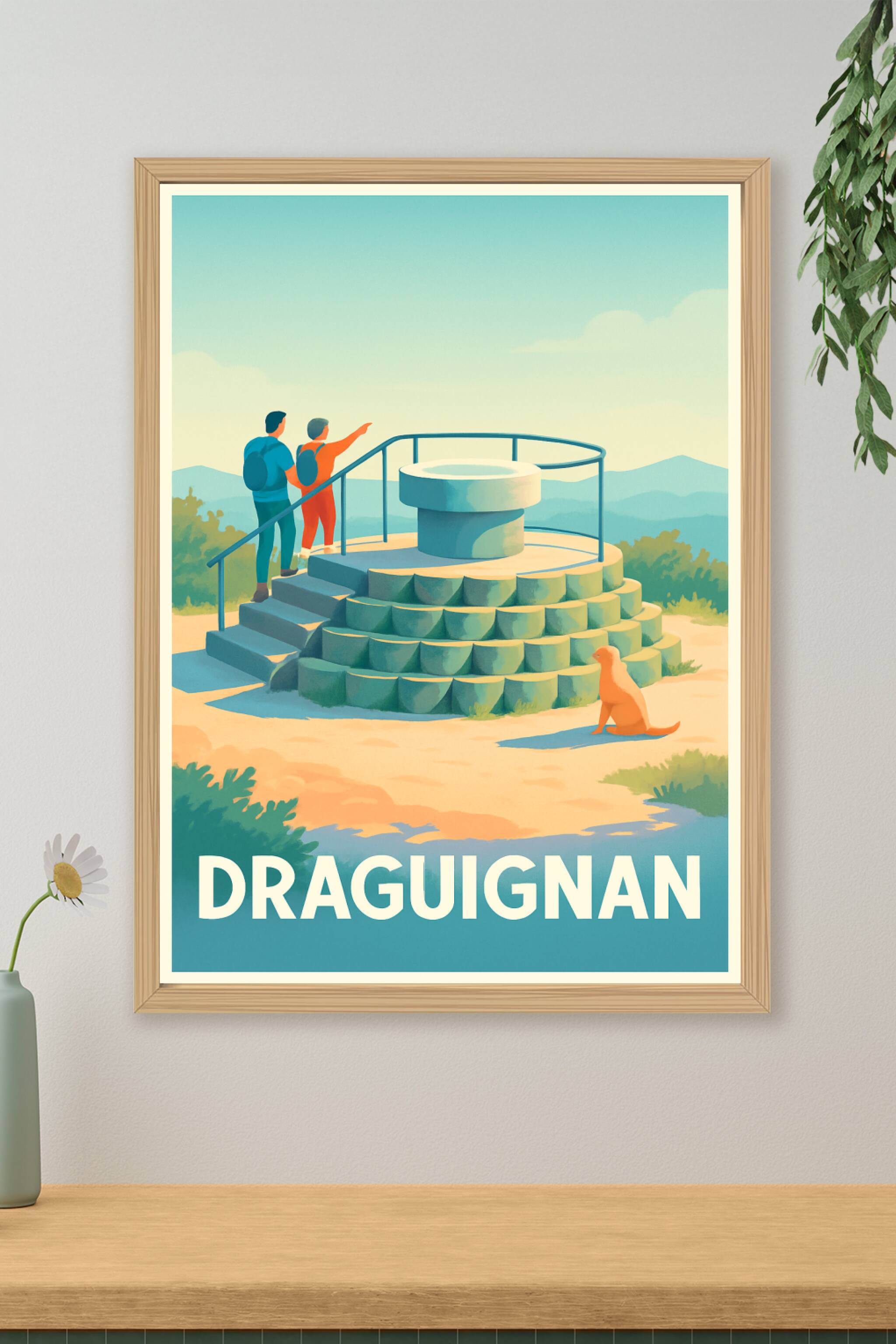 Cette affiche vintage met en scène un couple d'aventuriers contemplant le paysage depuis un point de vue emblématique de Draguignan, au cœur de la ...