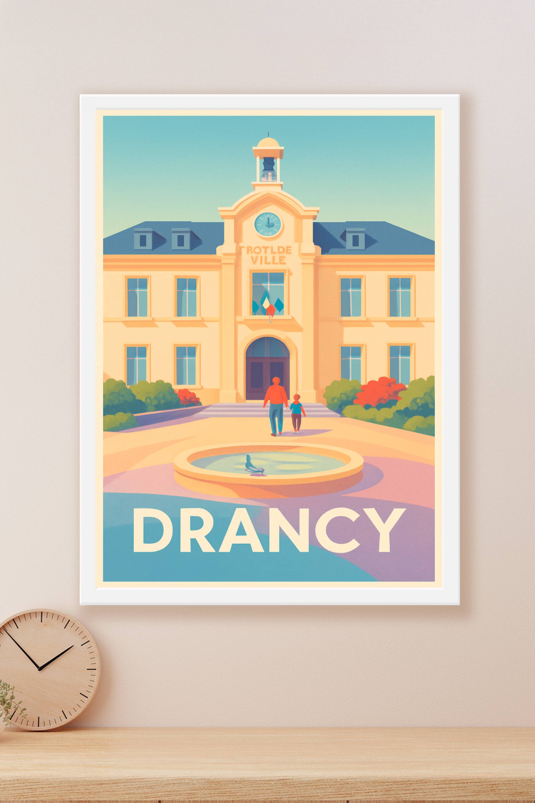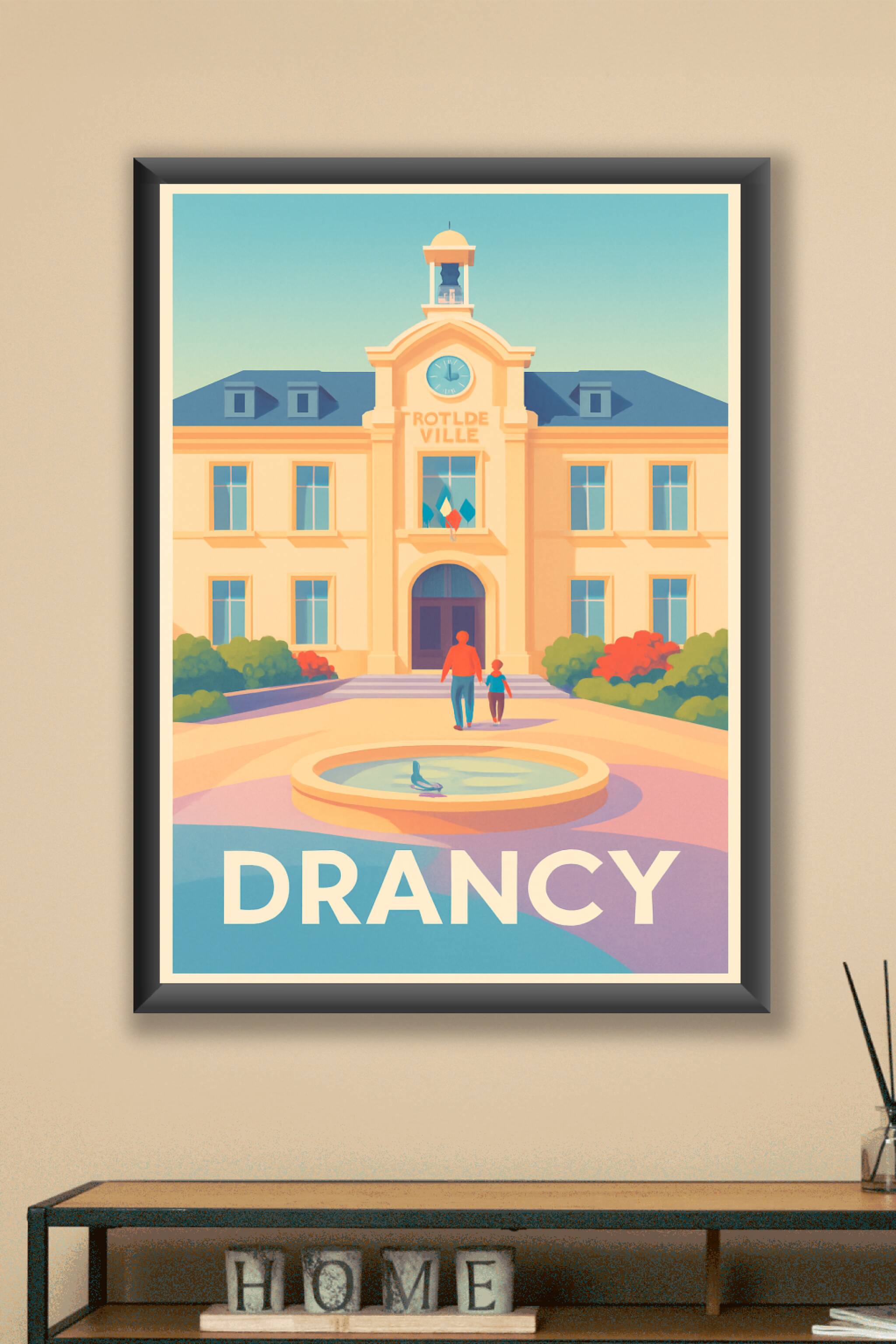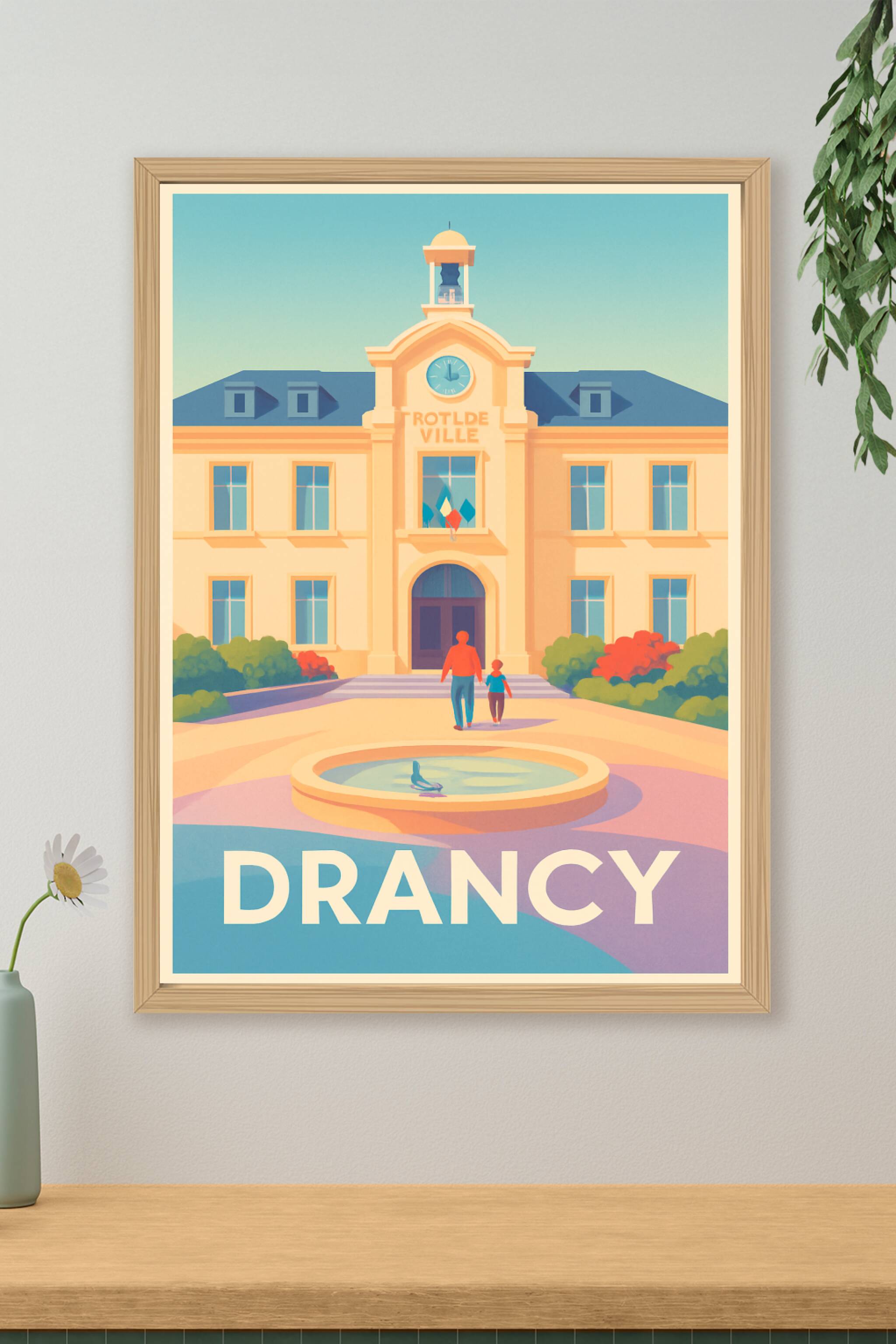 Découvrez cette magnifique affiche illustrant un bâtiment emblématique de Drancy, baigné dans une lumière douce et chaleureuse. Ce poster au style ...