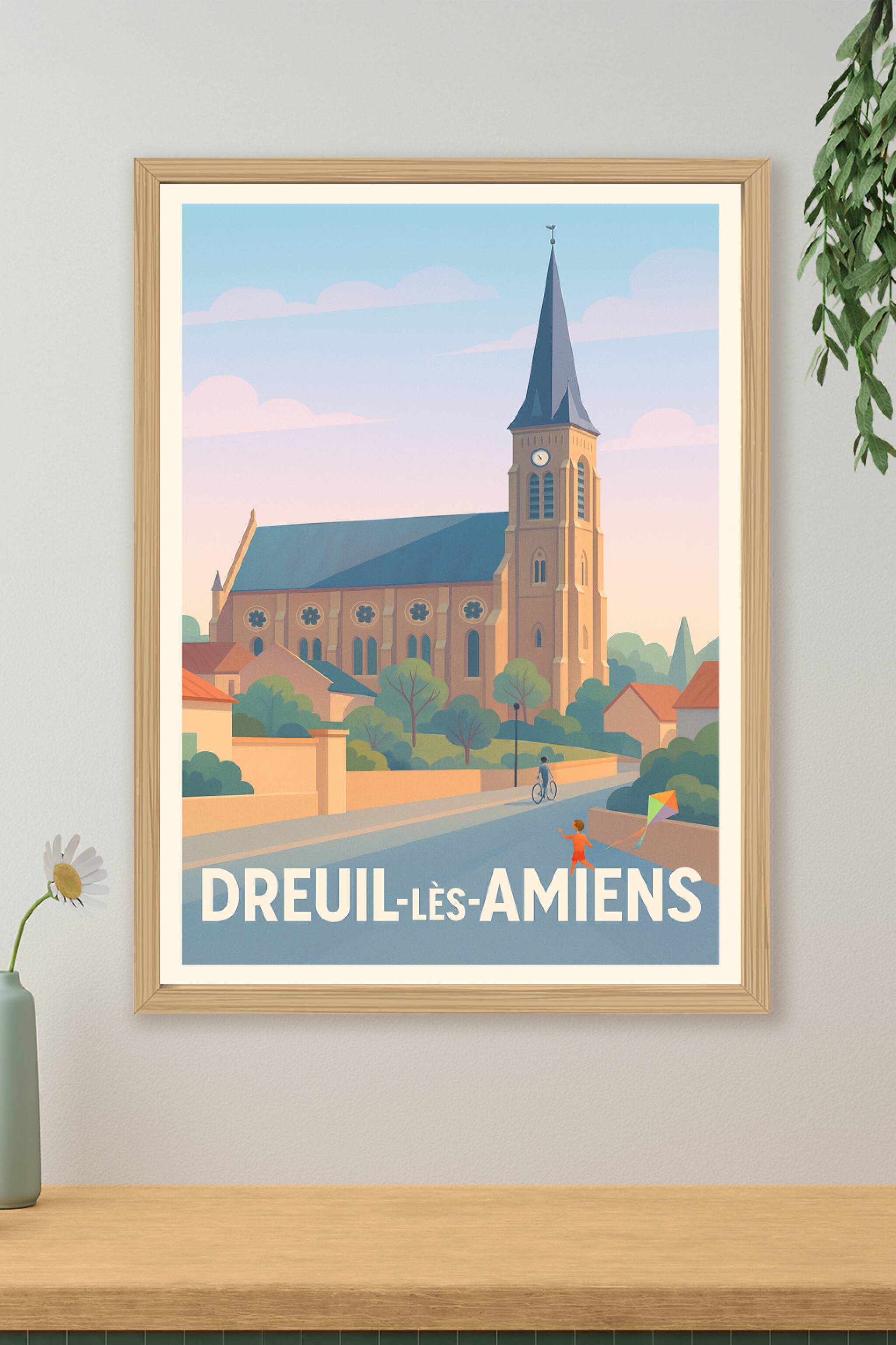 Découvrez la sérénité du village de Dreuil-lès-Amiens à travers cette affiche illustrée mettant en lumière son architecture emblématique et ses rue...