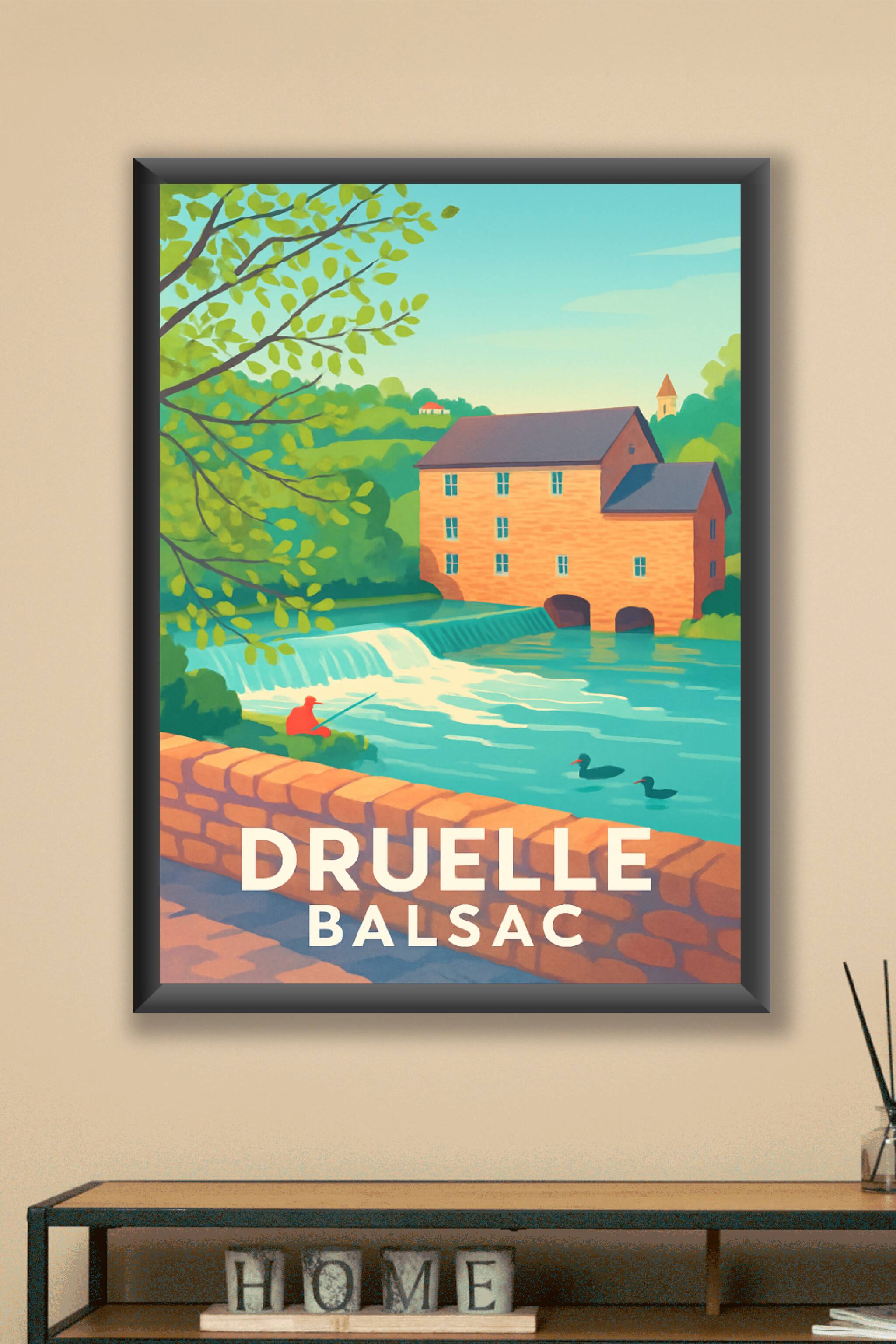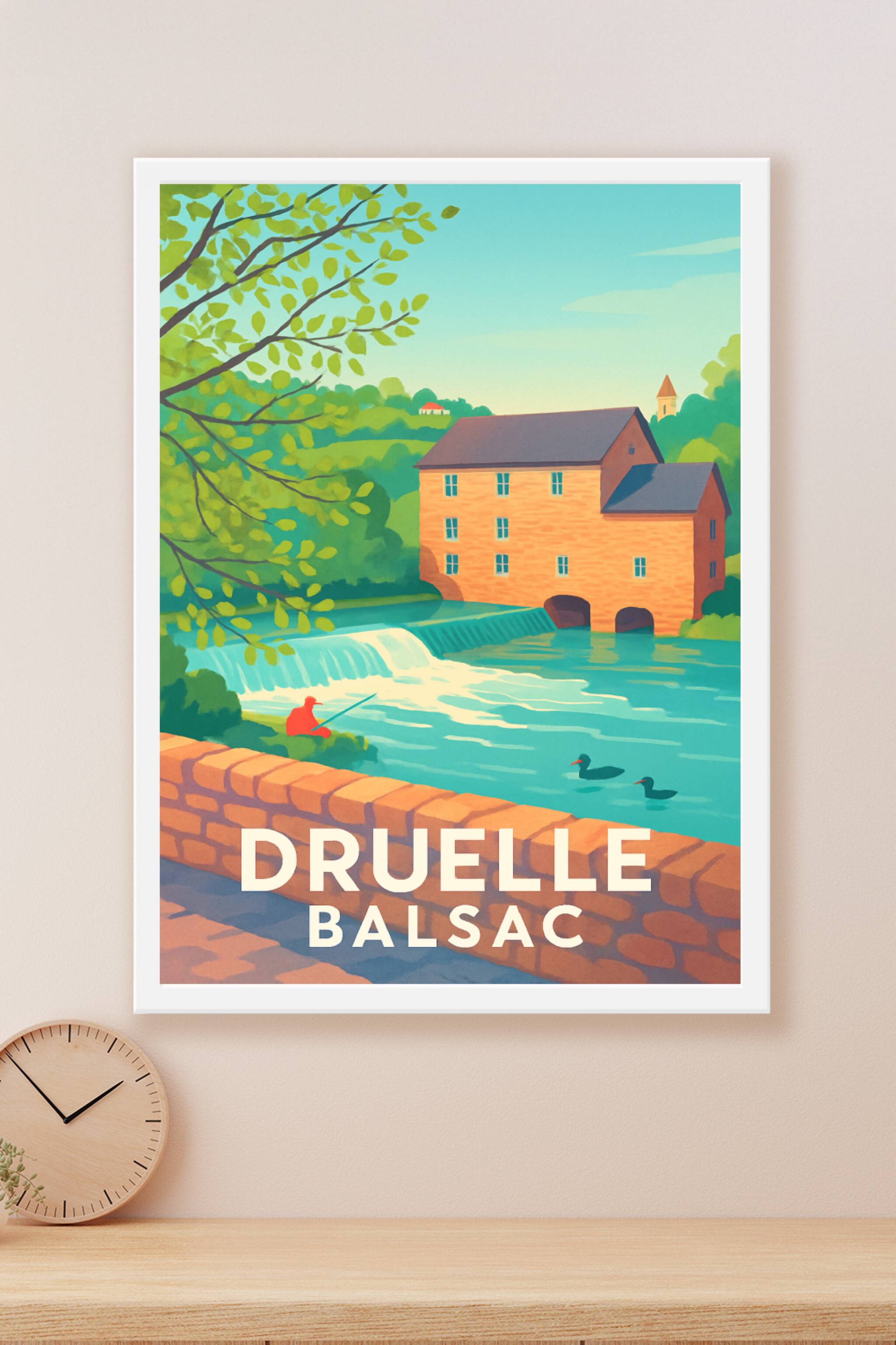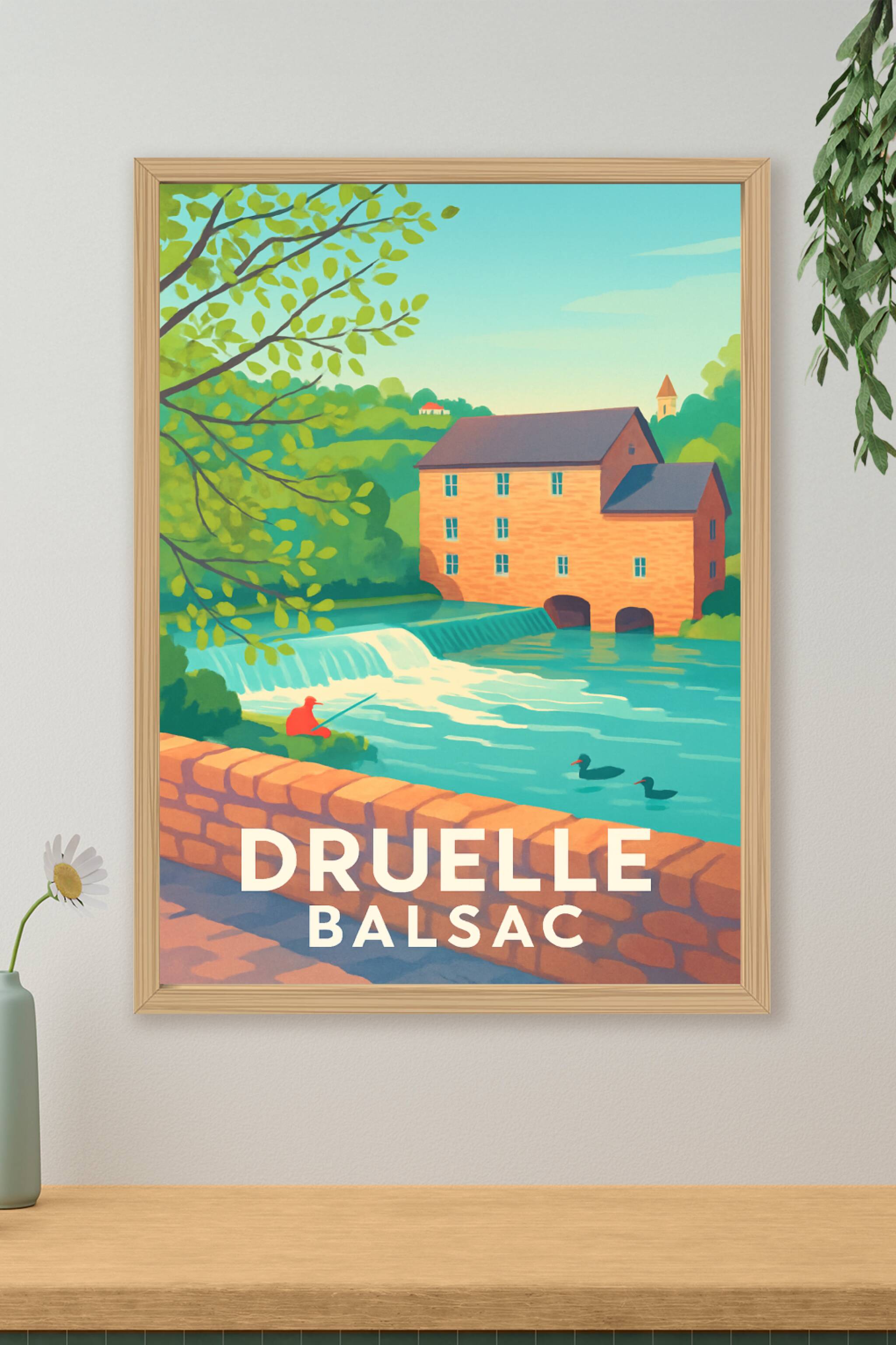 Découvrez la douceur de vivre de Druelle avec cette affiche illustrée mettant en scène le charmant paysage de Balsac, entre rivière paisible et arc...