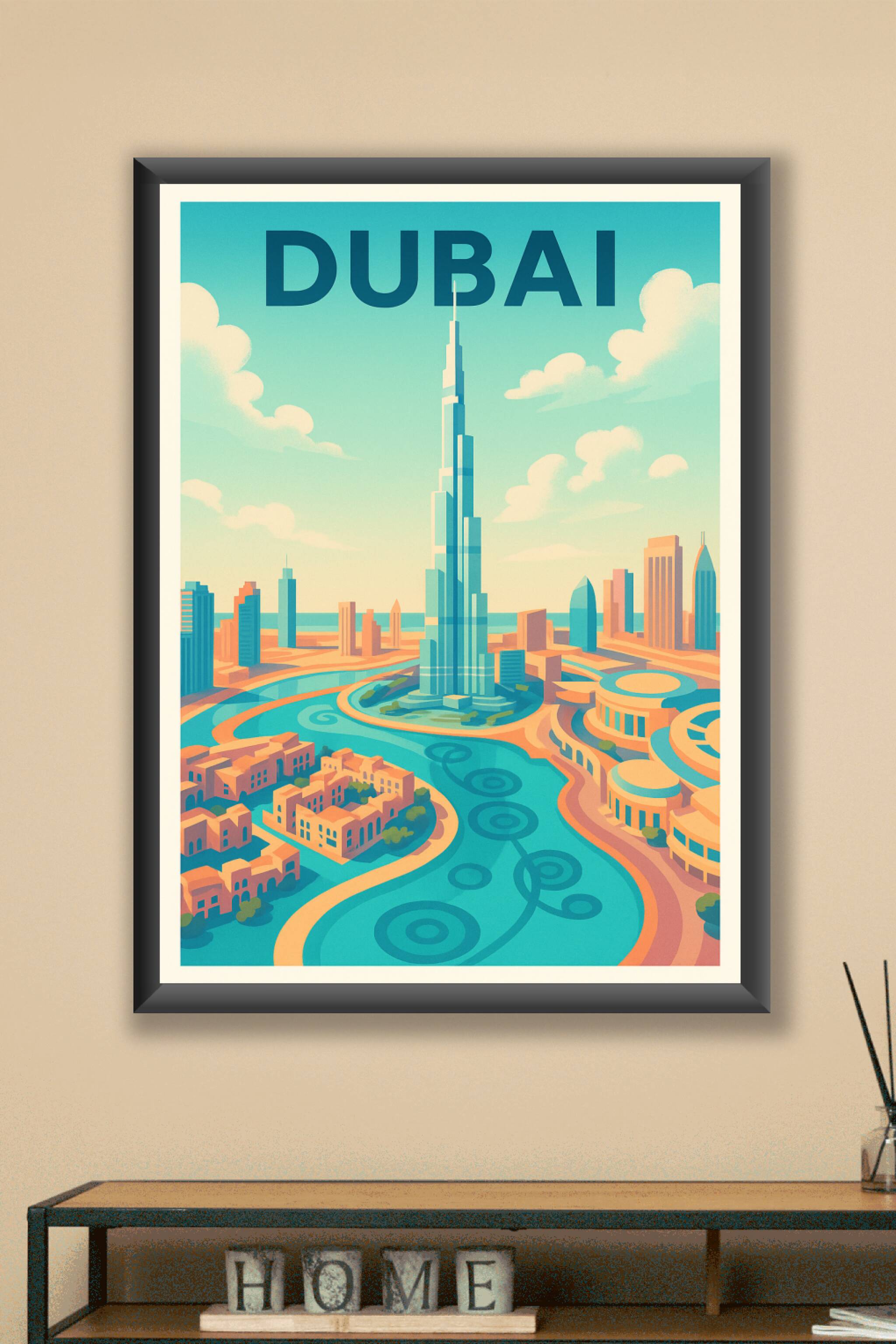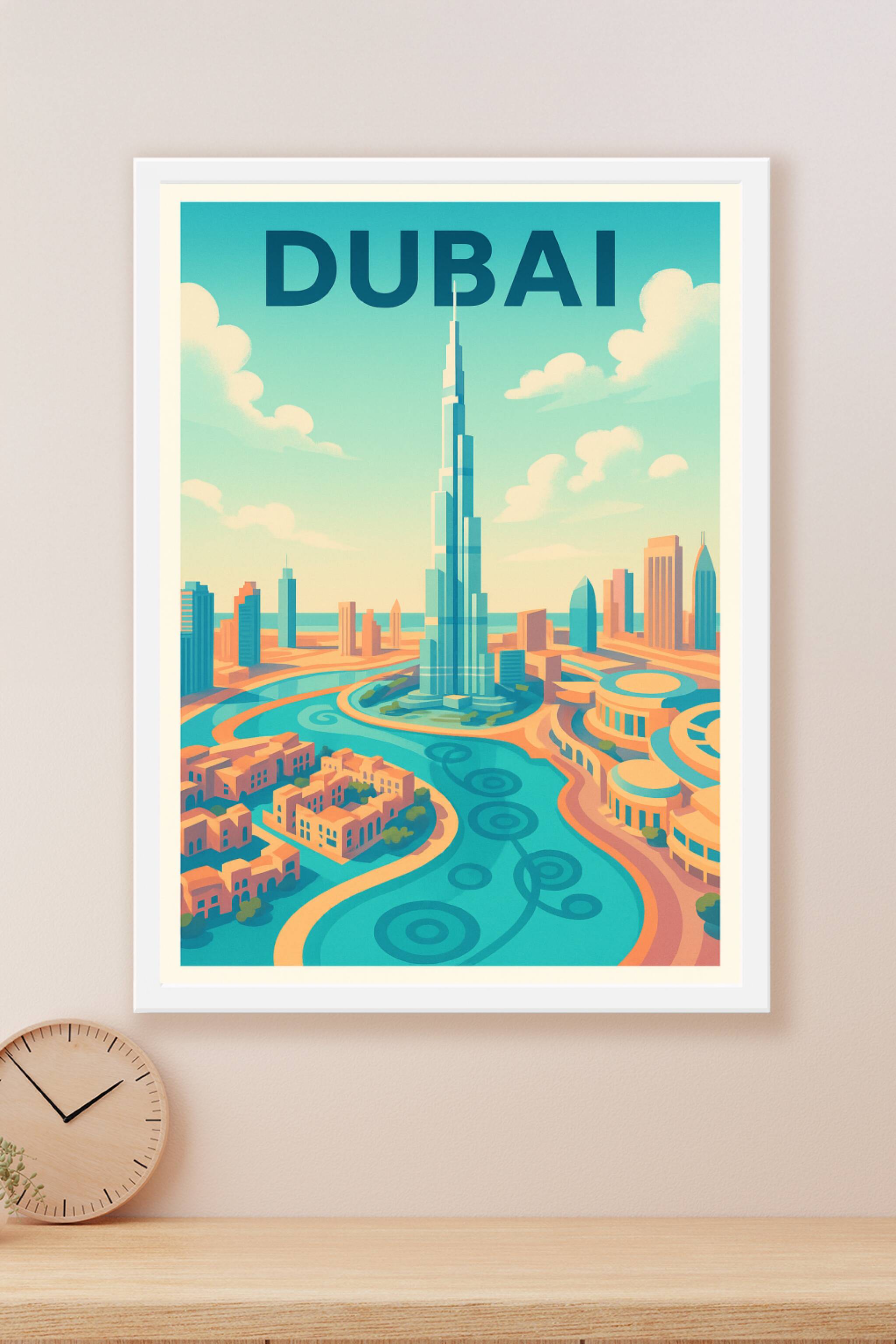 Découvrez la majesté de Dubai avec cette affiche illustrée d'un style moderne et lumineux mettant en valeur le célèbre Burj Khalifa et ses environs...