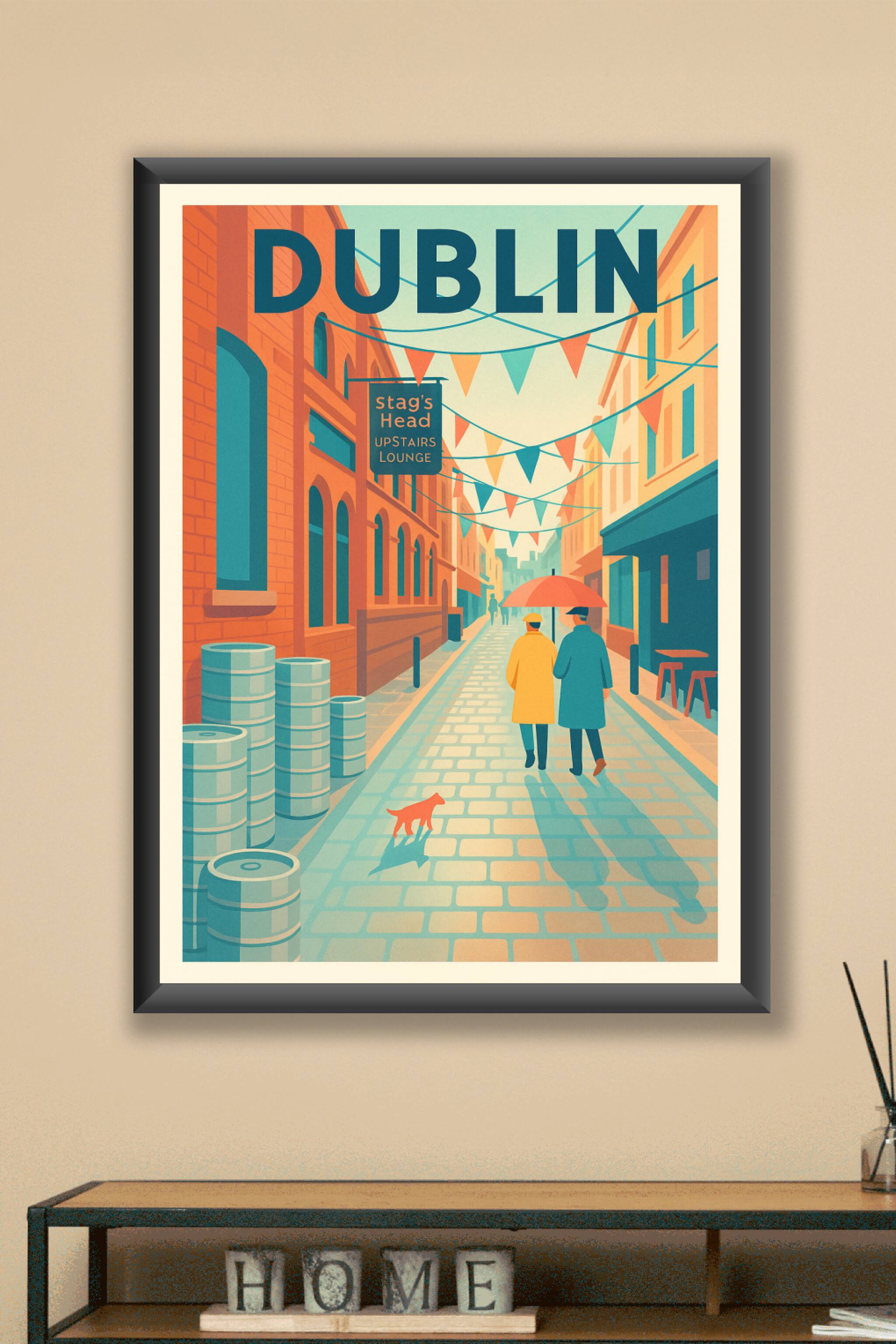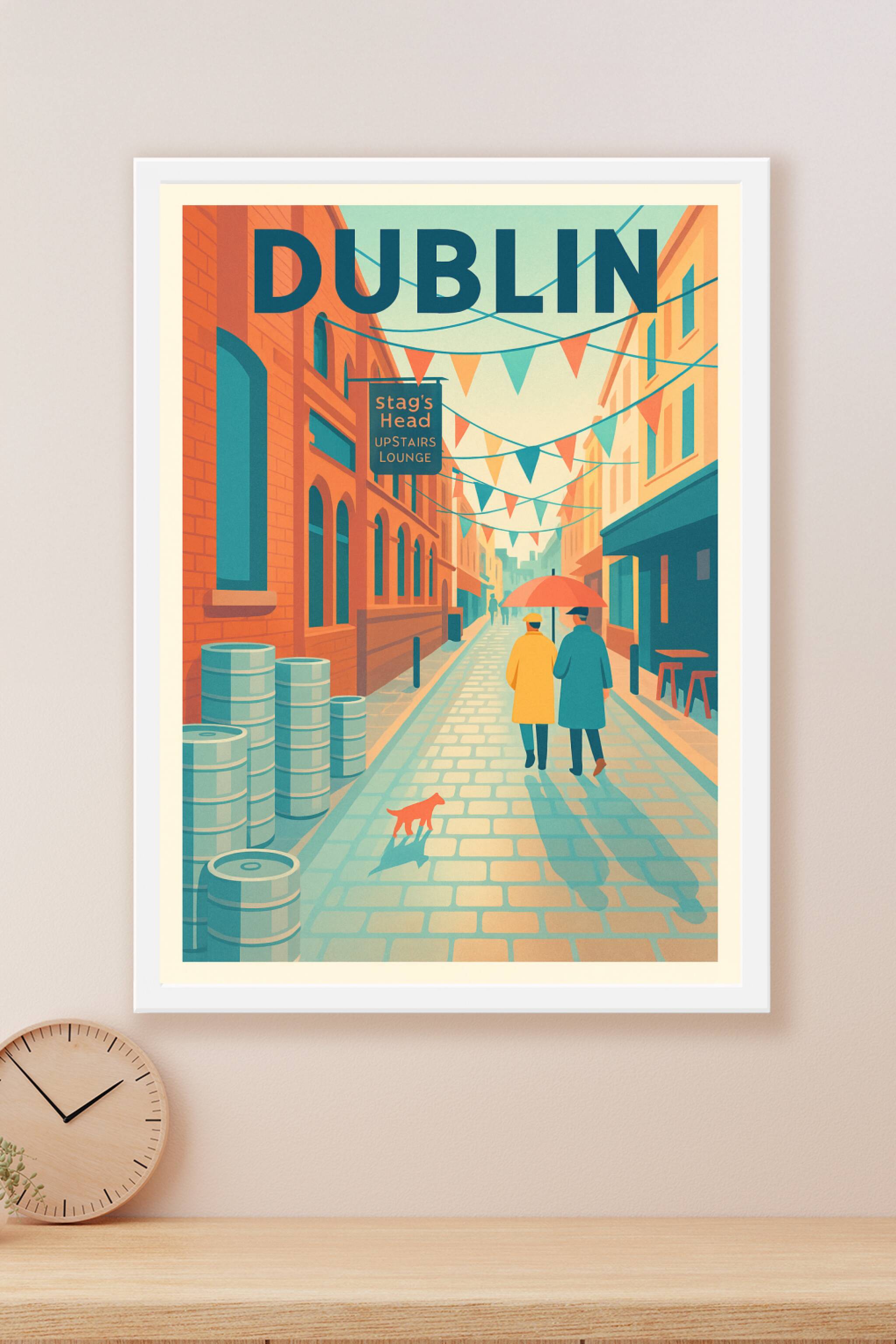 Découvrez l'atmosphère unique de Dublin avec cette affiche vintage illustrant une ruelle pavée ornée de guirlandes colorées, deux passants sous un ...