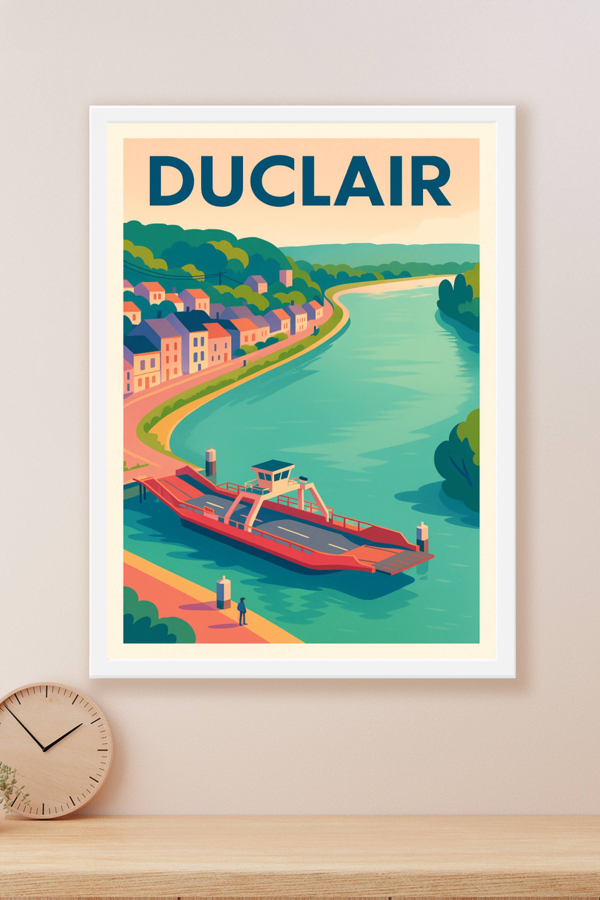 Découvrez la sérénité de Duclair à travers cette affiche au design épuré et coloré, mettant en scène la célèbre traversée en bac sur la Seine et le...