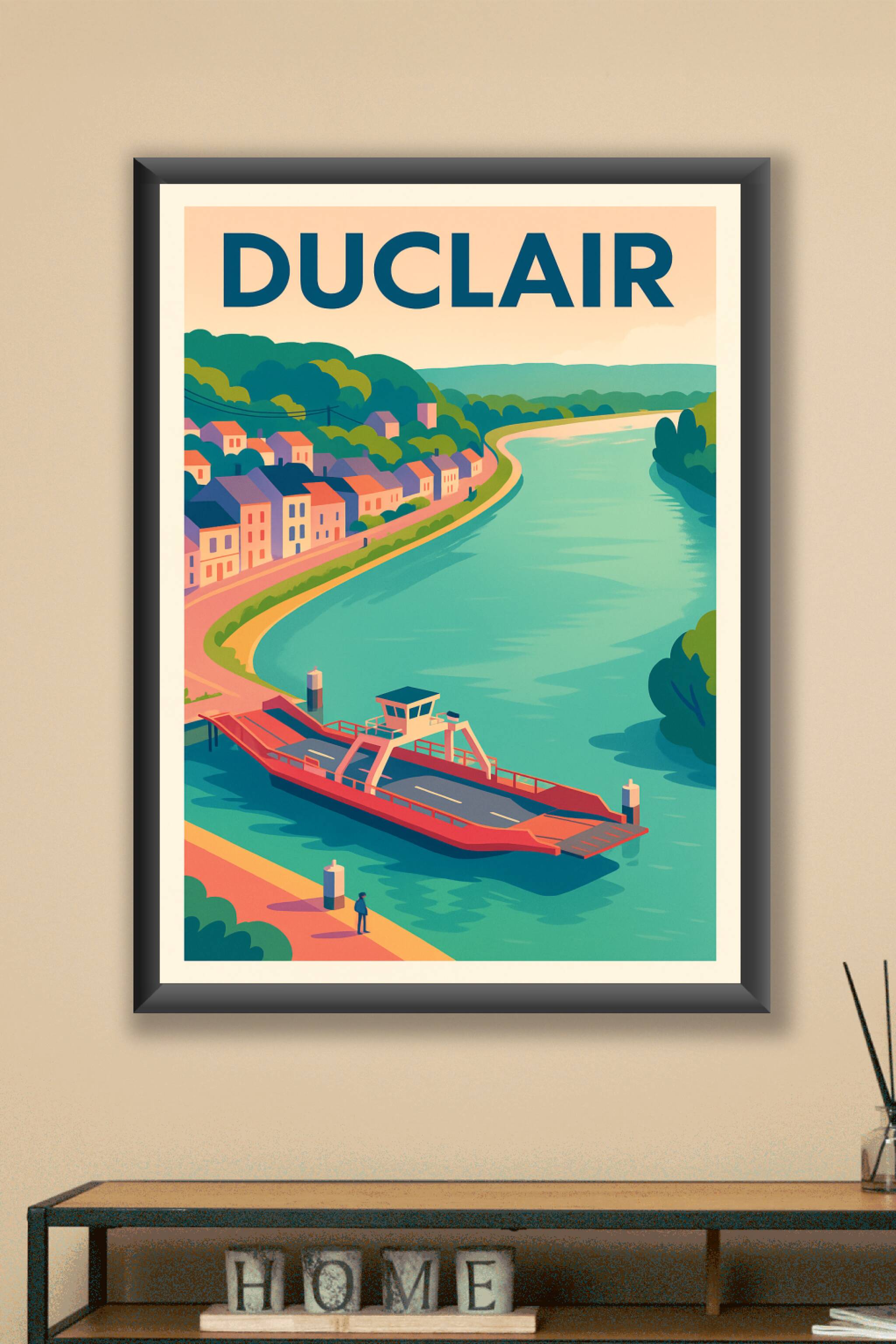 Découvrez la sérénité de Duclair à travers cette affiche au design épuré et coloré, mettant en scène la célèbre traversée en bac sur la Seine et les maisons pittoresques bordant la rivière. Ce poster invite à un voyage visuel dans cette charmante ville normande, célèbre pour son environnement naturel et son patrimoine fluvial. Imprimée en tirage "Fine Art" sur papier 305g coton de haute qualité, cette affiche offre des couleurs profondes et une finition exceptionnelle. Disponible en formats A1 à A4, avec ou sans cadre, c’est une pièce parfaite pour sublimer votre décoration intérieure ou offrir un souvenir unique à un amateur de paysages français. Profitez d'une impression premium 100% fabriquée en France pour embellir votre intérieur avec style et authenticité.