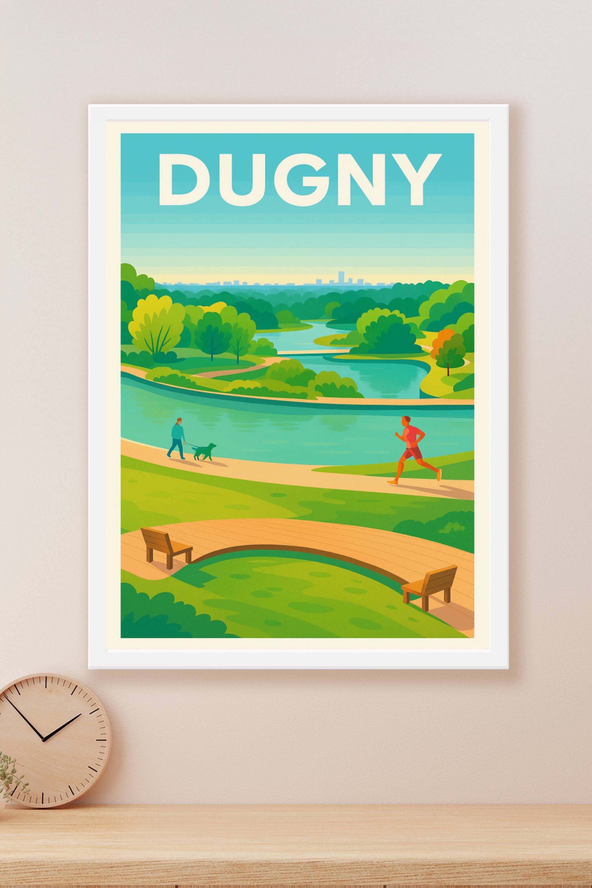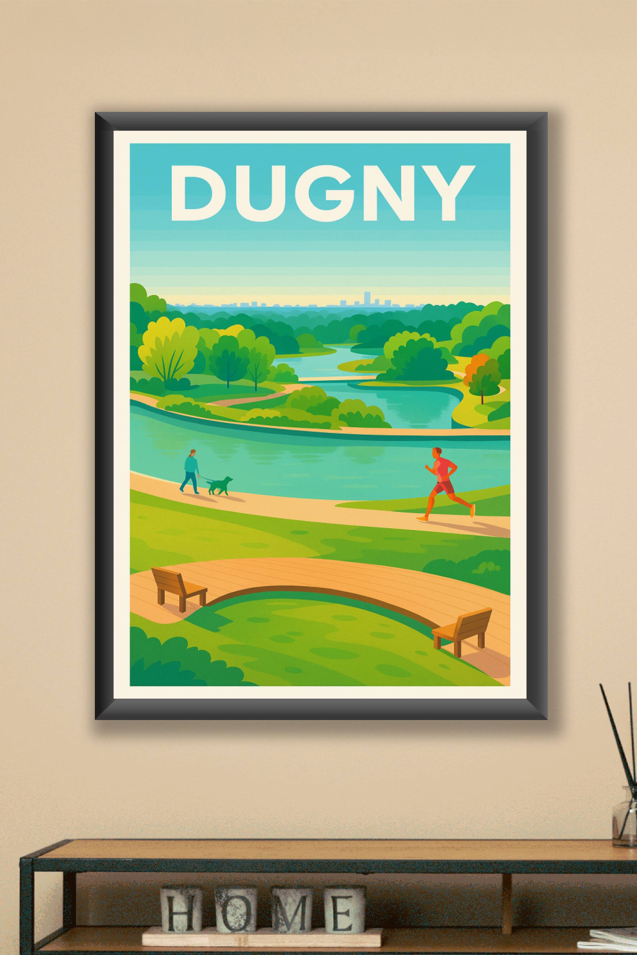 Découvrez l'affiche Dugny, une invitation à la tranquillité au cœur d'un paysage verdoyant et apaisant. Représentant un parc accueillant avec ses s...