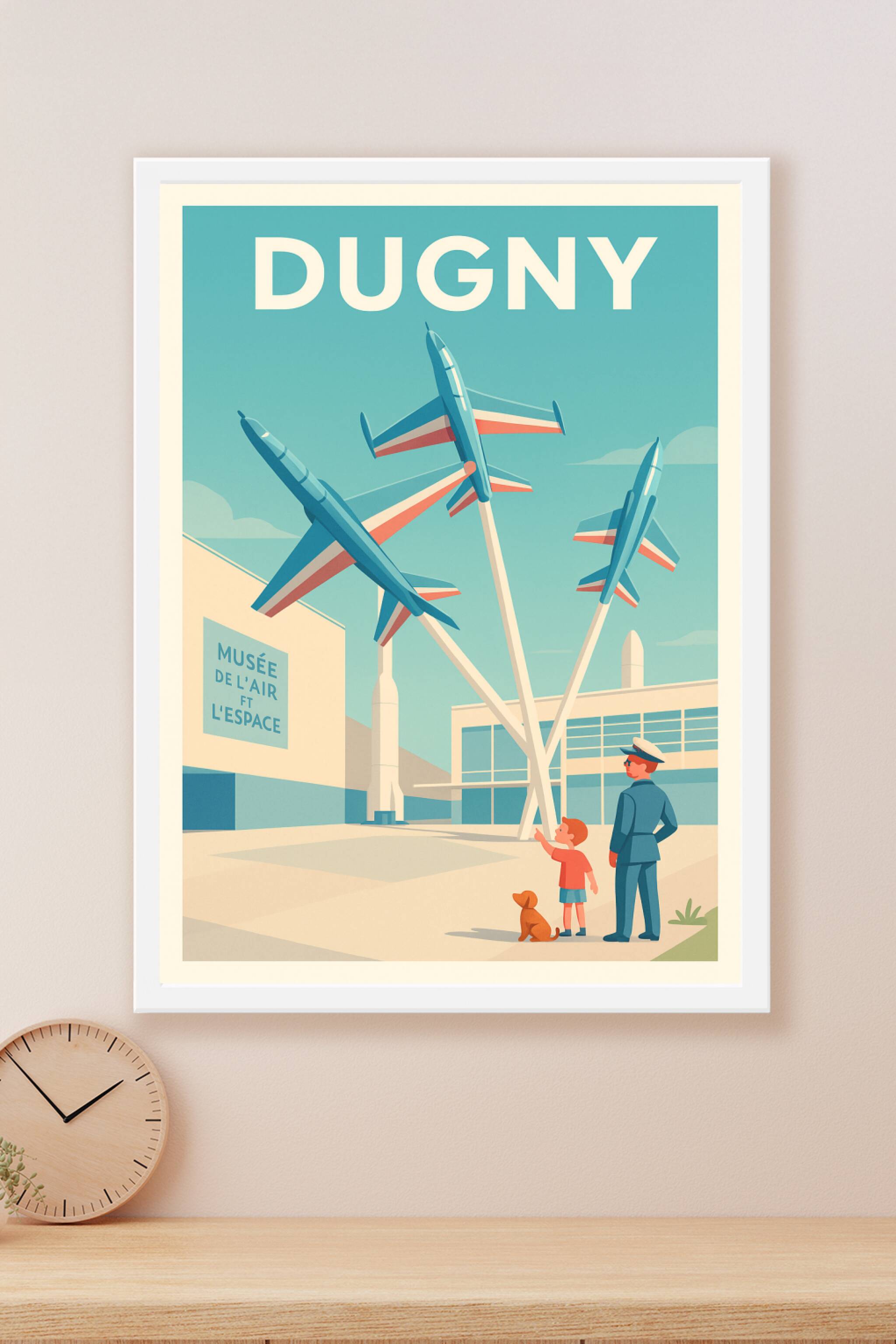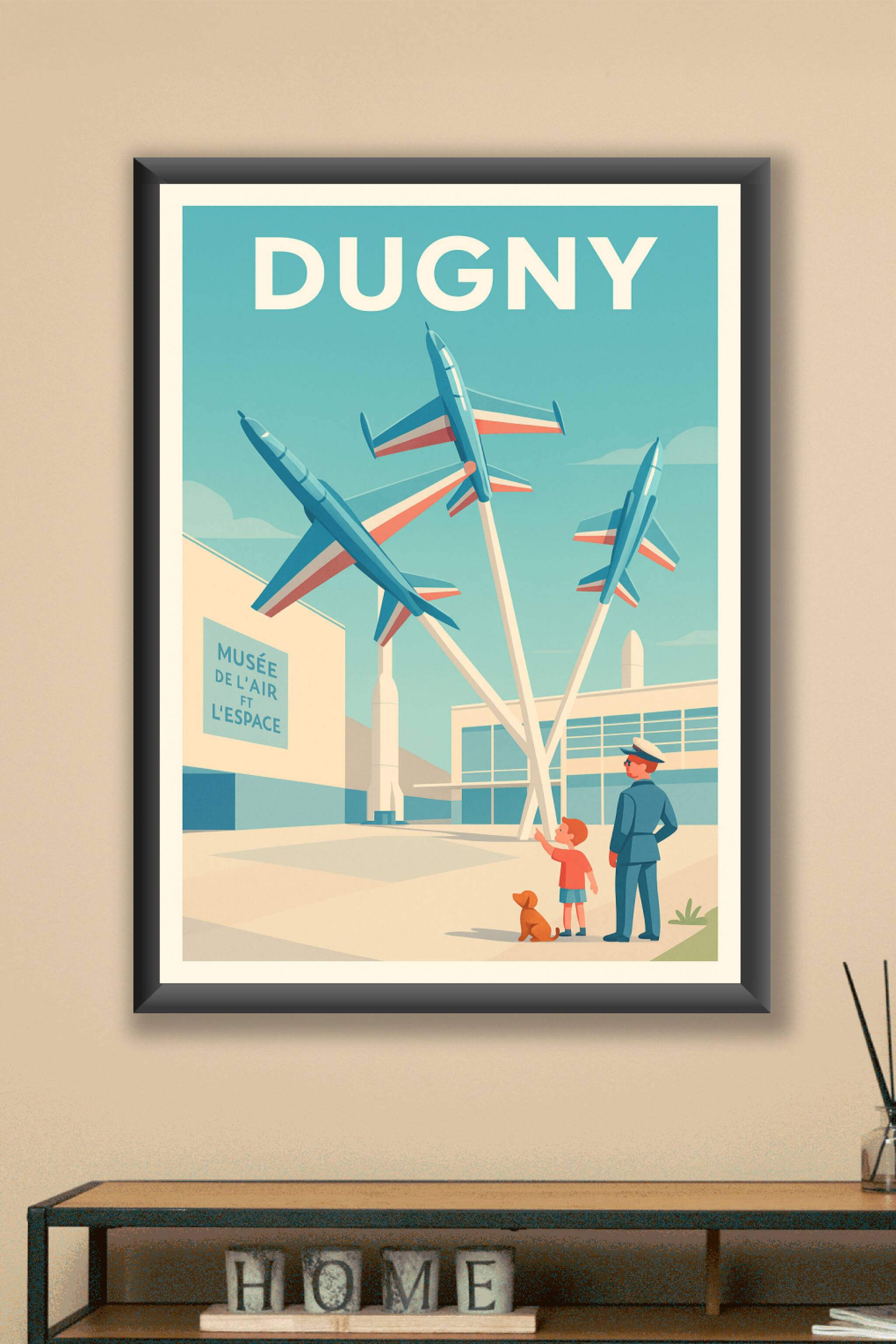 Découvrez la magie du Musée de l'Air et de l'Espace de Dugny avec cette affiche illustrée au style rétro et épuré. Trois avions aux couleurs tricol...