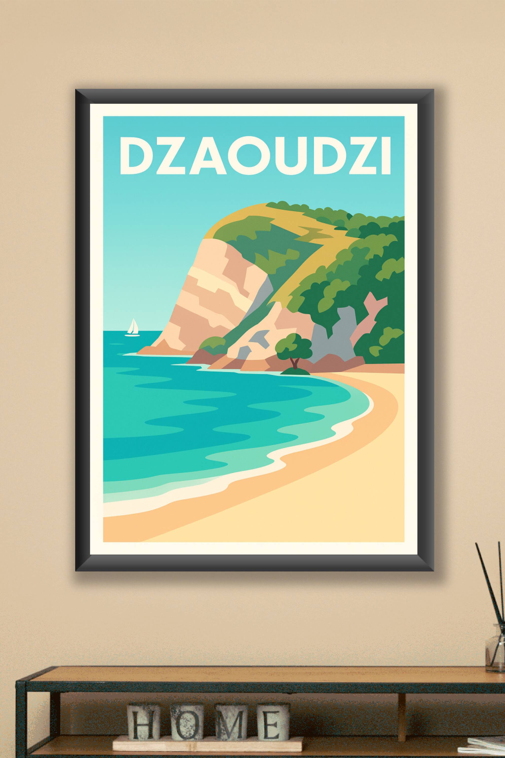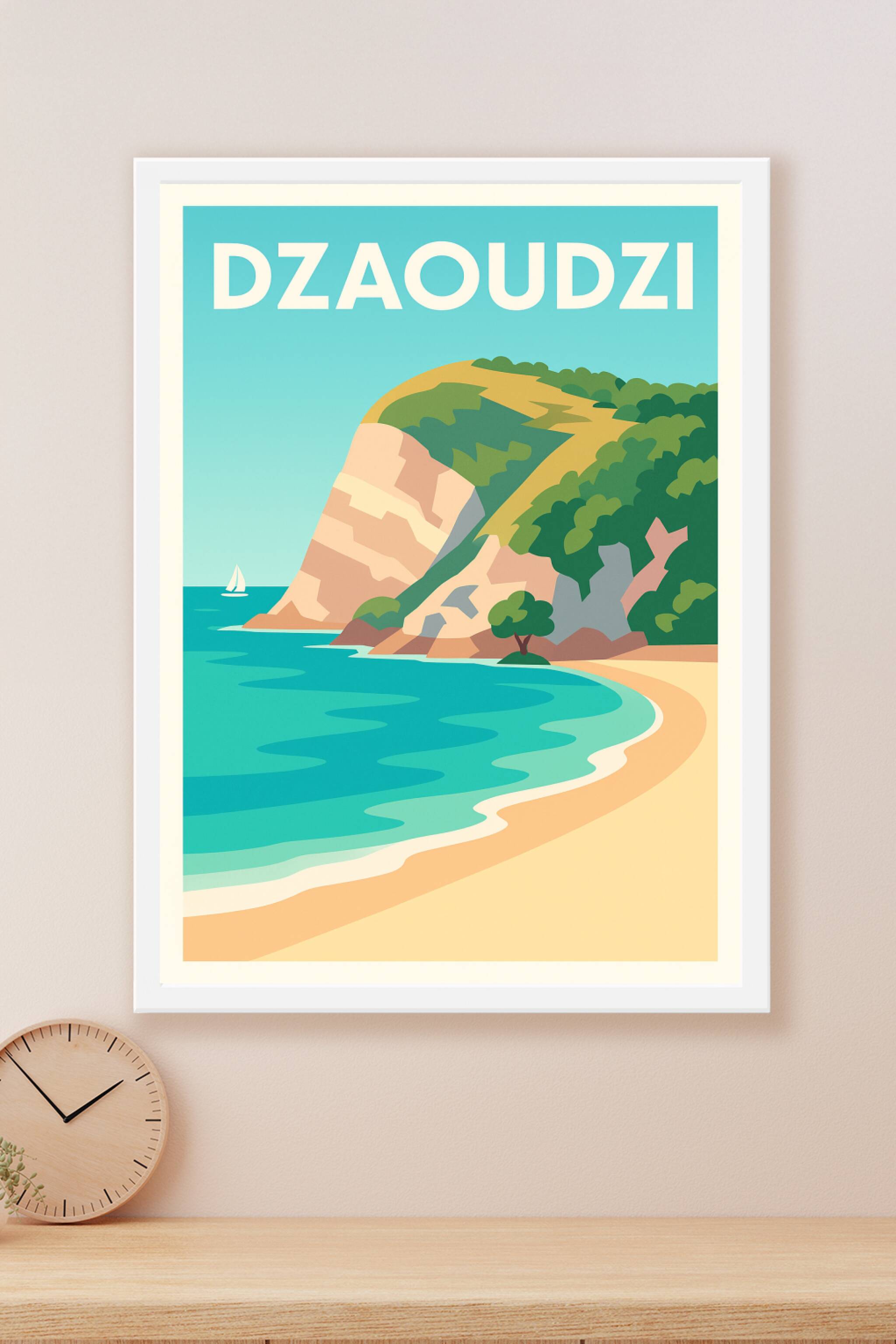Découvrez la beauté sauvage et apaisante de Dzaoudzi à travers cette affiche au design épuré et moderne. Le poster illustre une plage bordée de fal...