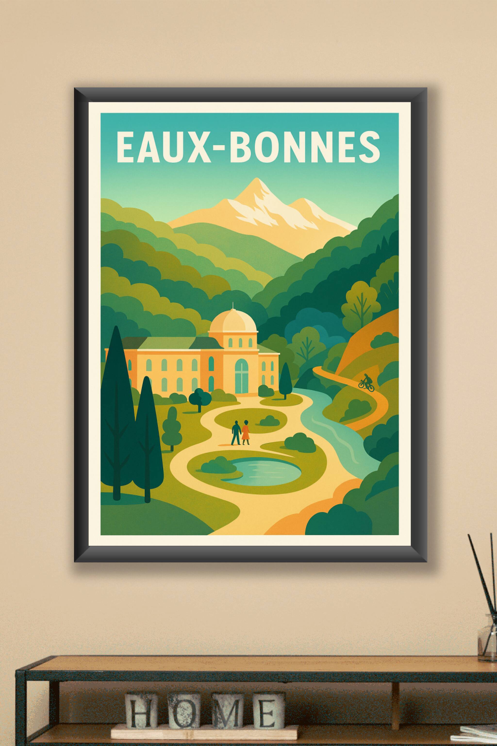 Découvrez la sérénité d'Eaux-Bonnes avec cette affiche illustrée qui capture l'harmonie entre architecture élégante et paysages verdoyants. Représe...
