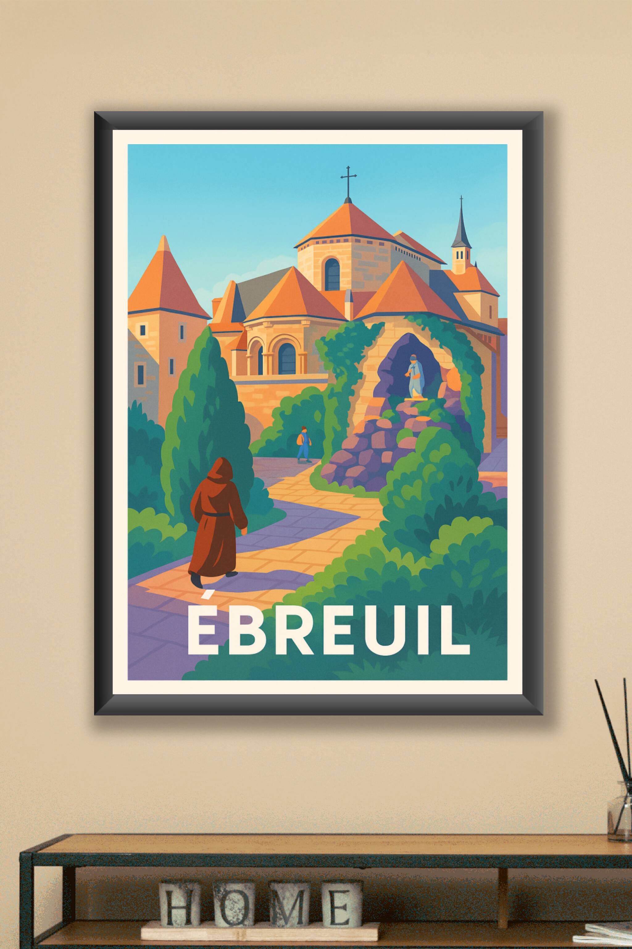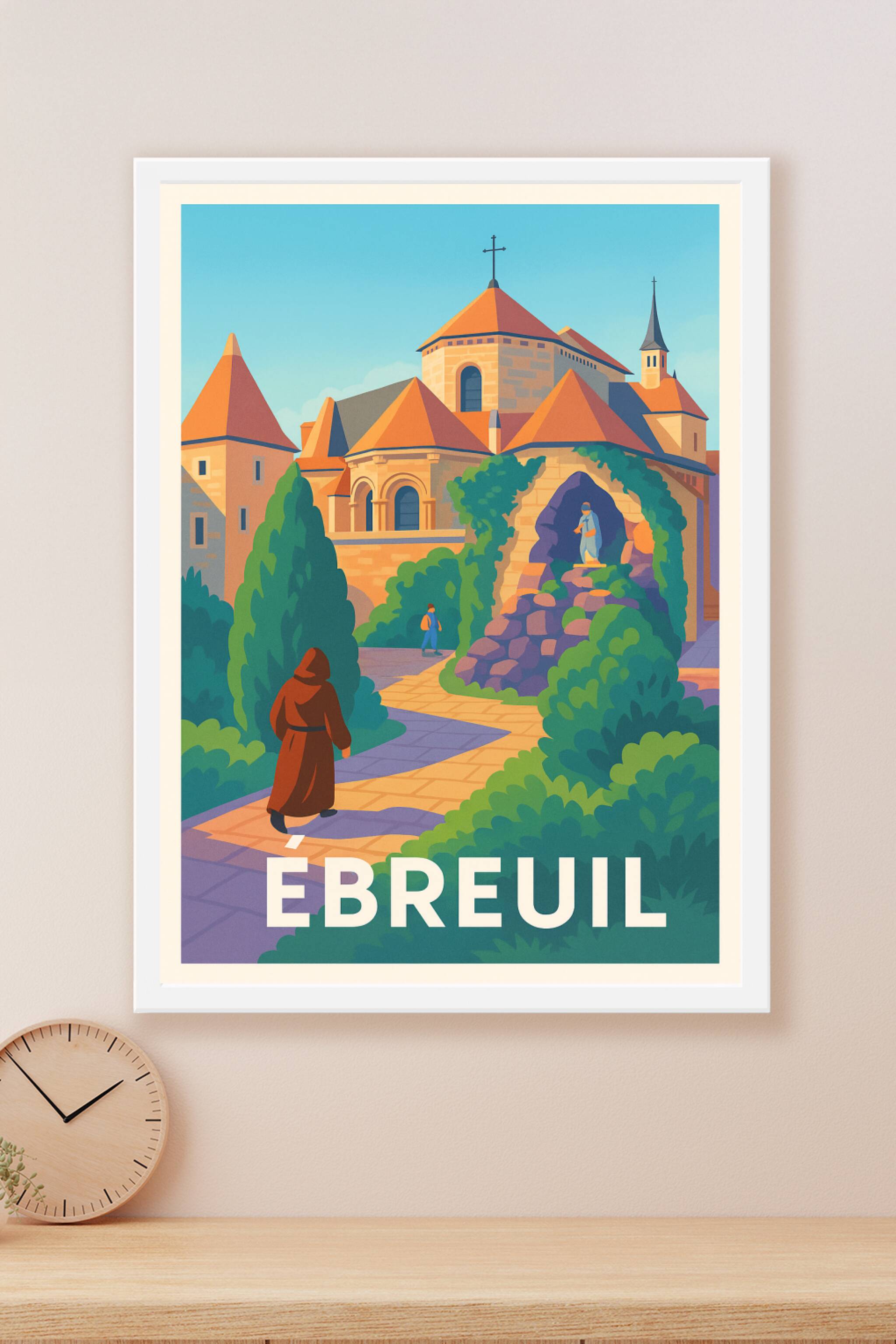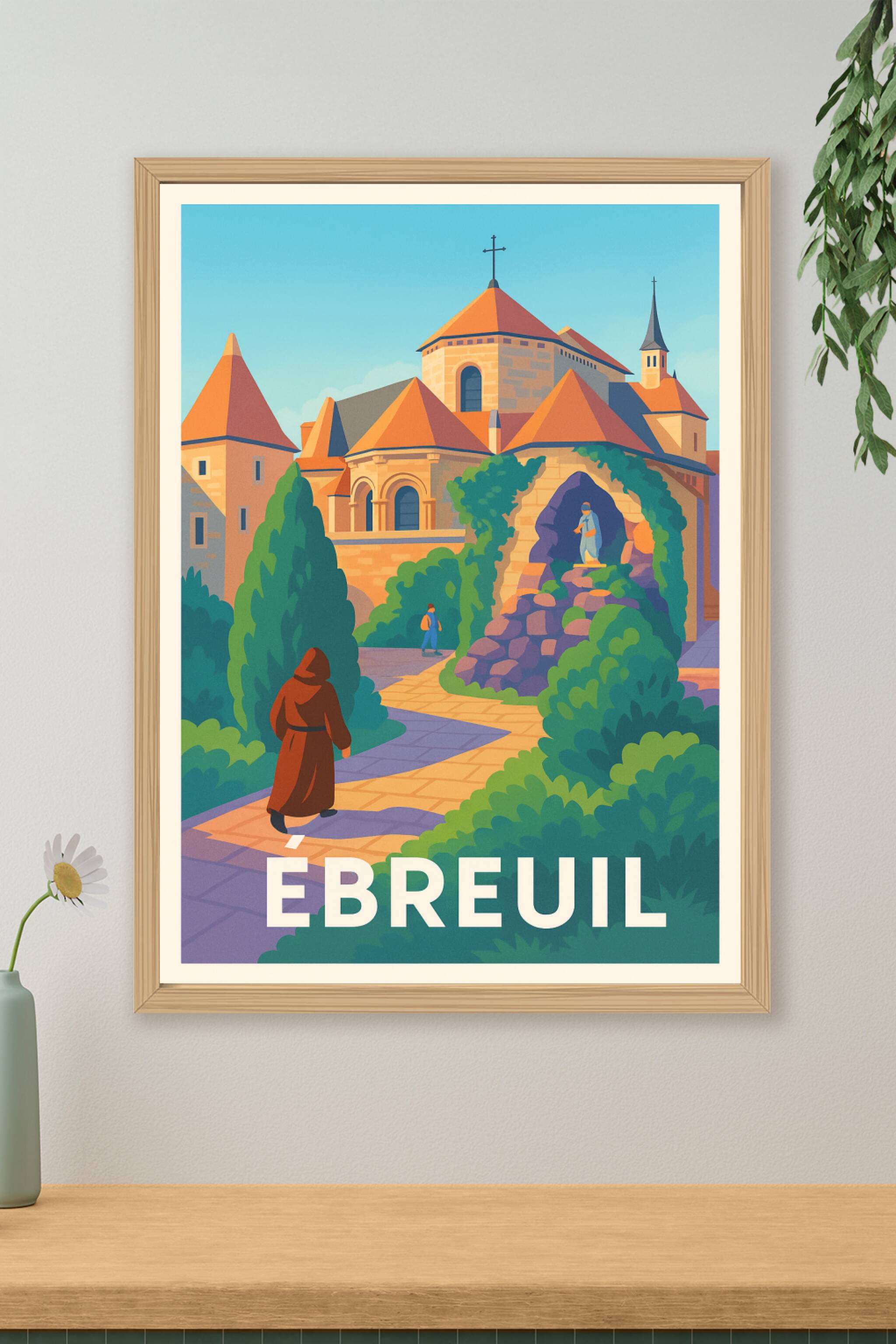 Découvrez la sérénité d'Ébreuil à travers cette affiche illustrée mettant en scène ses charmants monuments religieux et son cadre verdoyant. Cette ...