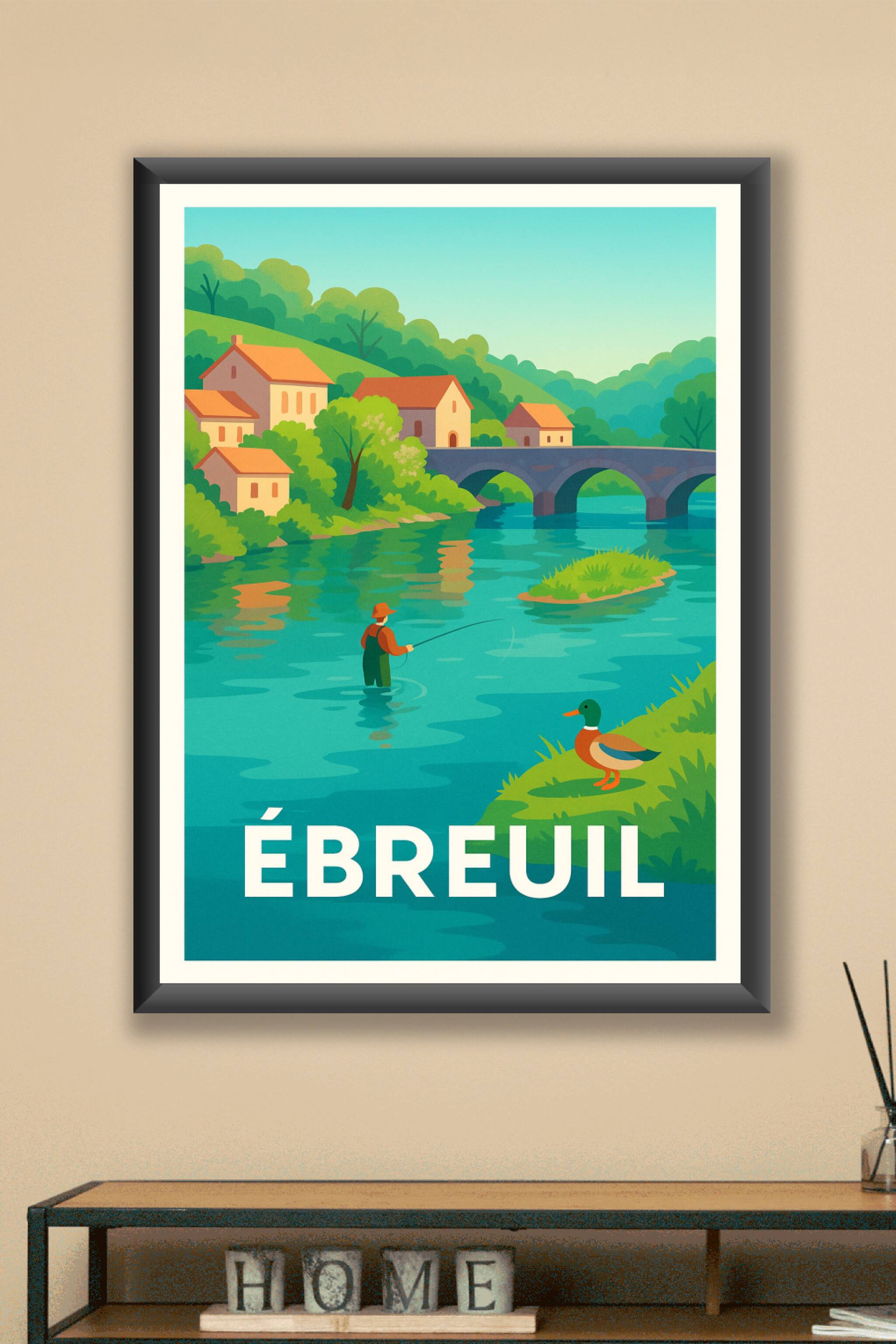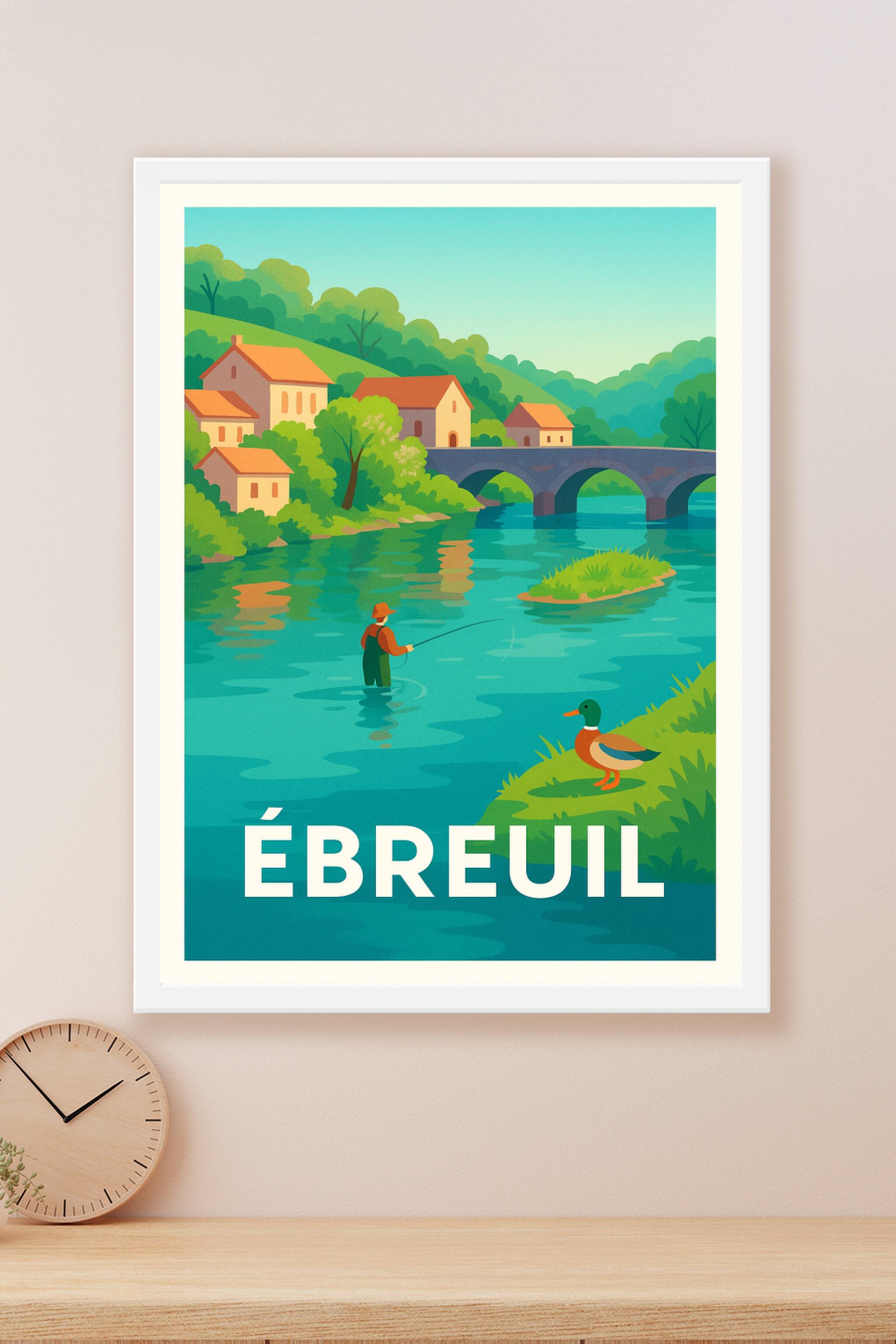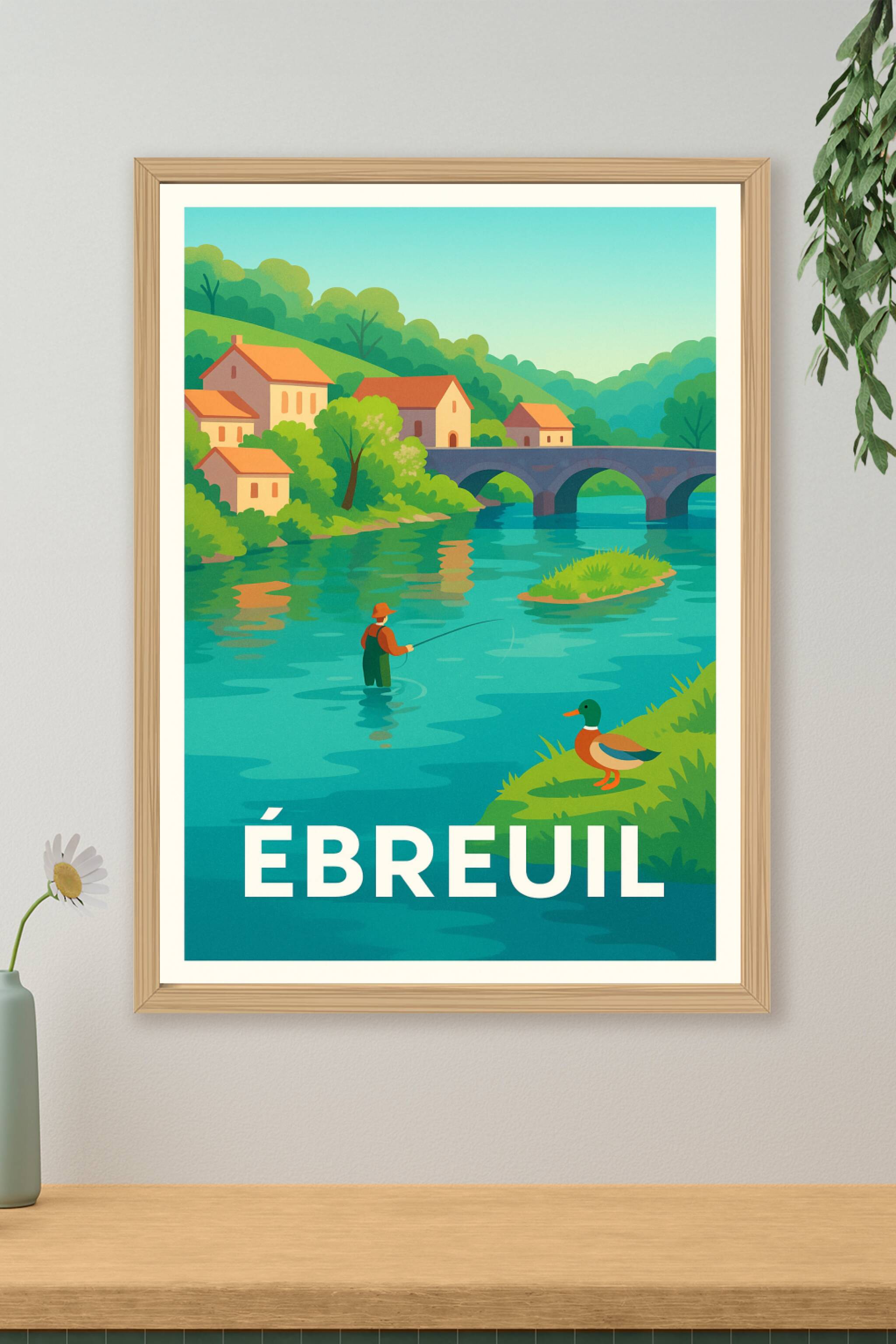 Découvrez la tranquillité d'Ébreuil à travers cette magnifique affiche illustrée, qui capture une scène paisible de pêche au bord de la rivière, en...