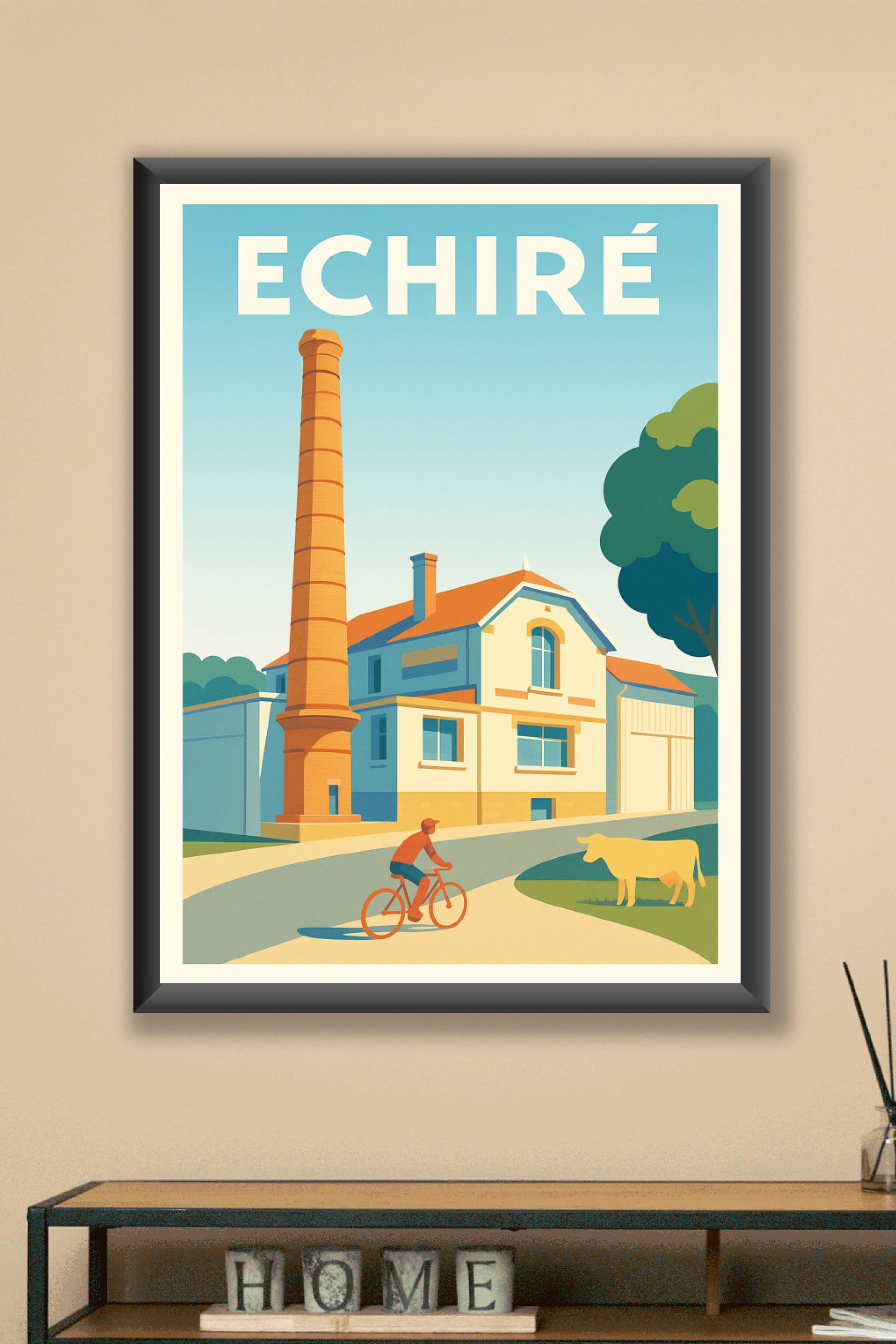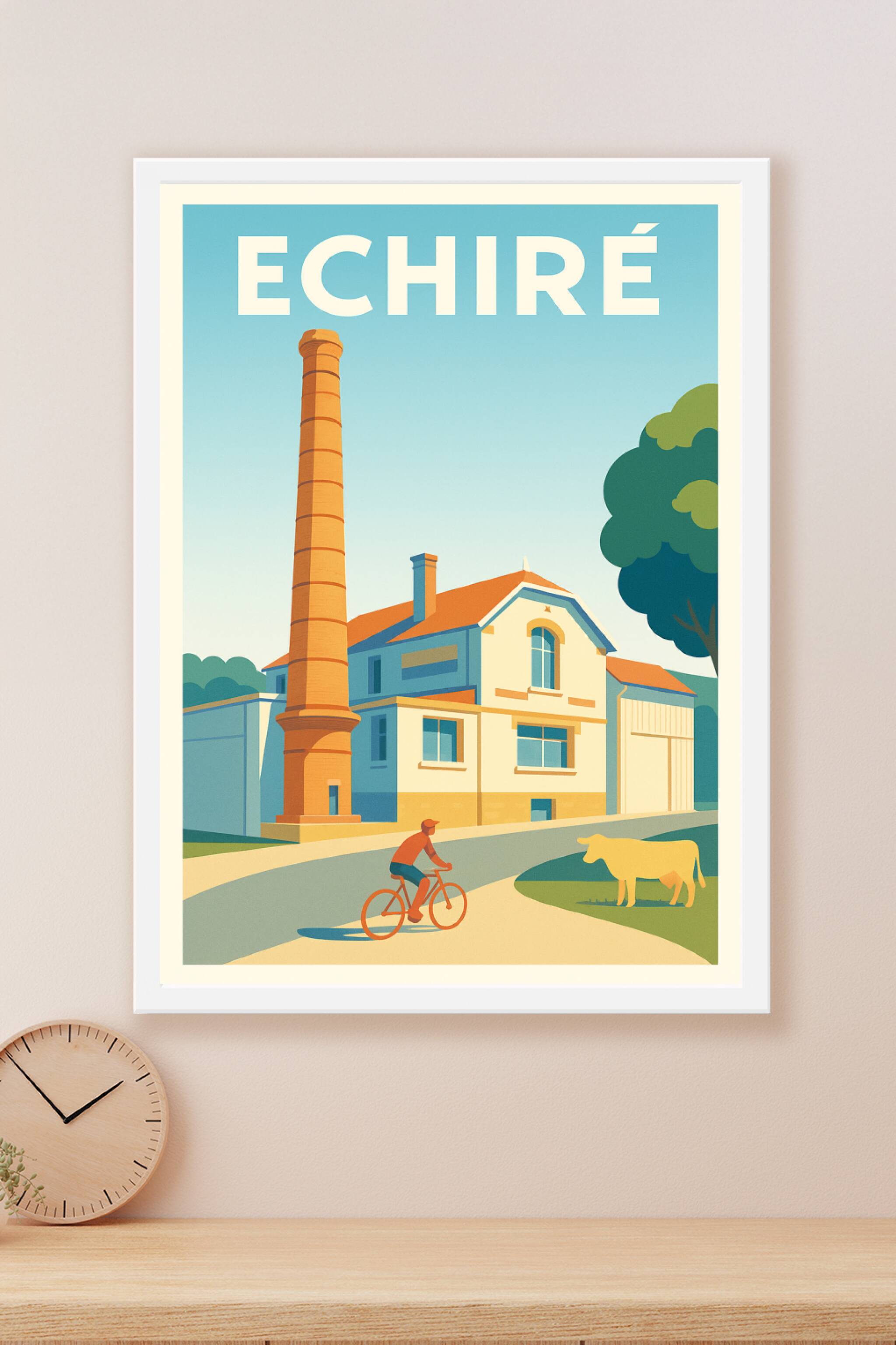 Découvrez l'atmosphère paisible et authentique d'Échiré à travers cette affiche illustrée mettant en scène un bâtiment historique au charme unique, avec sa haute cheminée de briques et une ambiance bucolique renforcée par la présence d'un cycliste et d'une vache. Ce poster est imprimé en tirage "Fine Art" sur papier 305g coton, garantissant une qualité d'impression supérieure et une durabilité remarquable. Disponible en formats A1 à A4, avec ou sans cadre, cette affiche apportera une touche élégante et conviviale à votre intérieur. Parfaite pour les amoureux des paysages ruraux et du patrimoine français, elle est 100% fabriquée en France pour sublimer votre décoration ou faire un cadeau raffiné.