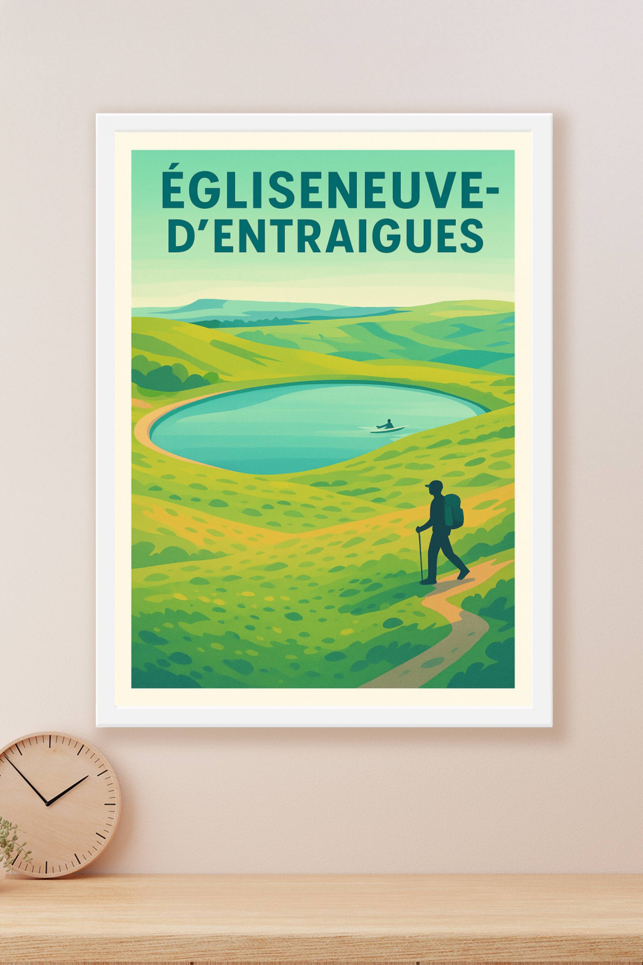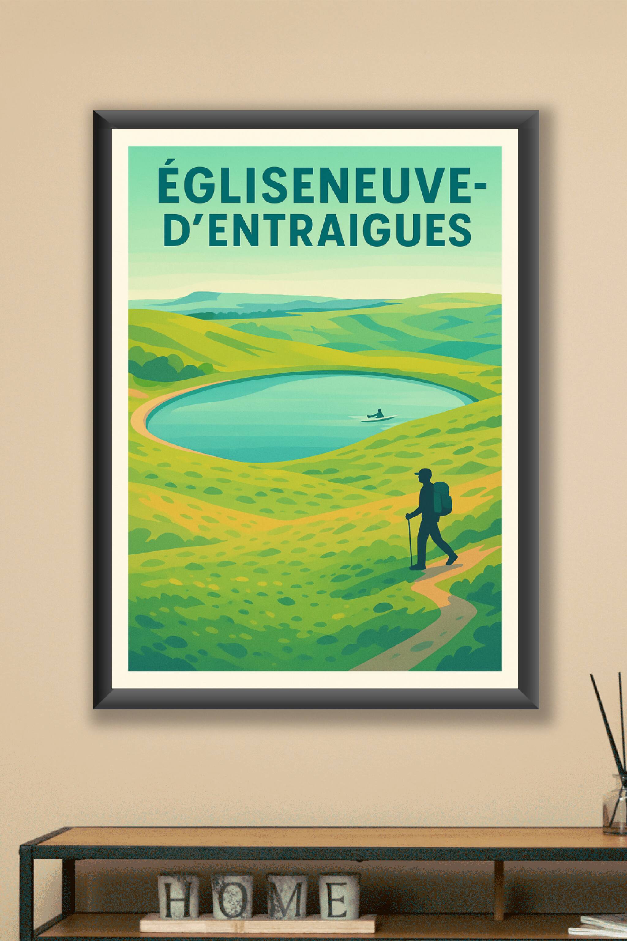 Découvrez l'évasion au cœur des paysages vallonnés d'Égliseneuve-d'Entraigues avec cette affiche illustrée qui capture la sérénité d'un lac entouré...