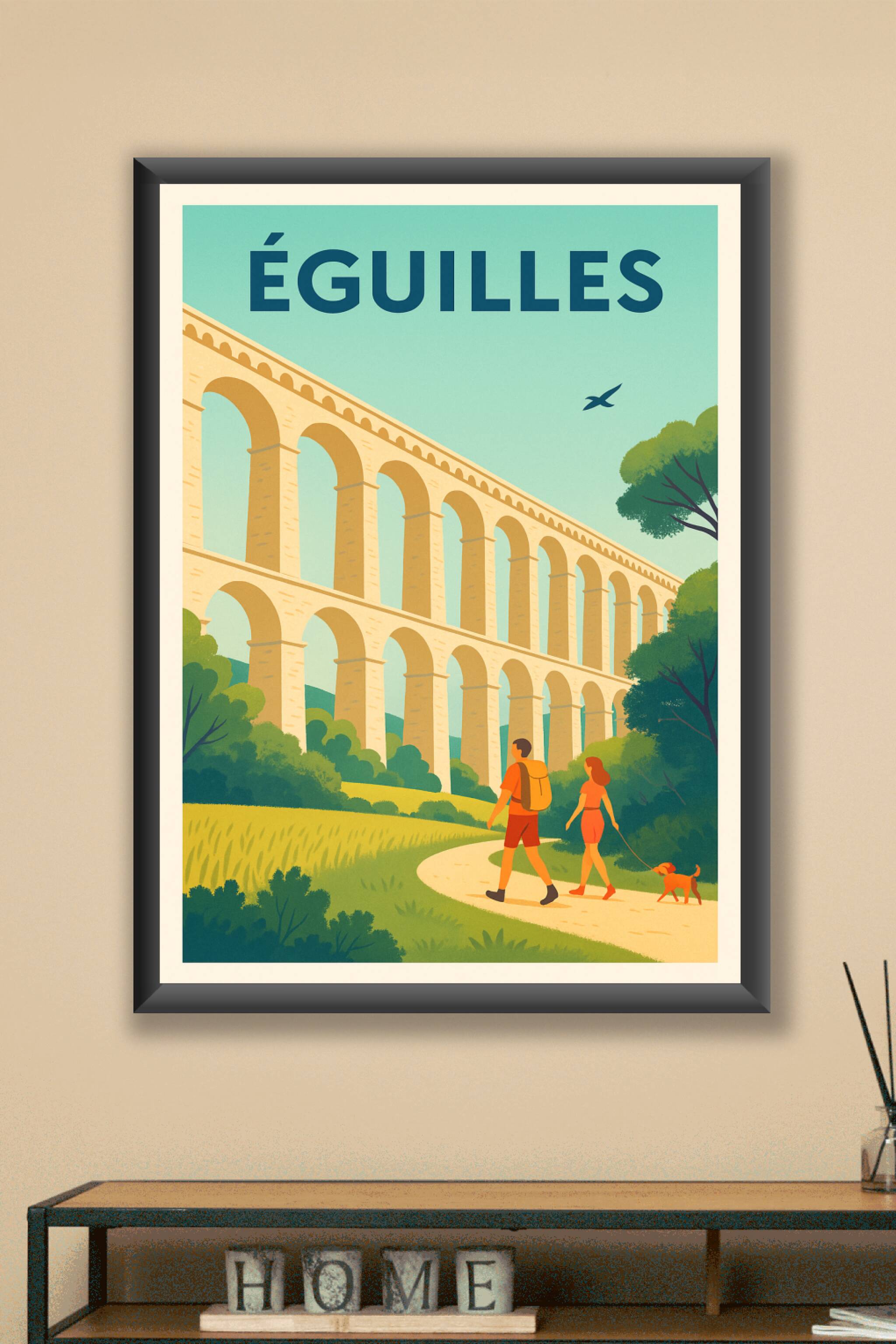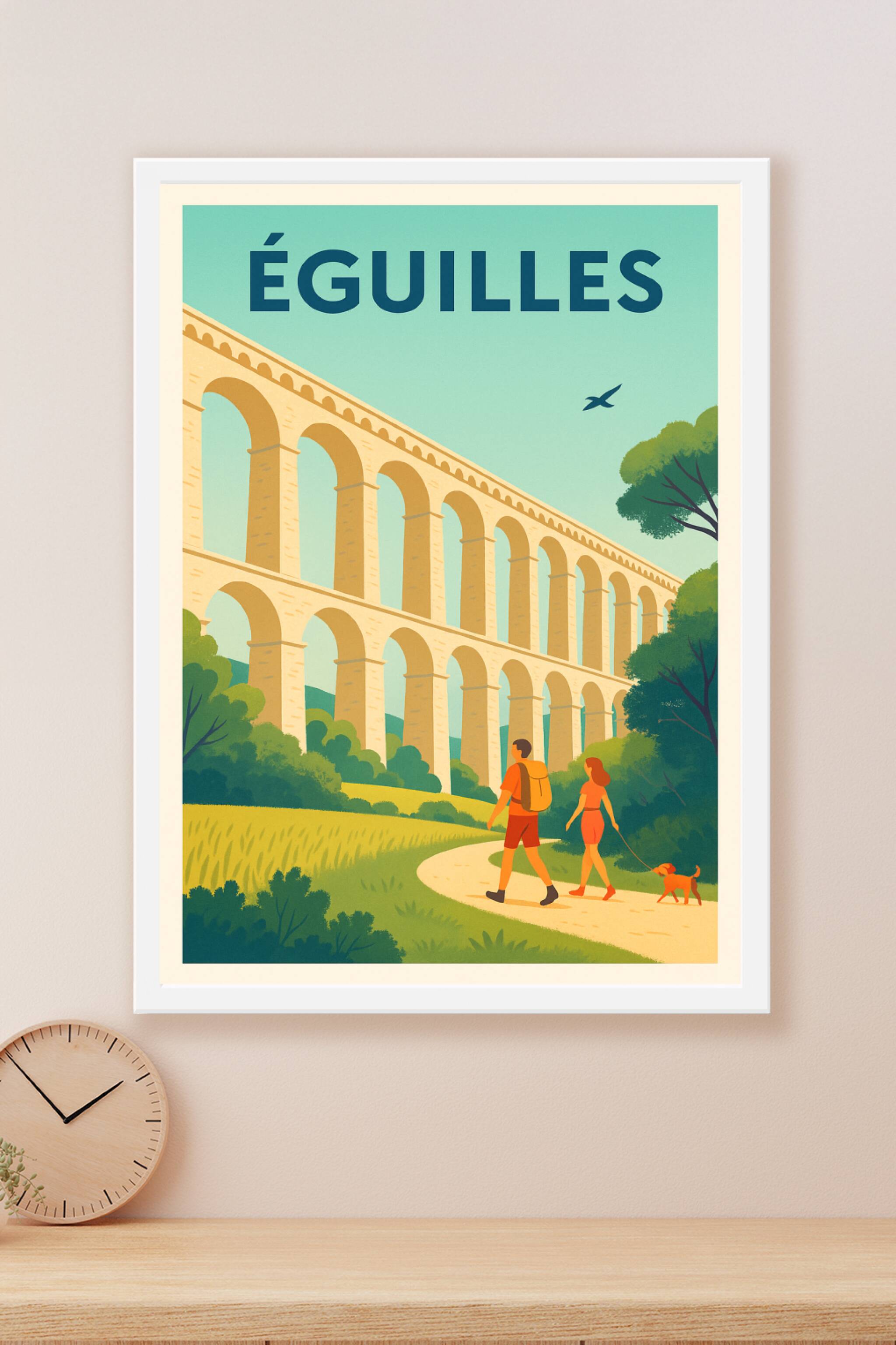 Découvrez la sérénité d'Éguilles avec cette magnifique affiche illustrée mettant en scène l'aqueduc emblématique de la ville et une agréable balade...
