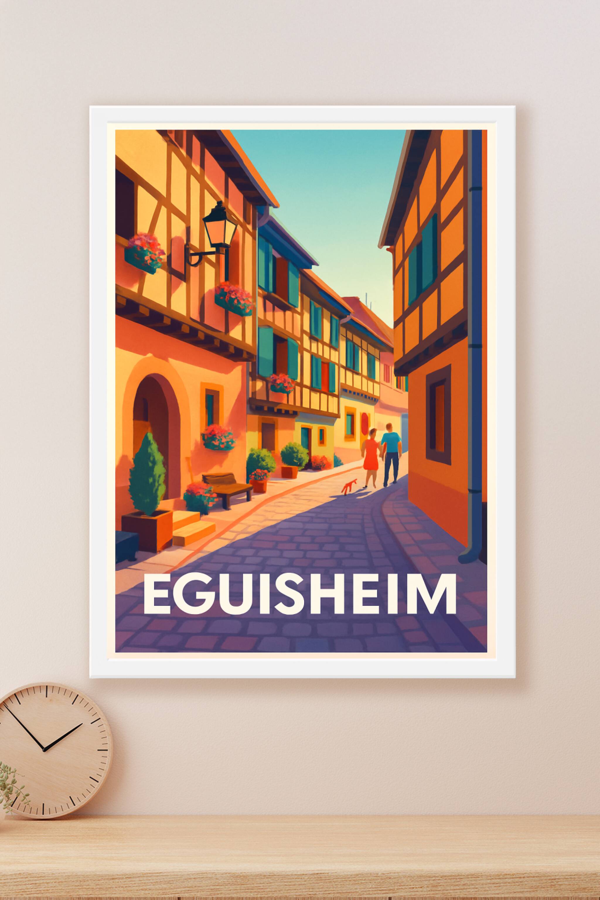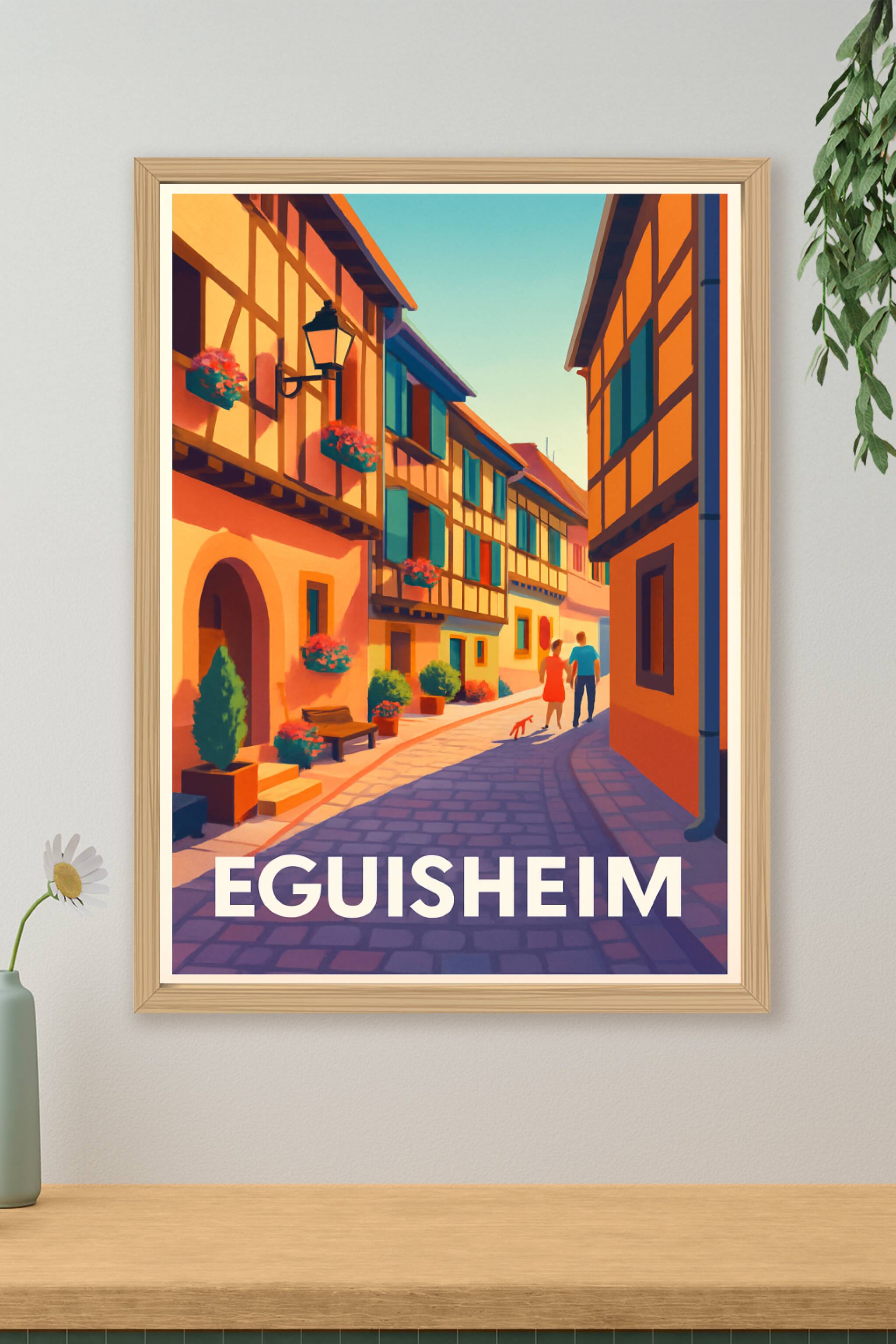 Découvrez l'authenticité et la douceur de vivre au cœur d'Eguisheim avec cette affiche illustrée mettant en valeur les ruelles pavées et les maison...