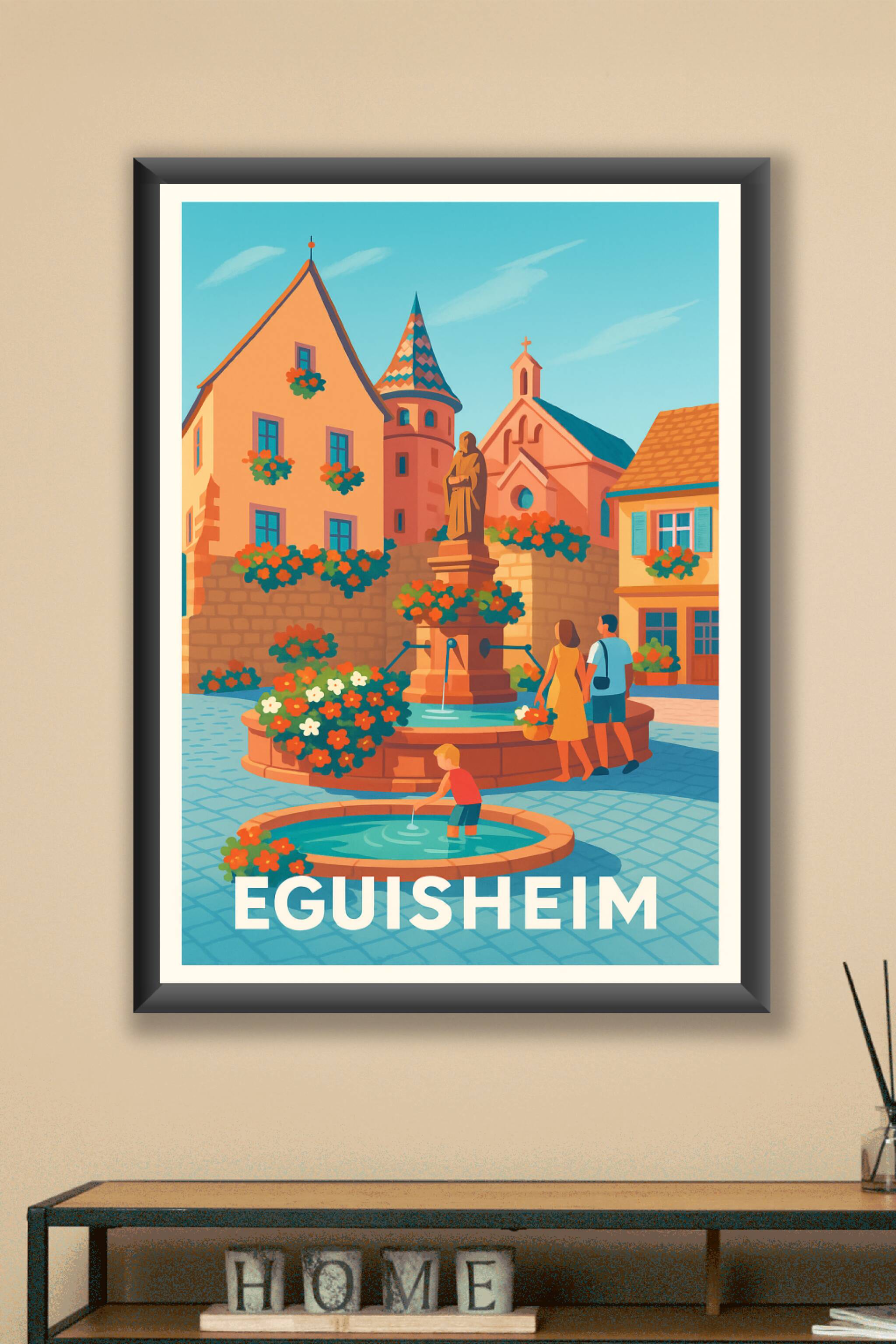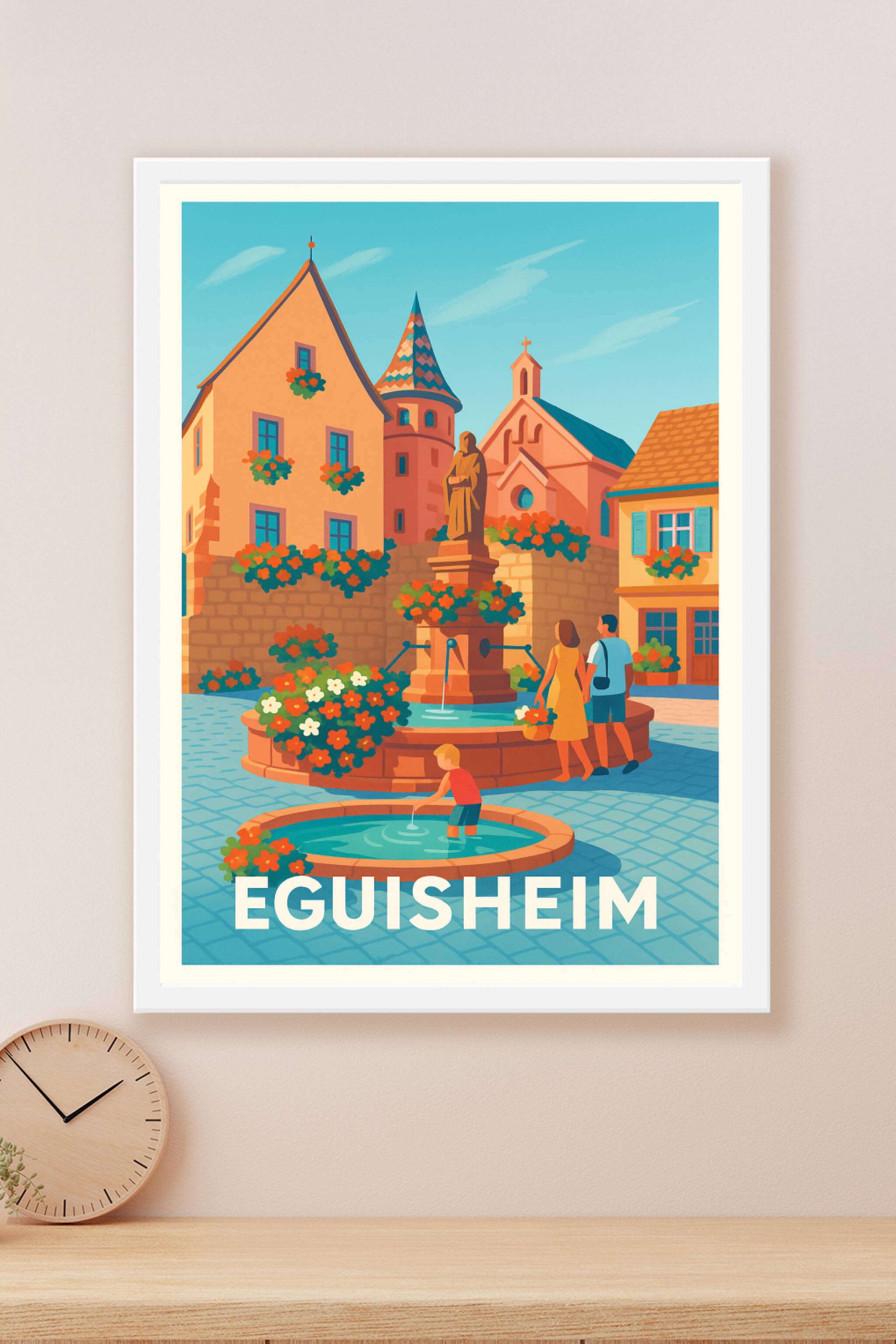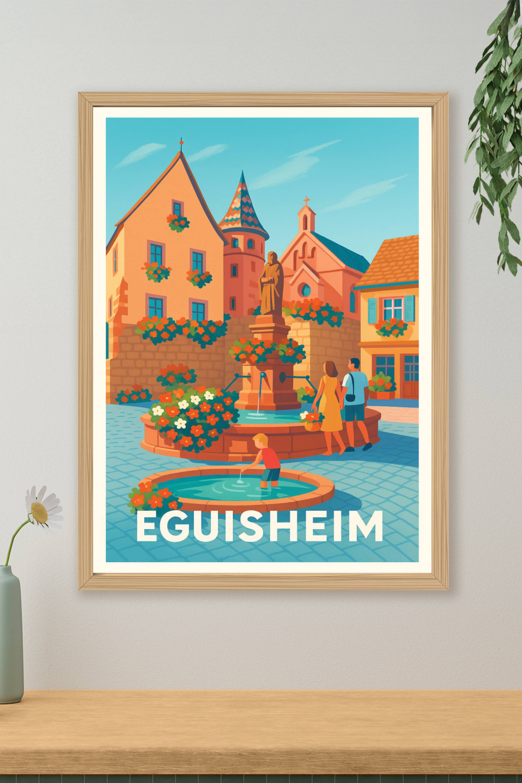 Découvrez l'élégance et la douceur d'Eguisheim à travers cette affiche illustrée mettant en scène sa célèbre fontaine, ses façades colorées et ses ruelles fleuries typiques de l'Alsace. Capturez l'ambiance paisible et authentique de ce village pittoresque avec ce poster unique, idéal pour apporter une touche chaleureuse à votre décoration intérieure. Disponible en tirage "Fine Art" sur papier 305 g coton de grande qualité, ce poster est proposé en différents formats allant de A1 à A4, avec ou sans cadre selon vos envies. Offrez-vous une œuvre imprimée en France, parfaite pour orner votre salon, bureau ou chambre avec une note d'art et d'histoire régionale.