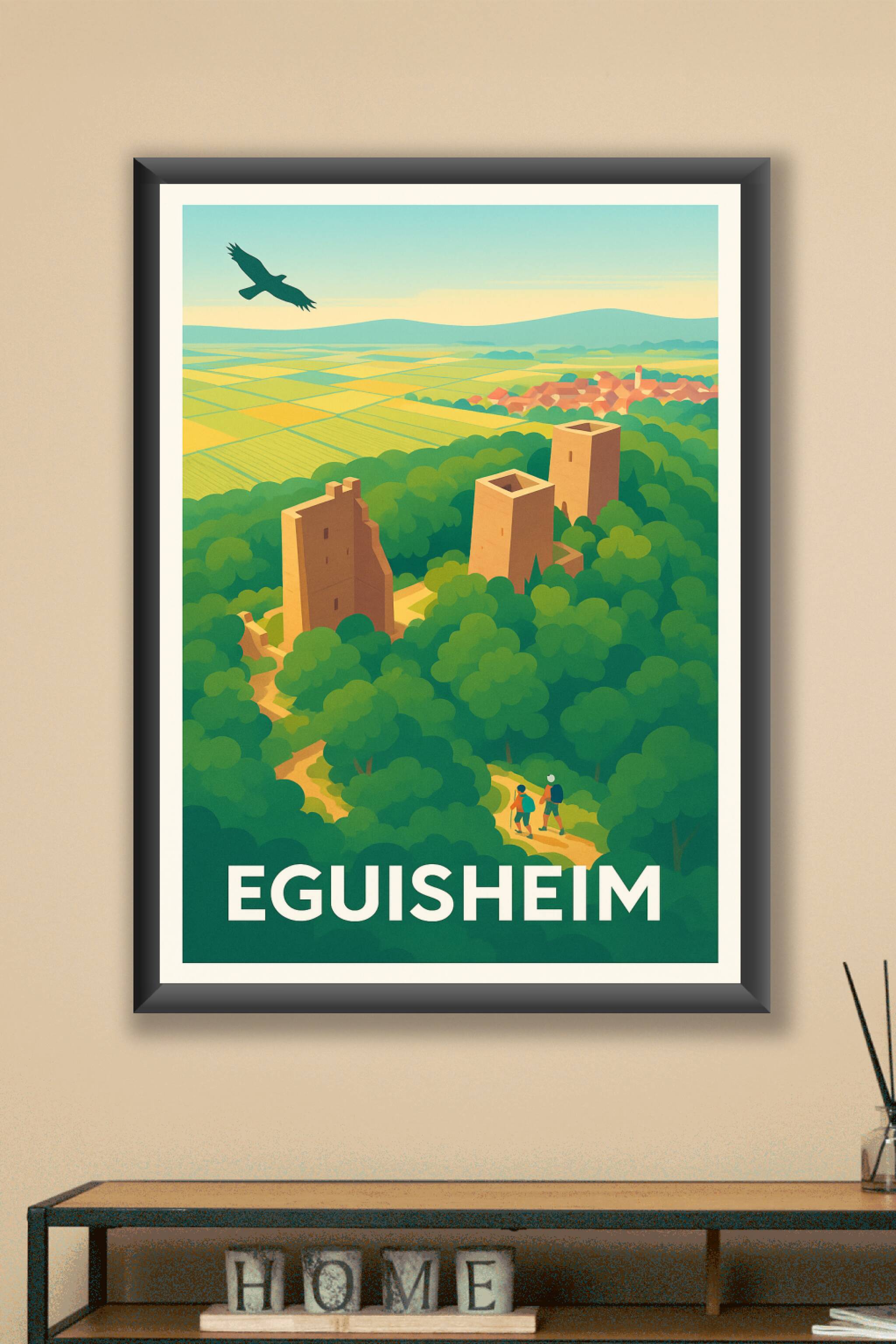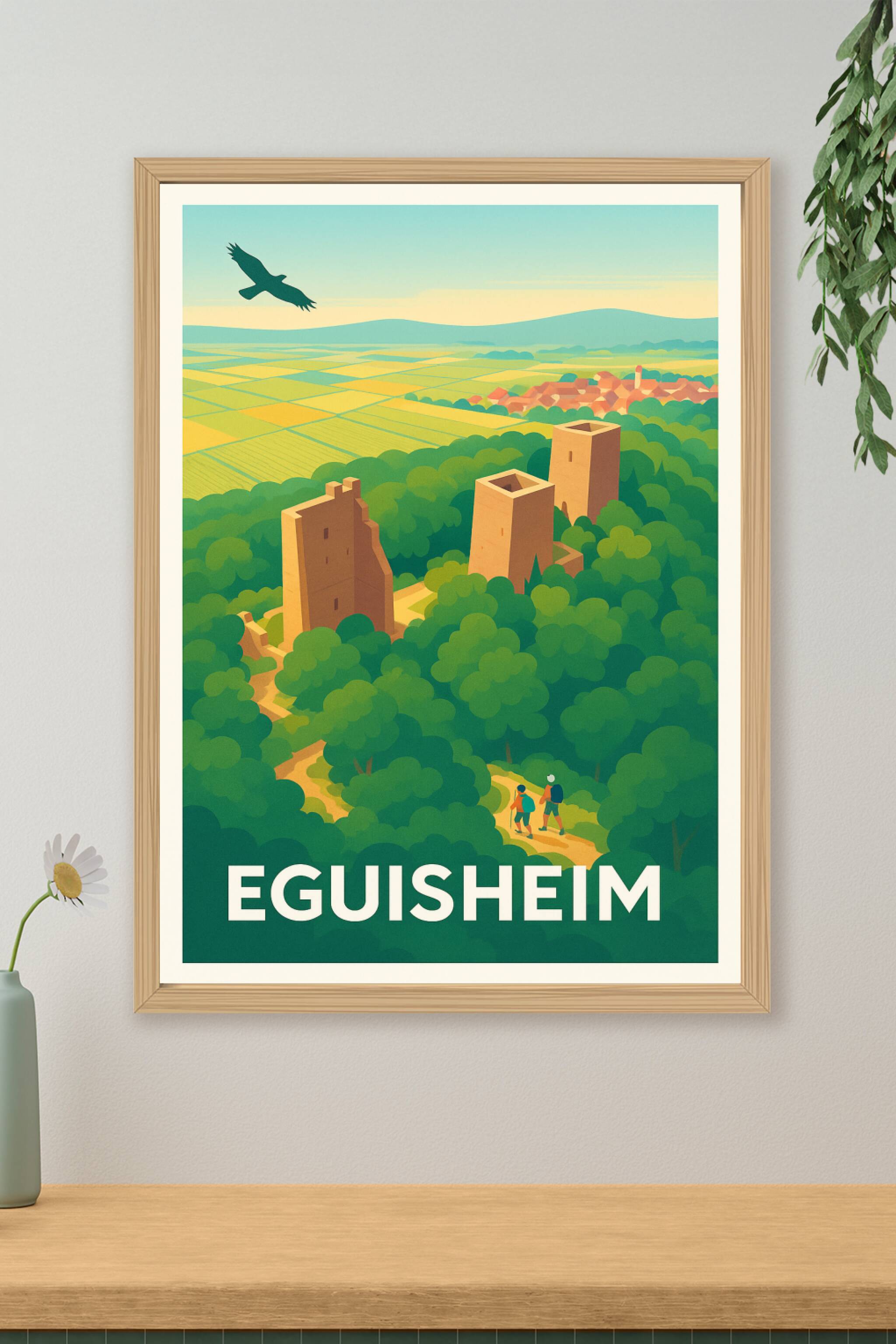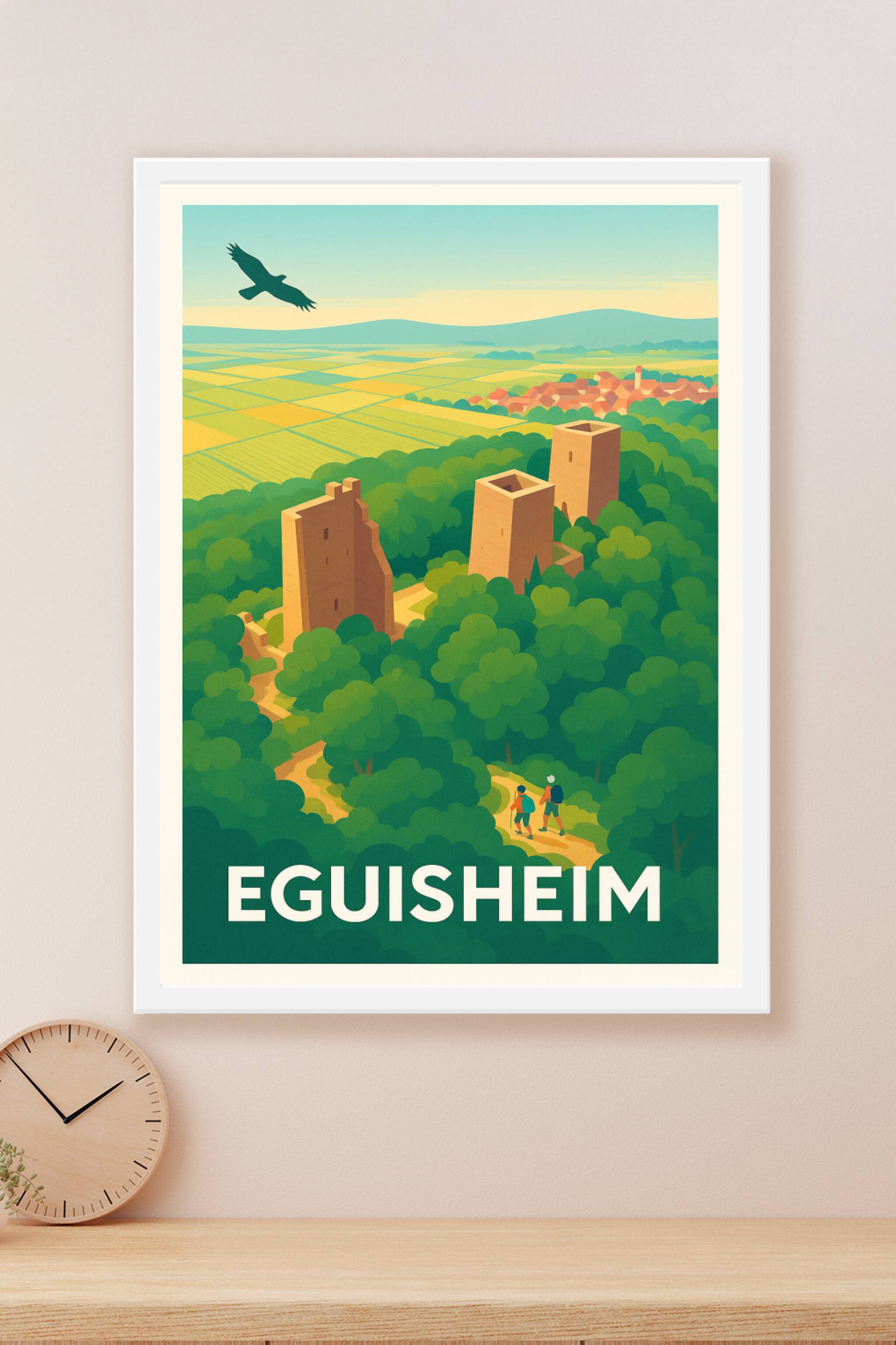 Découvrez la beauté bucolique et historique d'Eguisheim à travers cette affiche au design épuré et aux couleurs douces qui évoquent la campagne als...